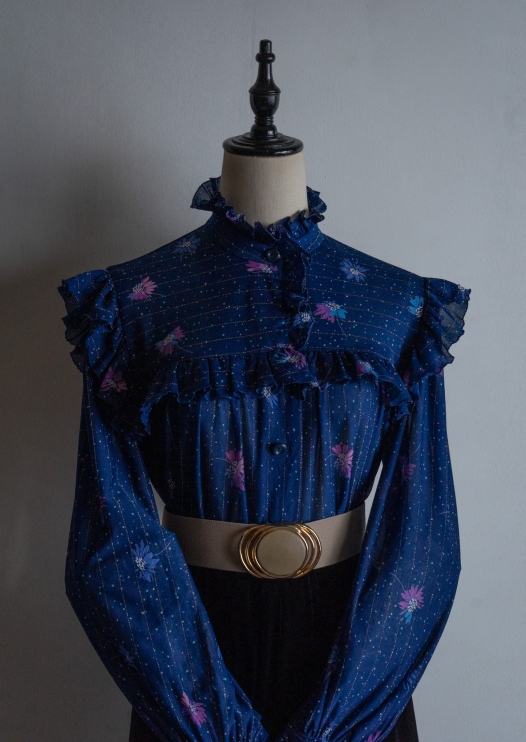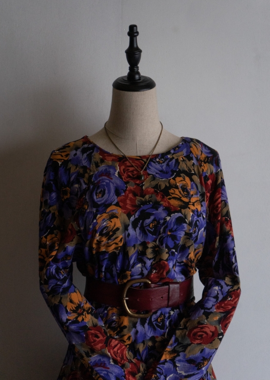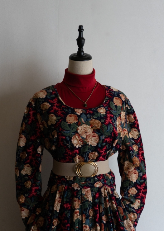 80's Rose Pattern Navy Corduroy Dress