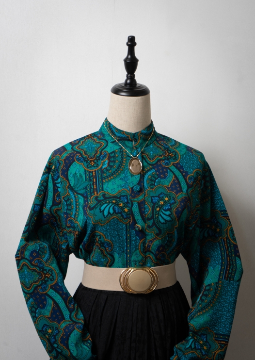80~90's Stand Collar Paisley Pattern Turquoise Blue Blouse