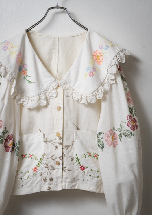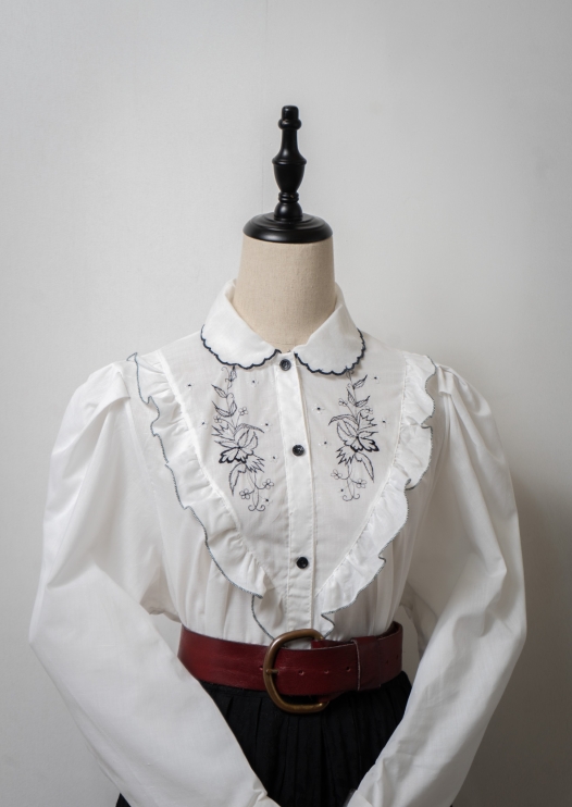 70~80's Frill Design Flower Embroidery White Blouse