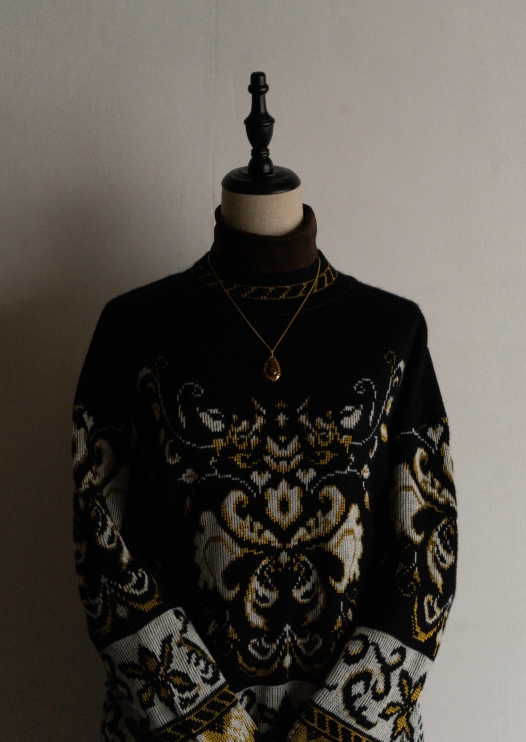 80's Damask Like Pattern Black Sweater