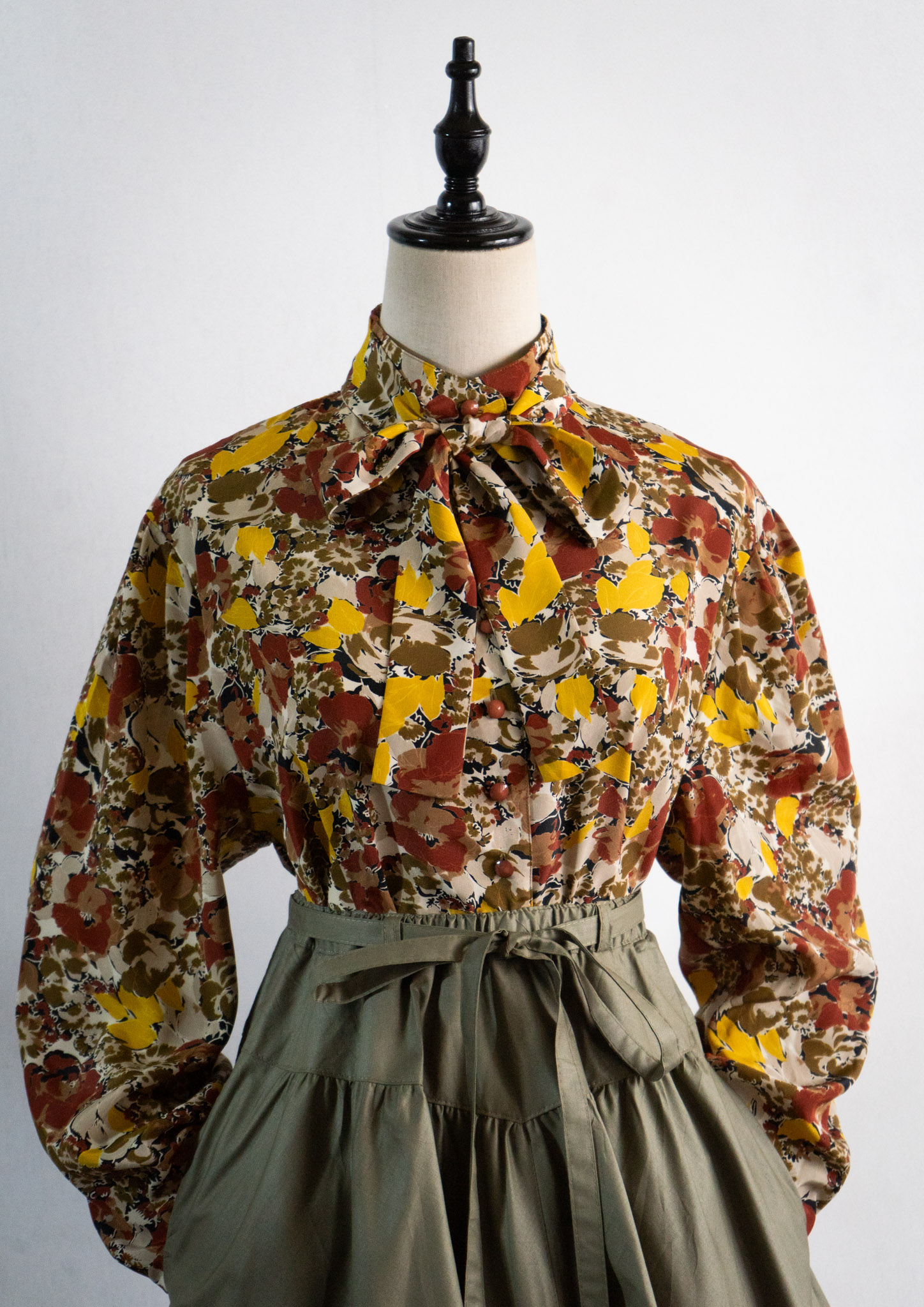 80's Euro Autumn Color Flower Pattern Bow-tie Blouse