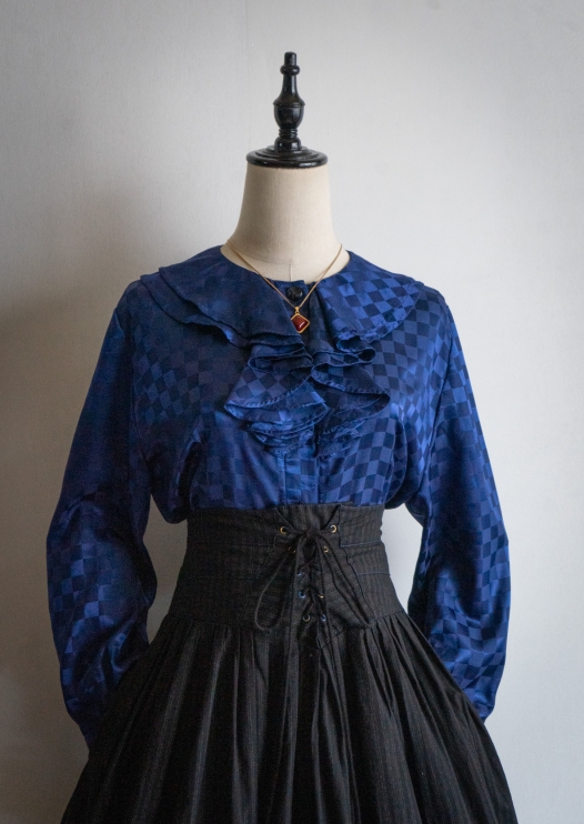 80's Jabot Like Collar Glossy Block Check Pattern Navy Blouse