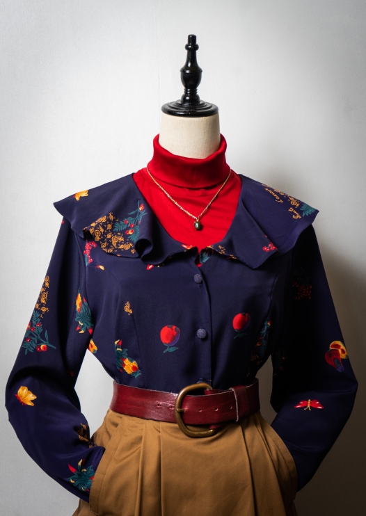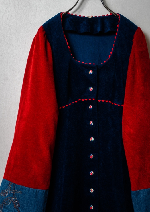 60~70's USA Flower Button Design Red ×Blue Pattern Tops