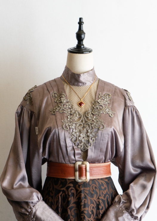 80's W-Germany Flower Lace × Bijou Design Glossy Khaki Blouse