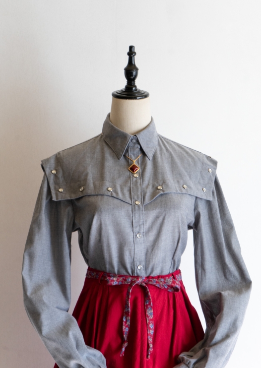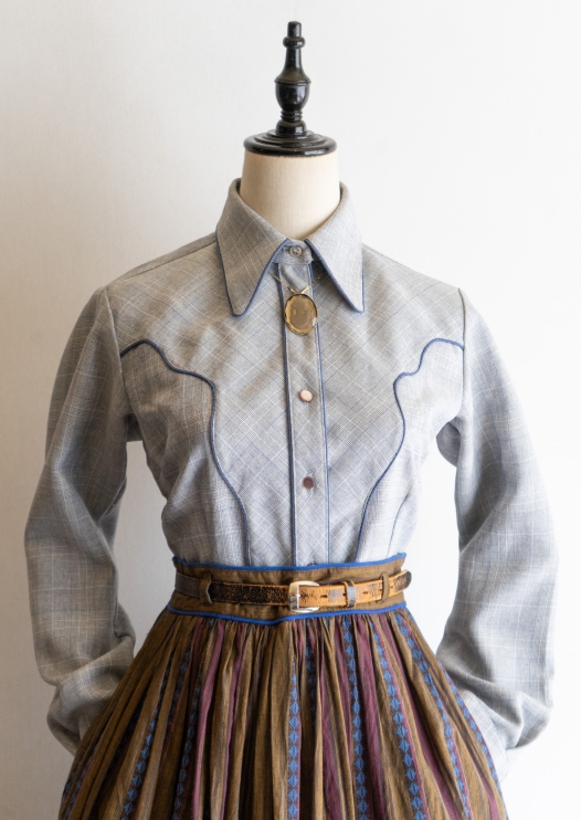 70's USA Navy Check Pattern Light Gray Western Blouse