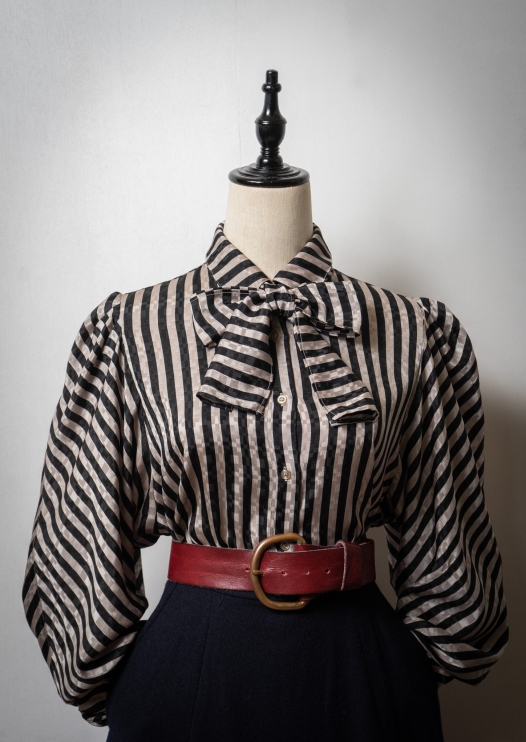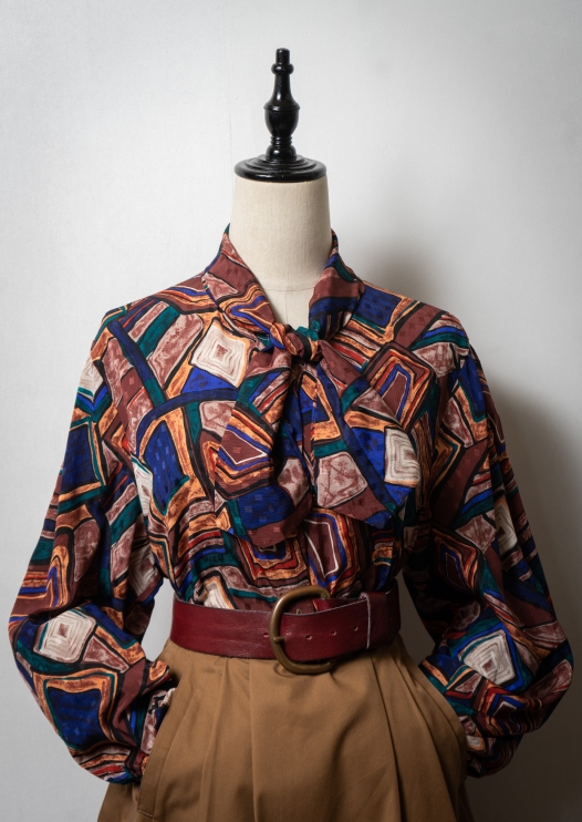 80's Euro Mosaic × Stripe Glossy Bow-Tie Blouse