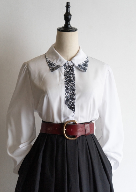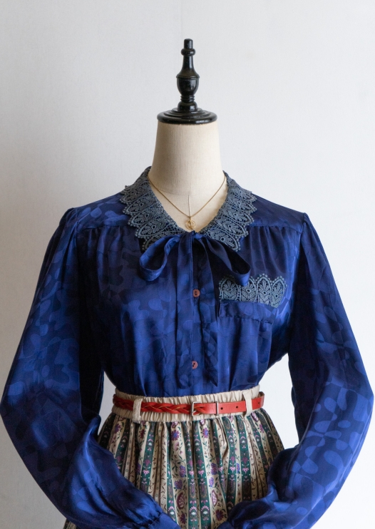90's Lace Collar Glossy Navy Bow-tie Blouse