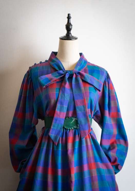 80's France Brown × Blue Houndstooth Pattern Puff Sleeve Blouse
