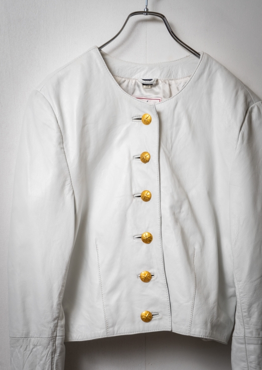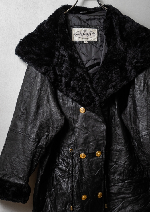 80's Double Gold Button × Fur Design Black Leather Jacket