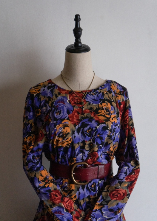 80~90's Flower Motif Pattern Glossy Beige Dress