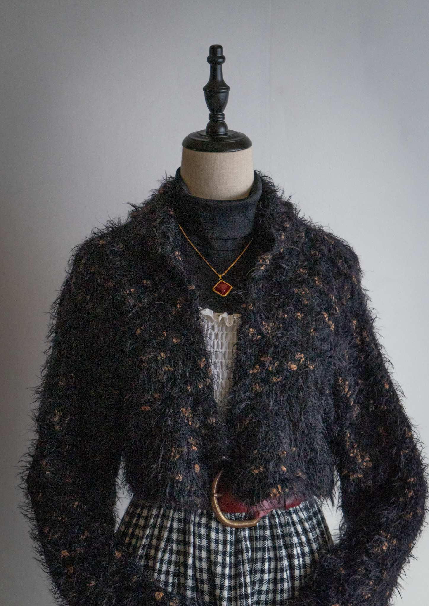 Point Brown Blend Black Shaggy Knit Cropped Cardigan