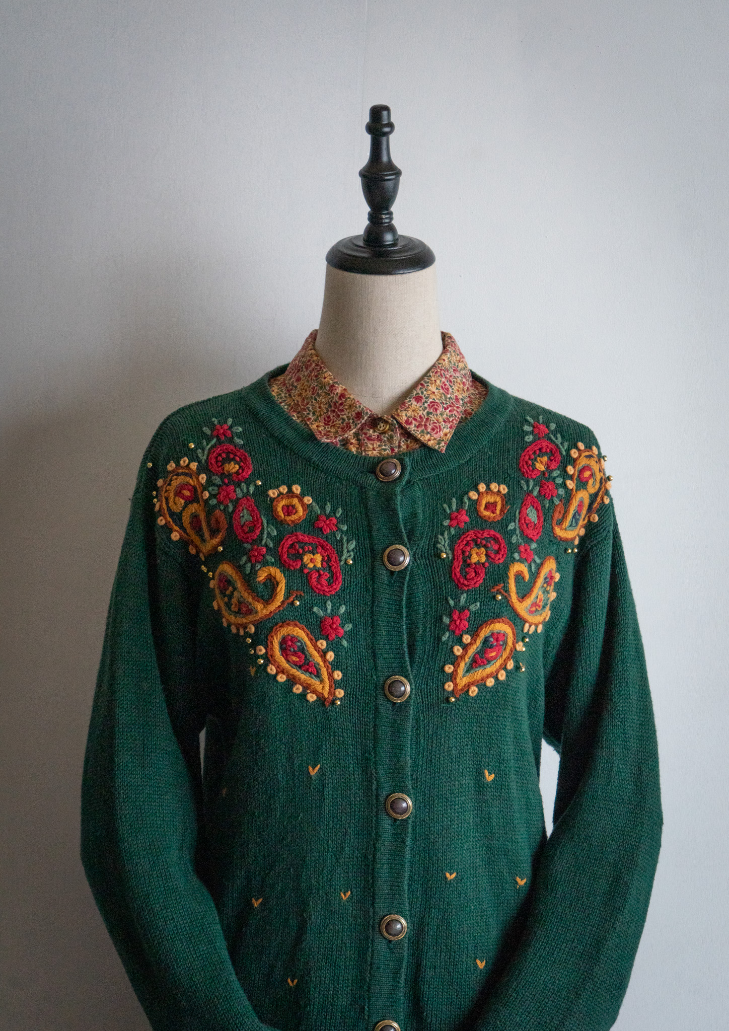 90’s Paisley Embroidery Dark Green Knit Cardigan