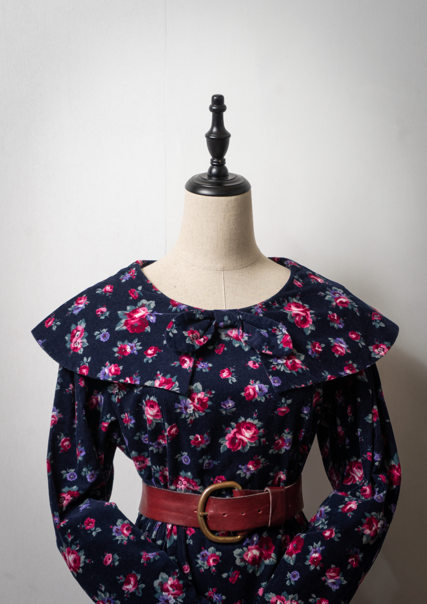 80's UK Laura Ashley Low Waist Design Flower Pattern Navy Corduroy Dress