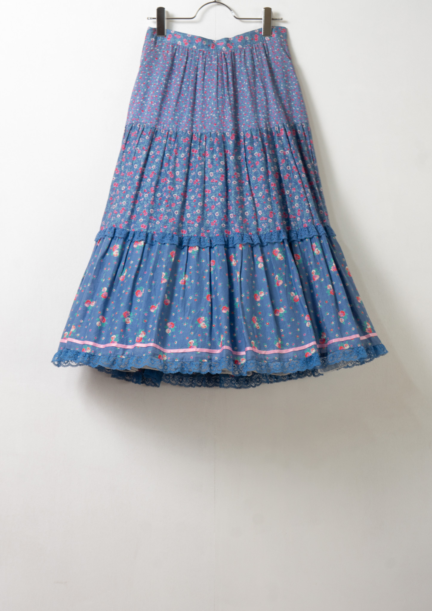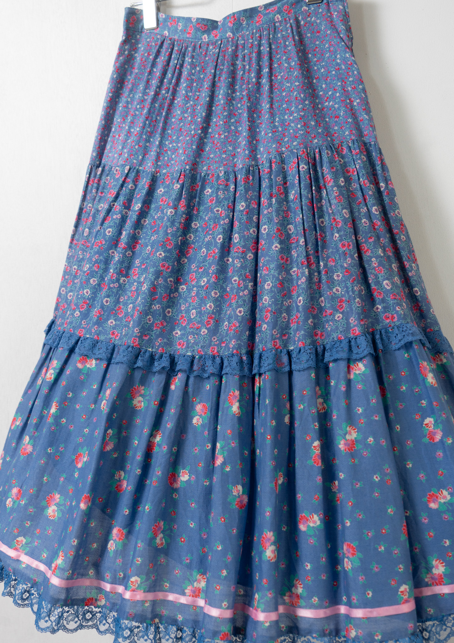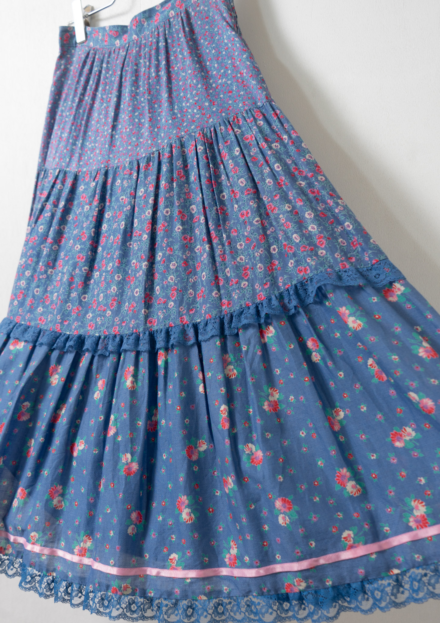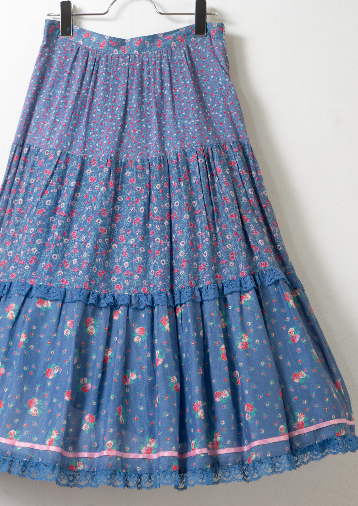 70's Euro Multi Flower Pattern Tiered Blue Skirt