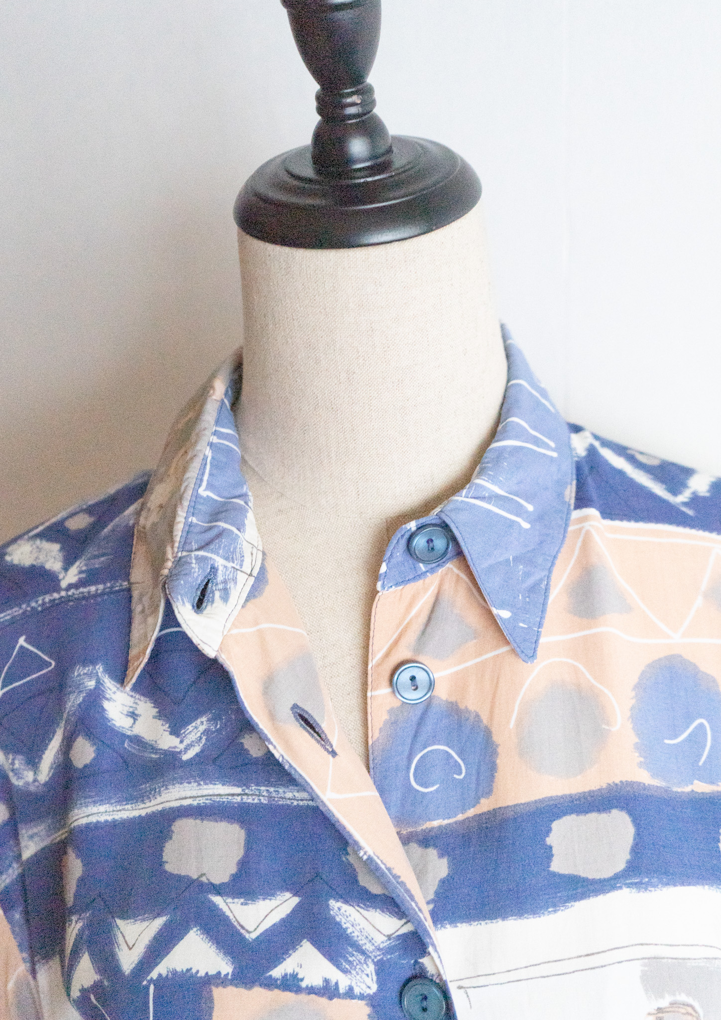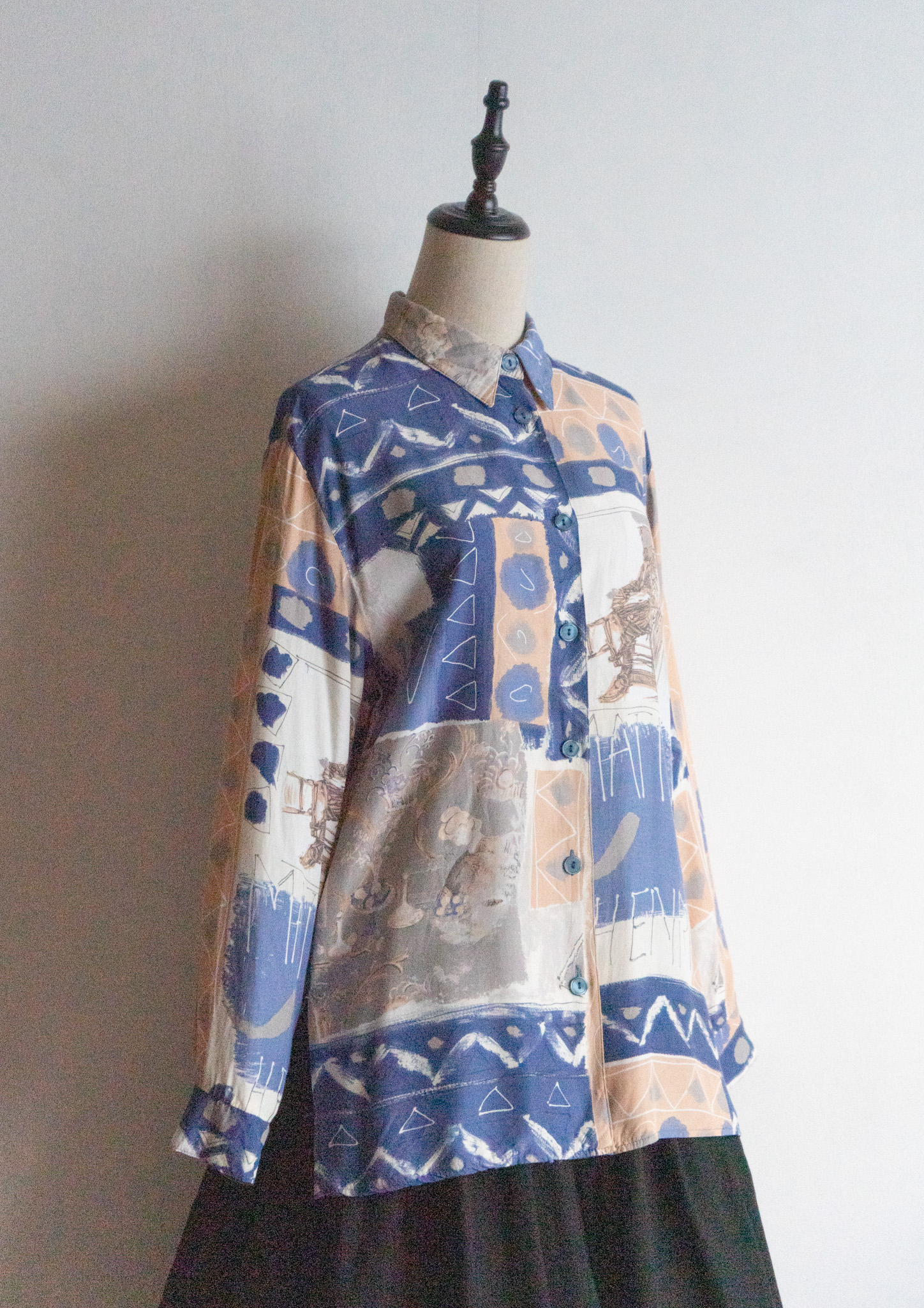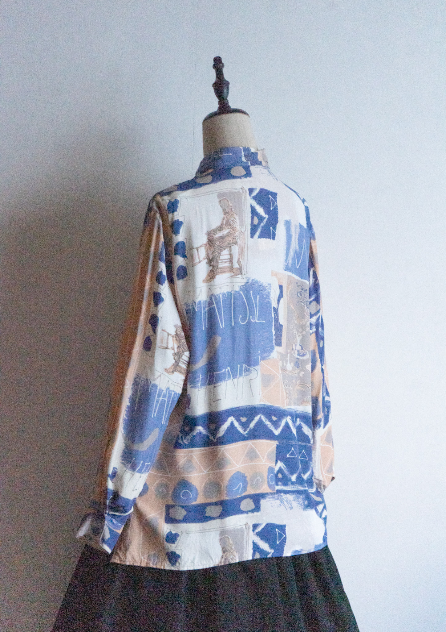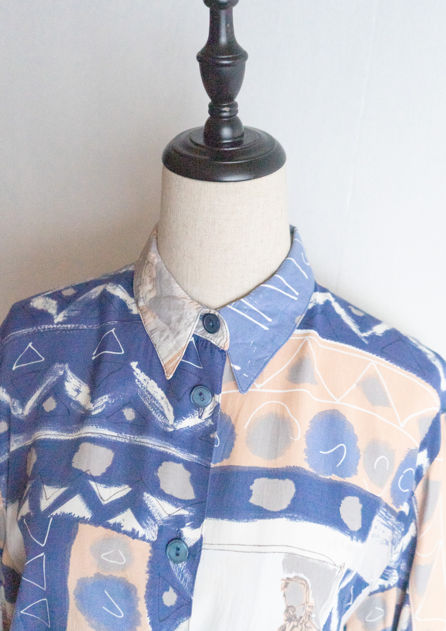 90's Smoky Blue × Beige Unique Art Pattern Over Blouse