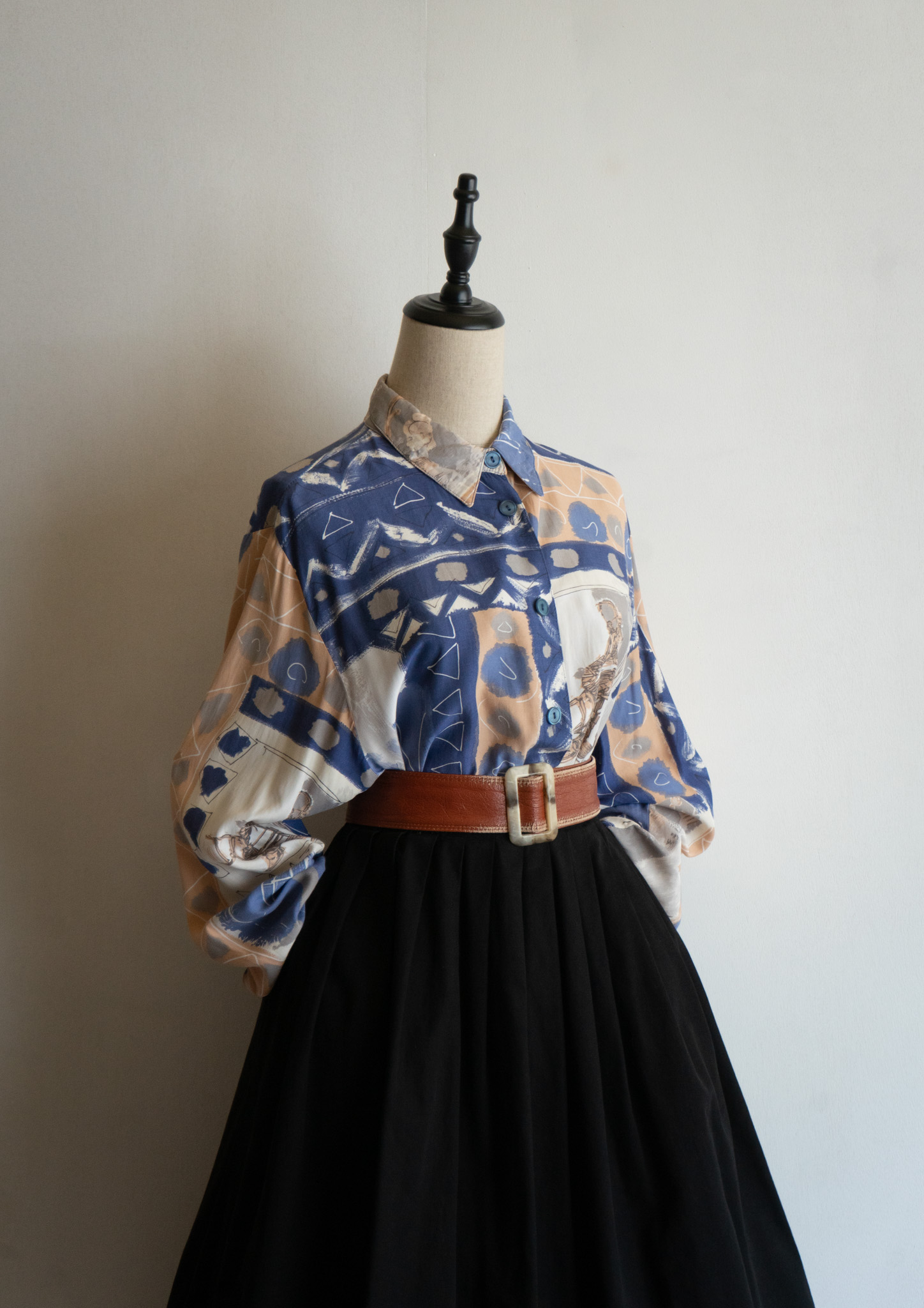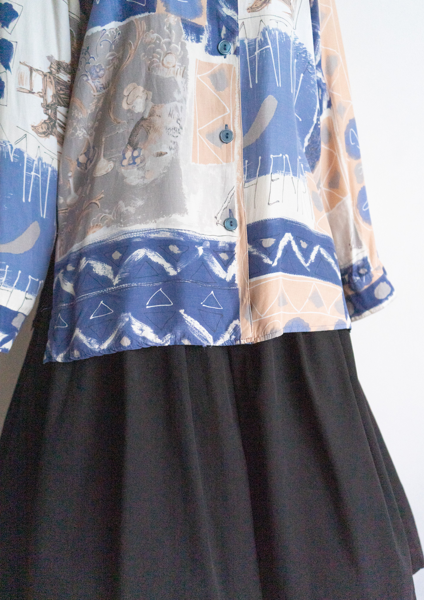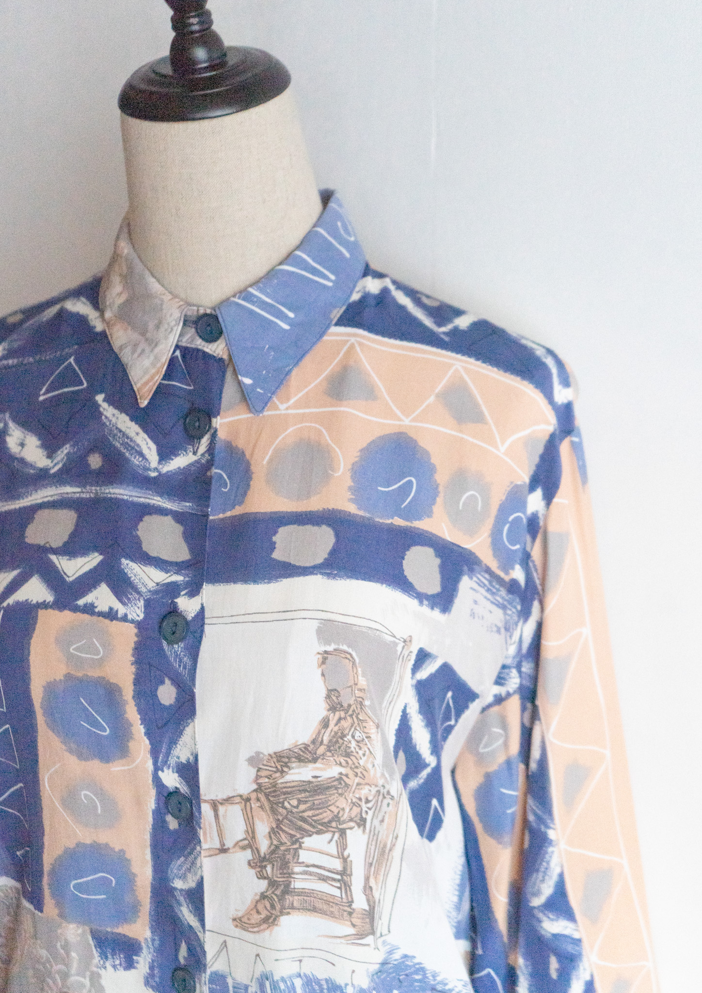 90's Smoky Blue × Beige Unique Art Pattern Over Blouse