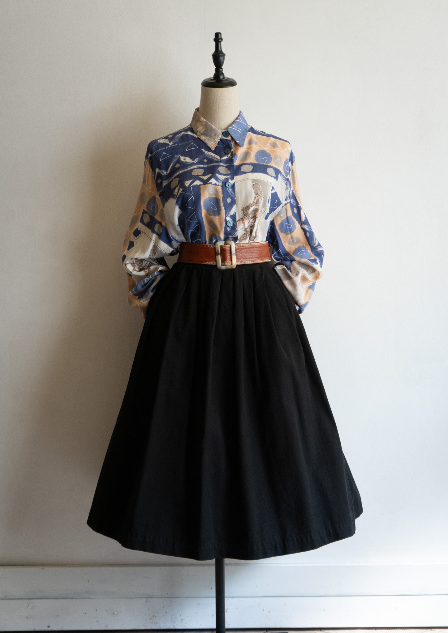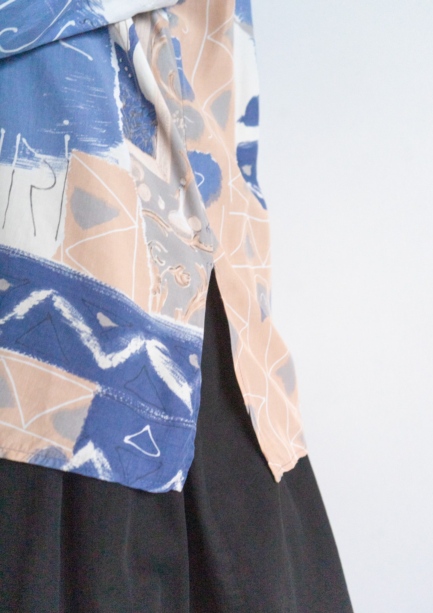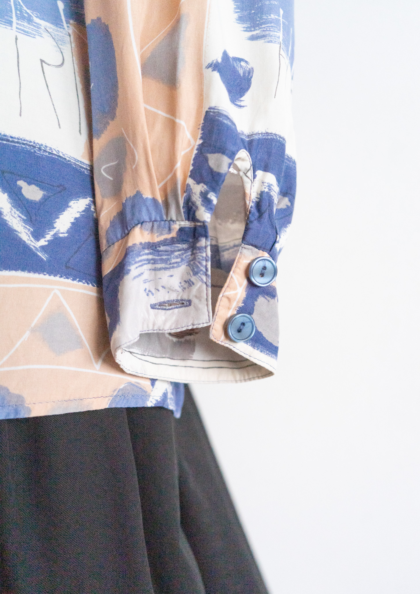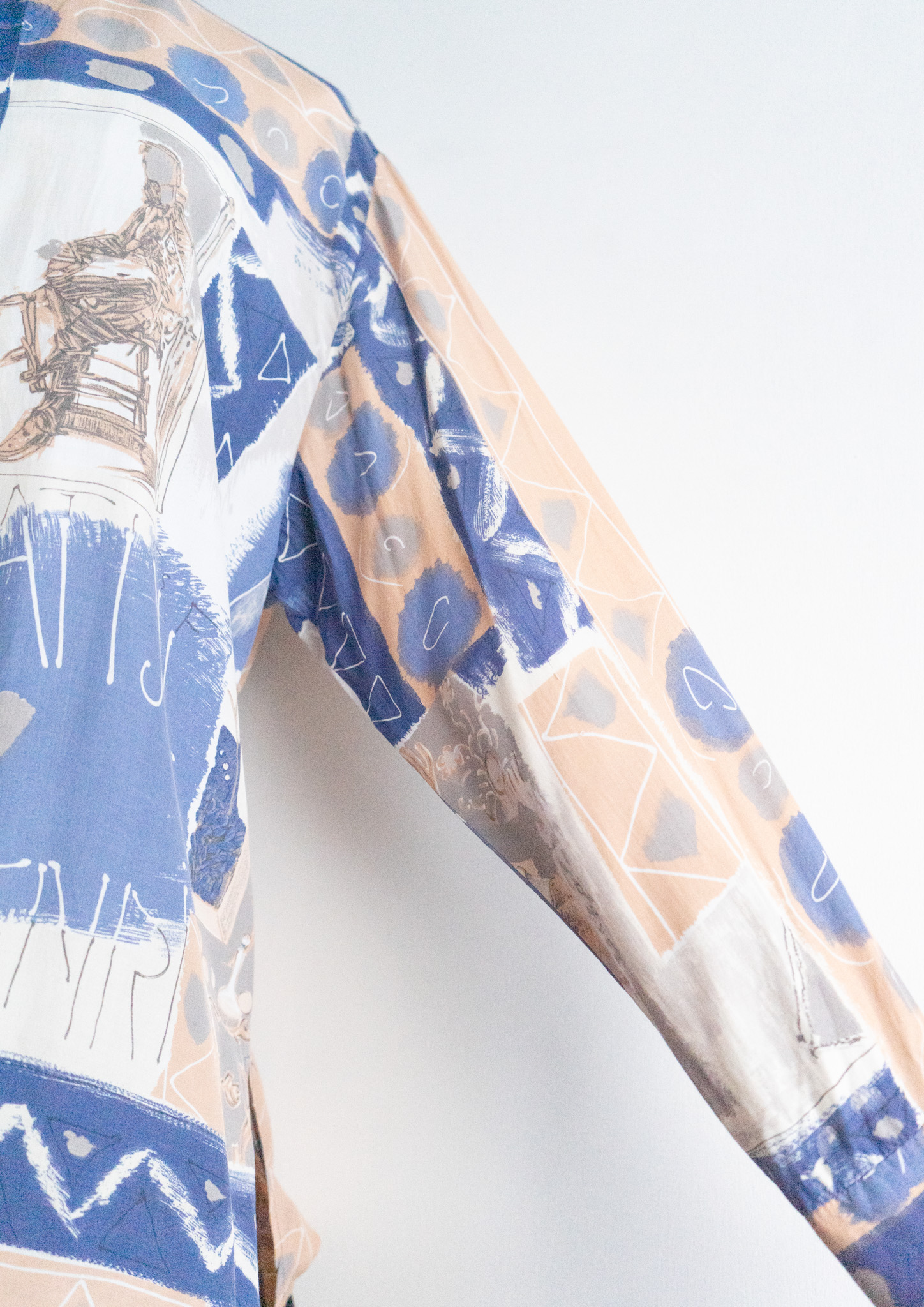 90's Smoky Blue × Beige Unique Art Pattern Over Blouse