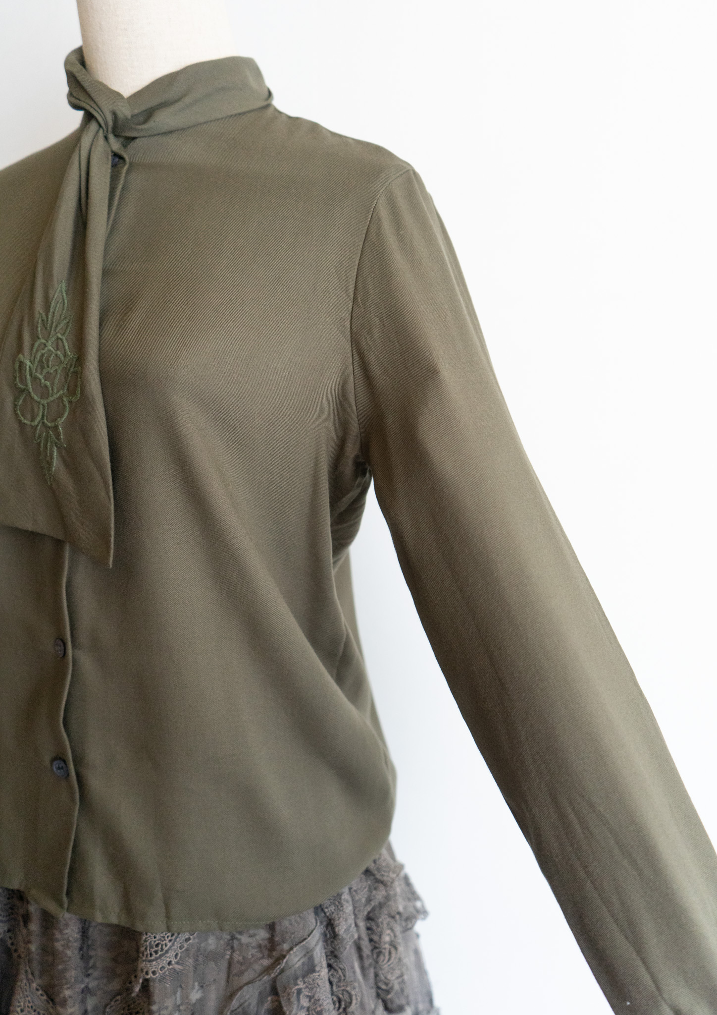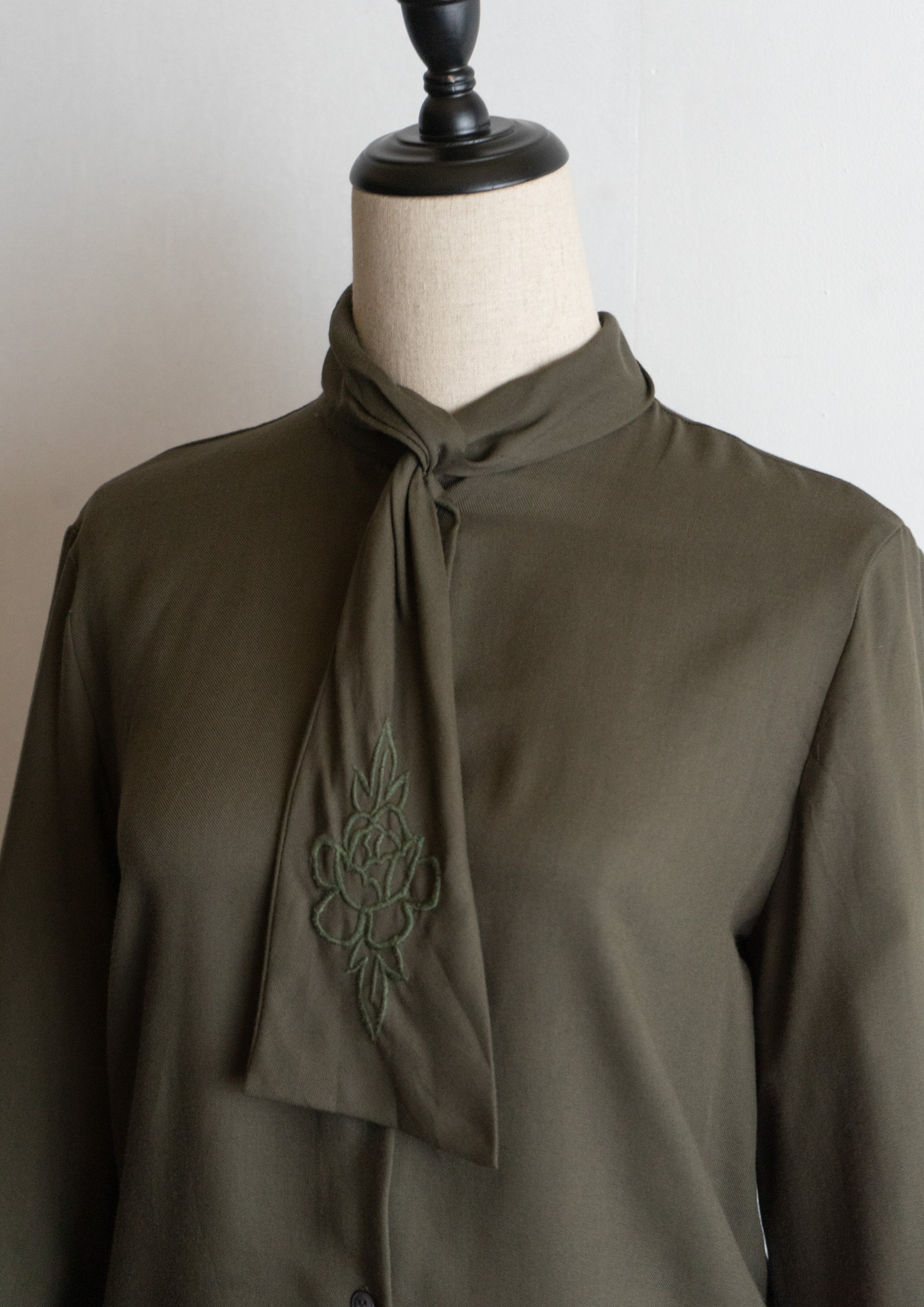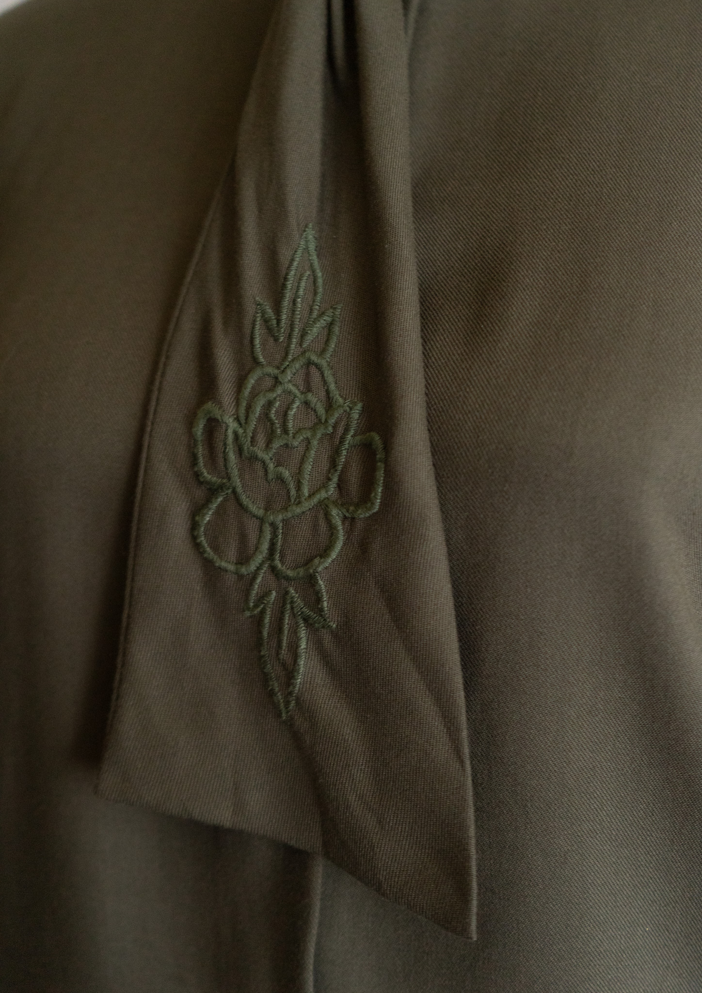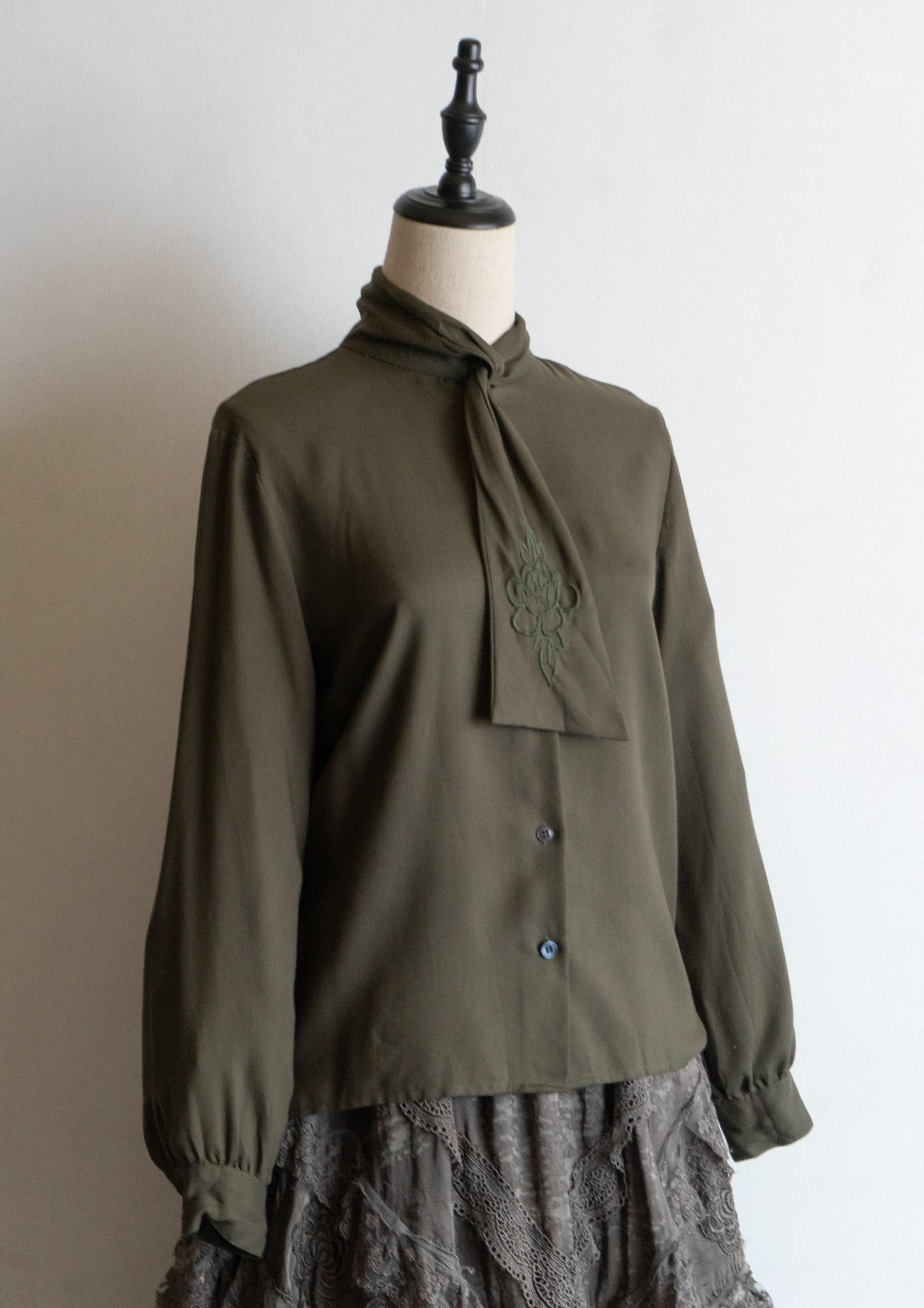 80's Flower Embroidery Bow tie Olive Blouse