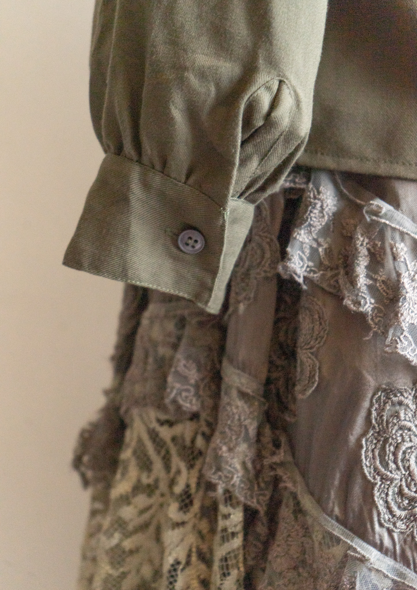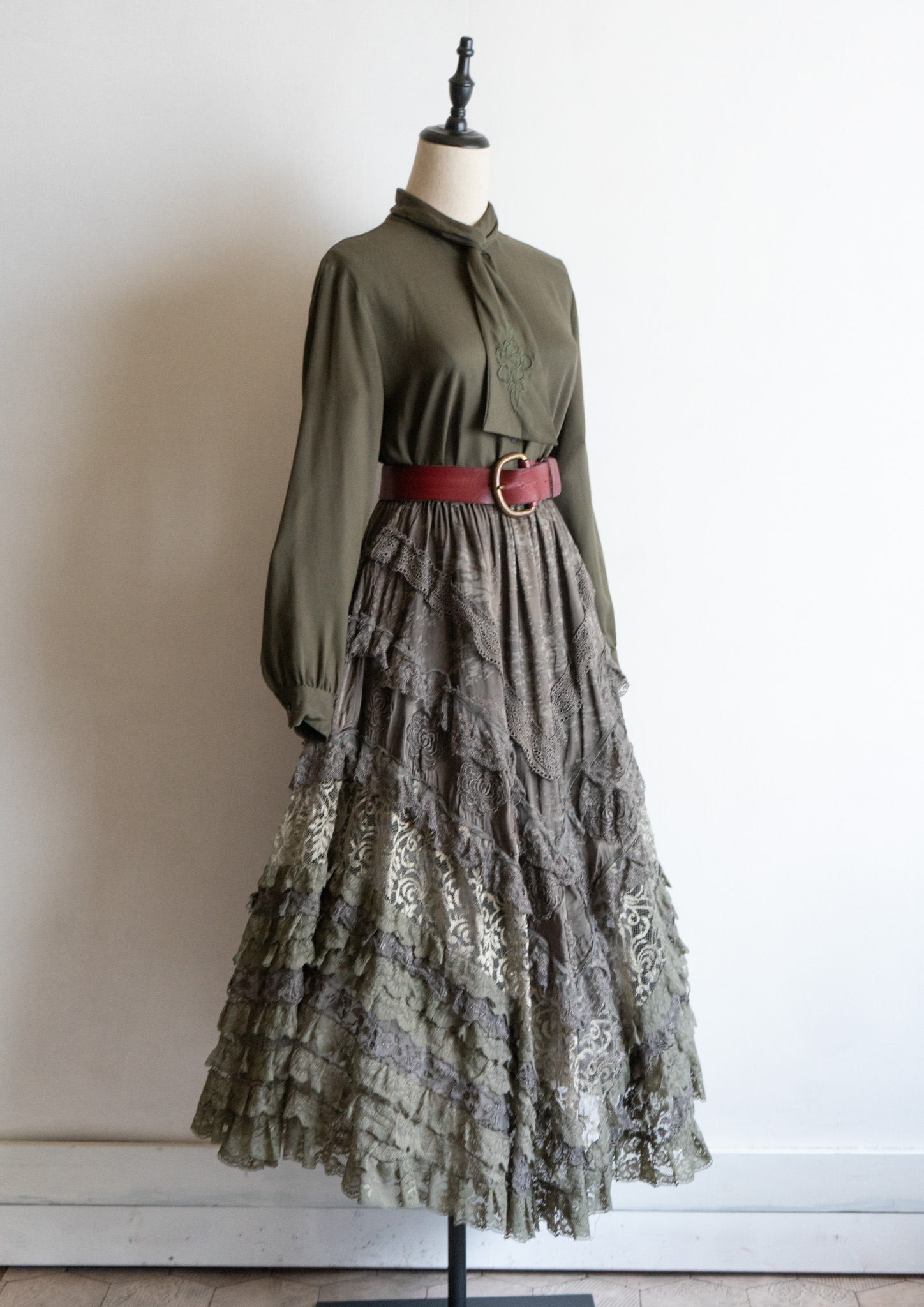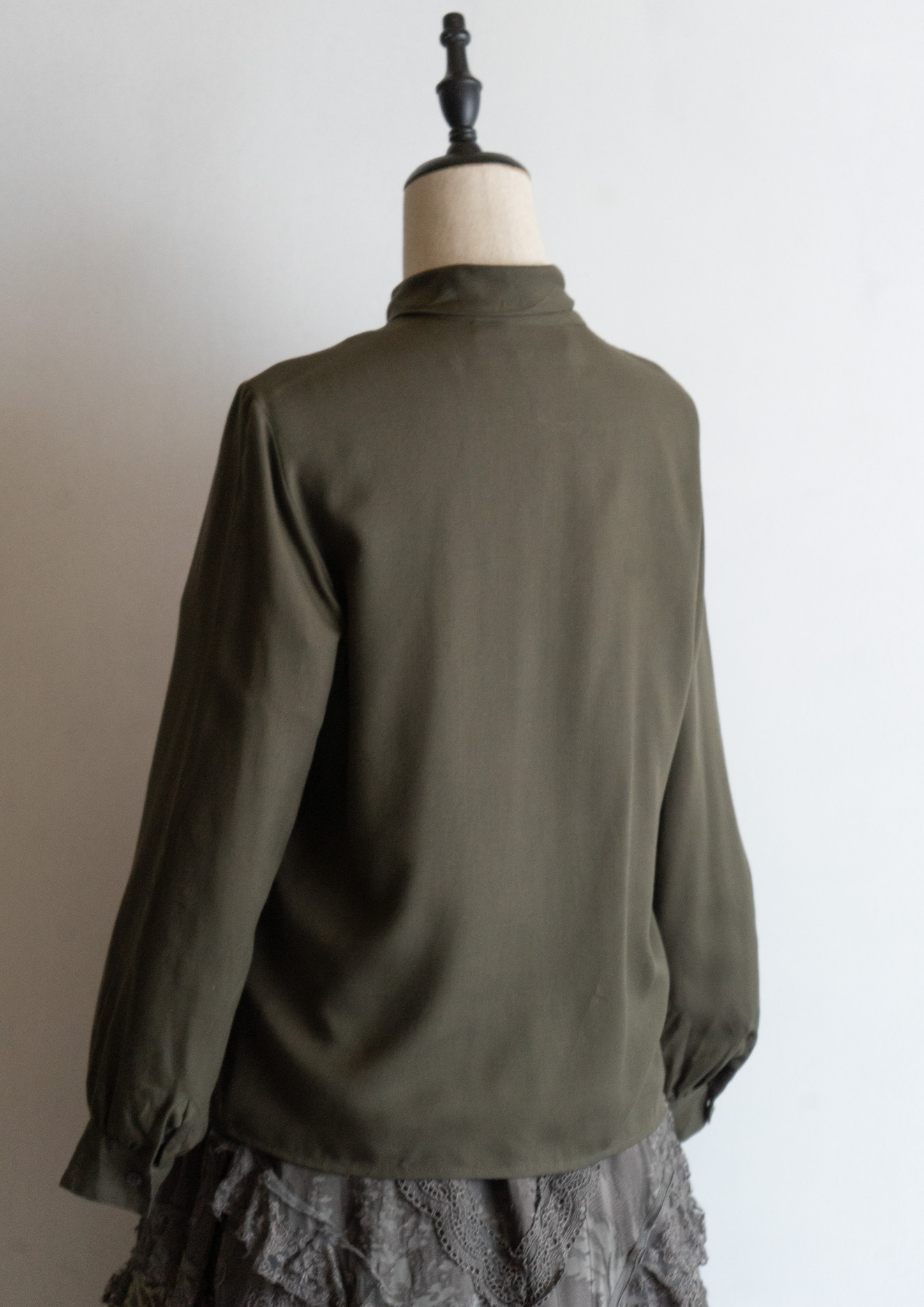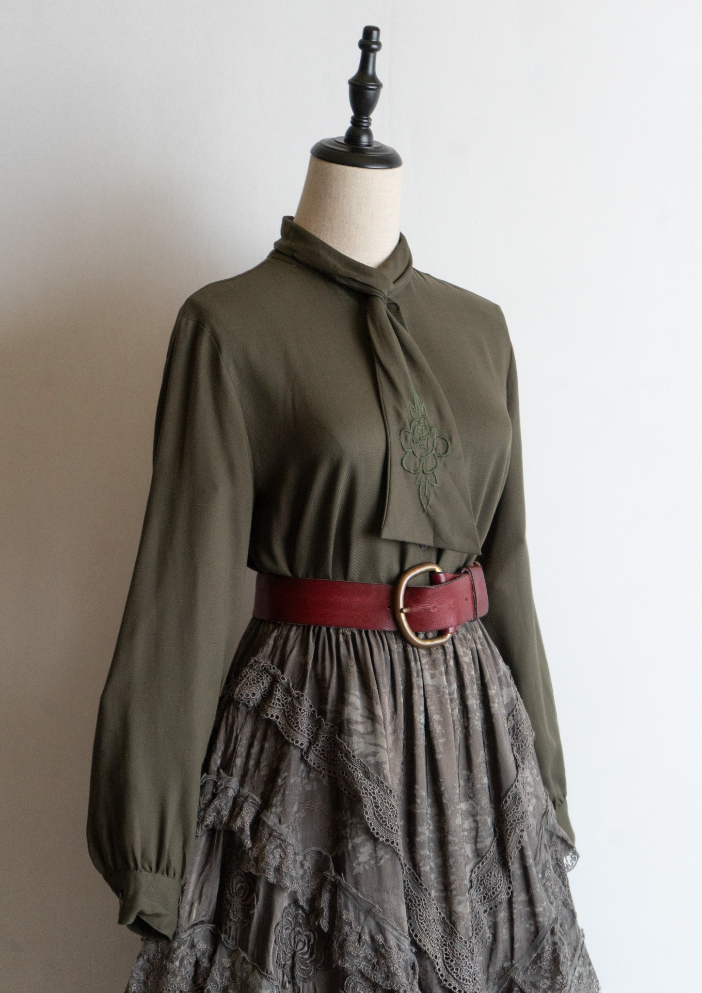80's Flower Embroidery Bow tie Olive Blouse