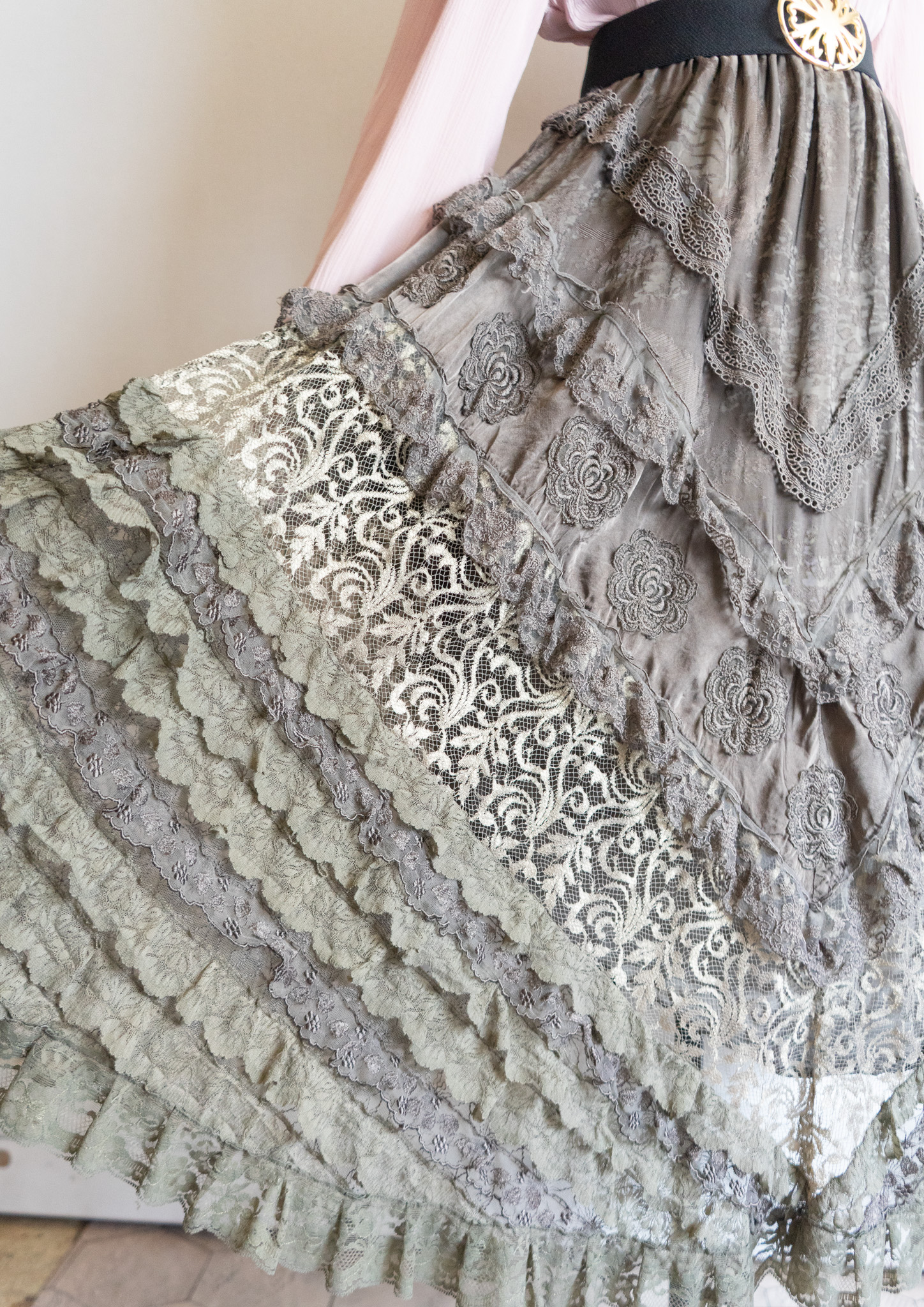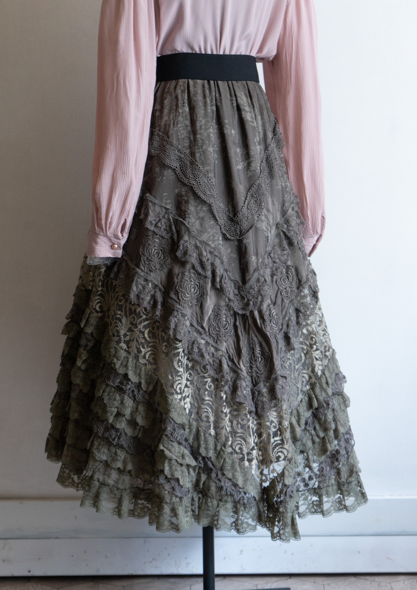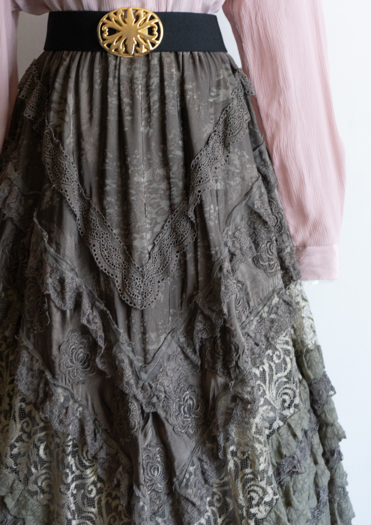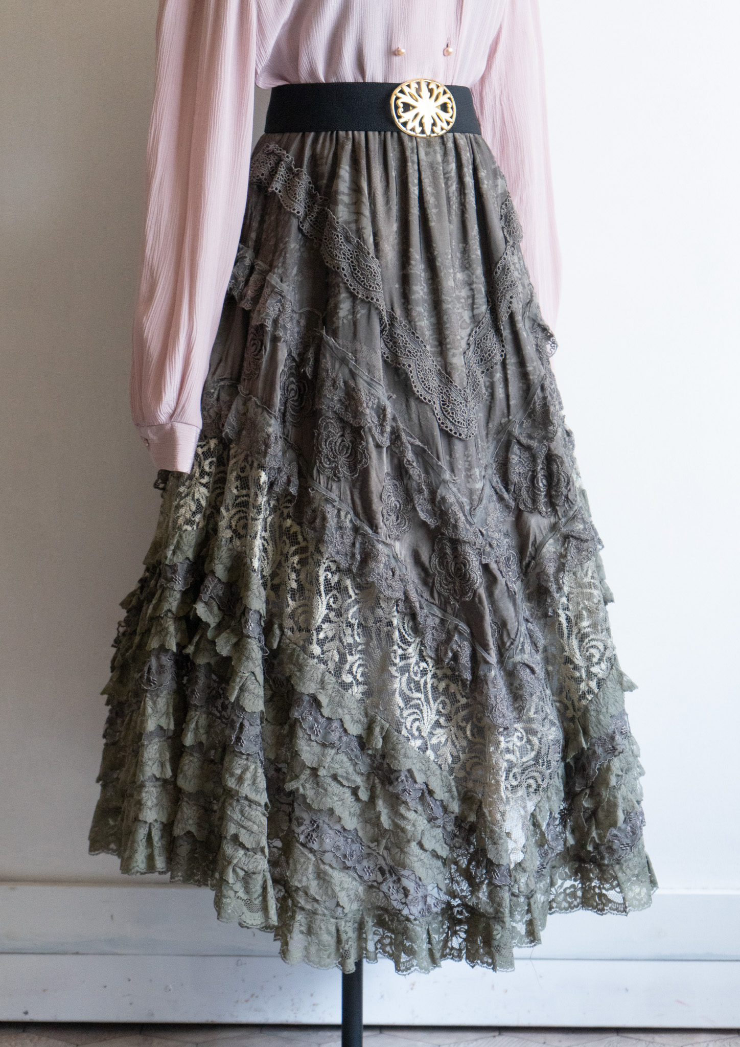 80's Flower Lace Tiered Olive Skirt