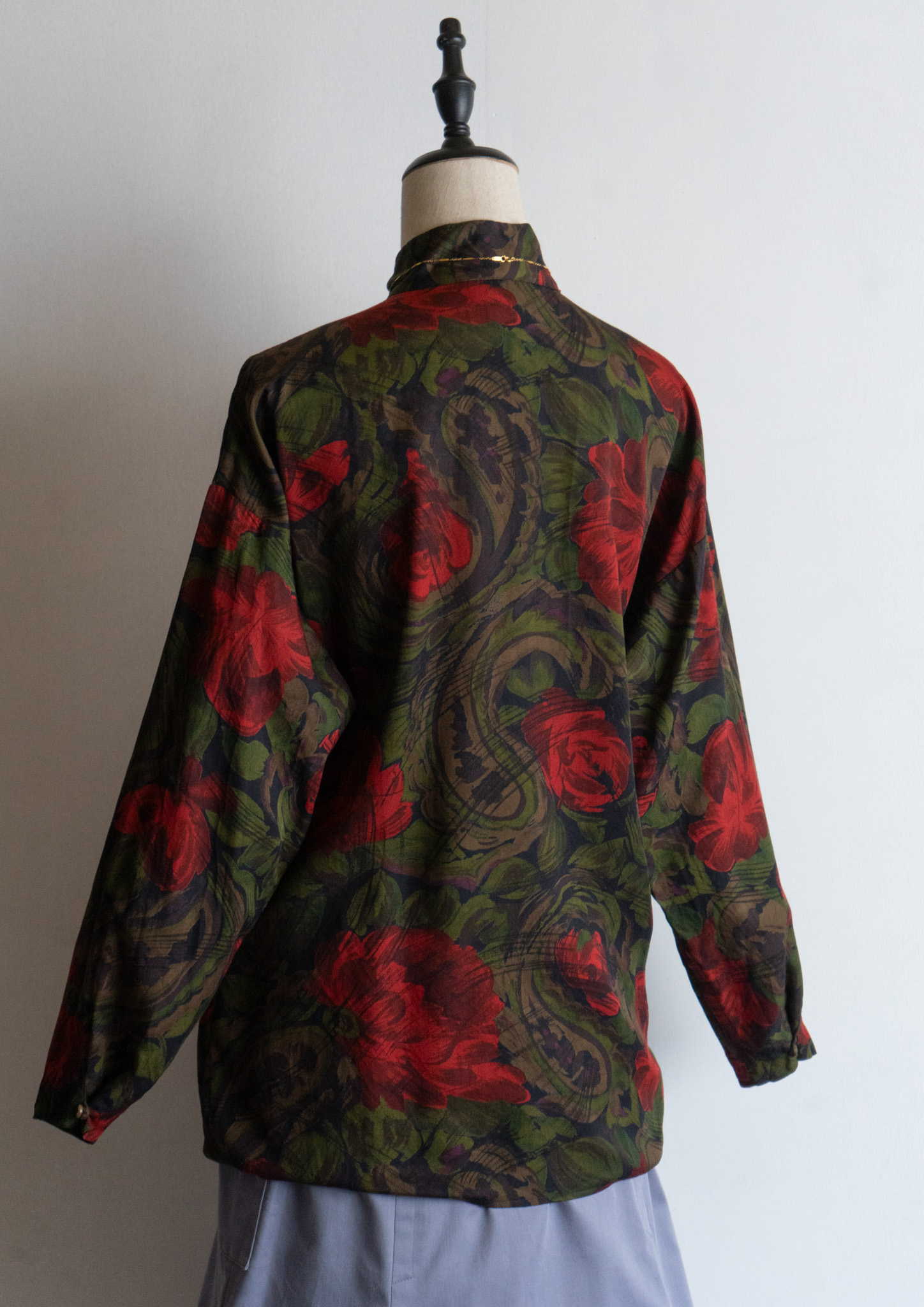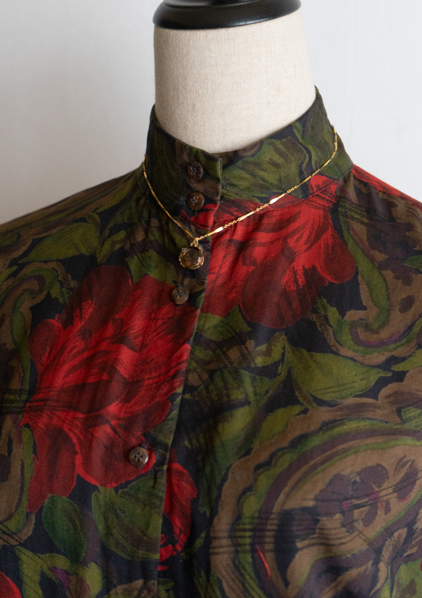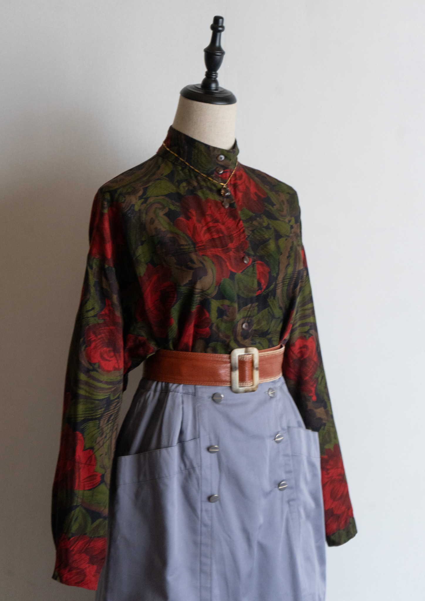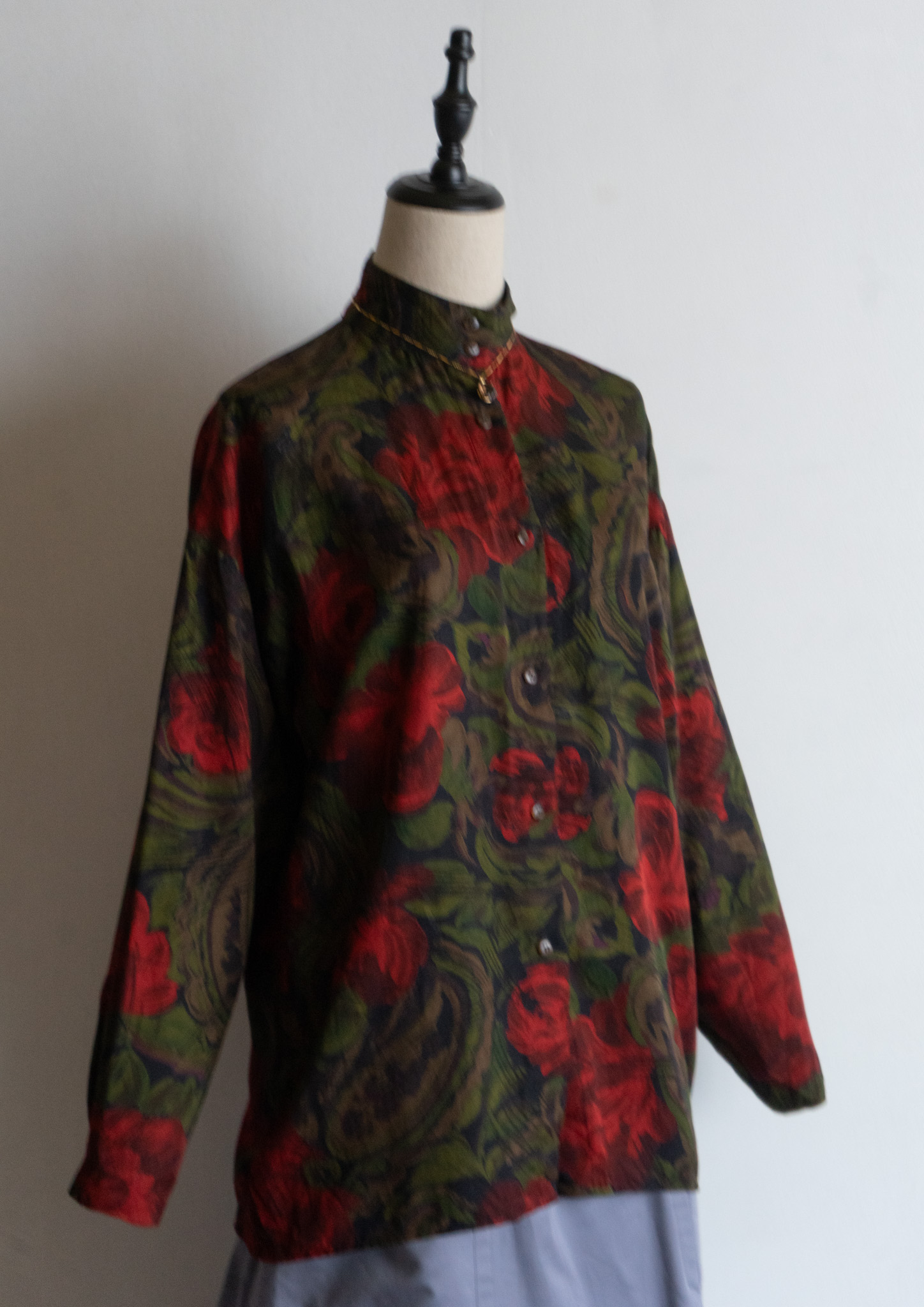 70~80's USA Botanical Pattern Stand Collar Blouse
