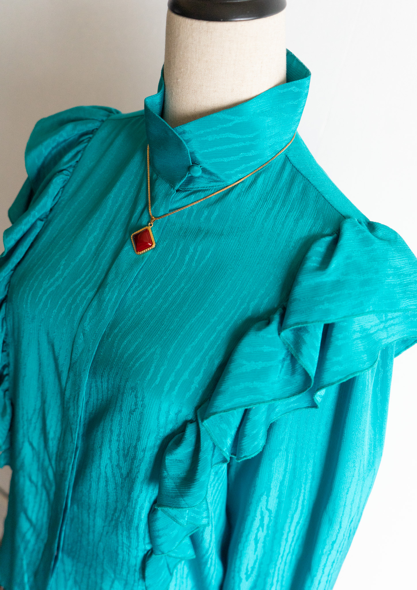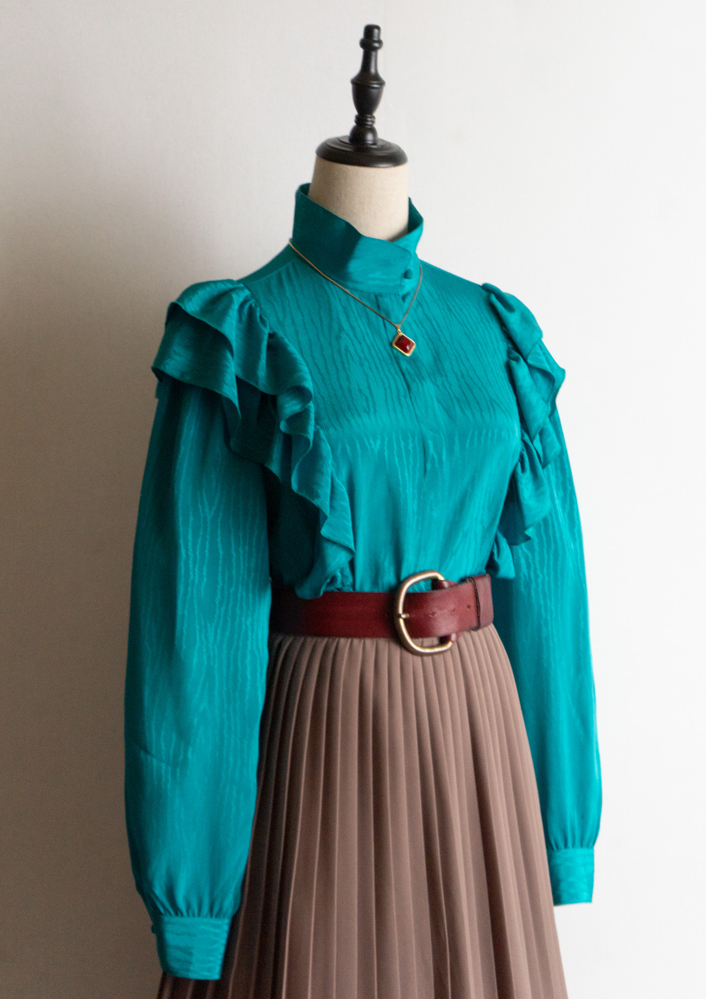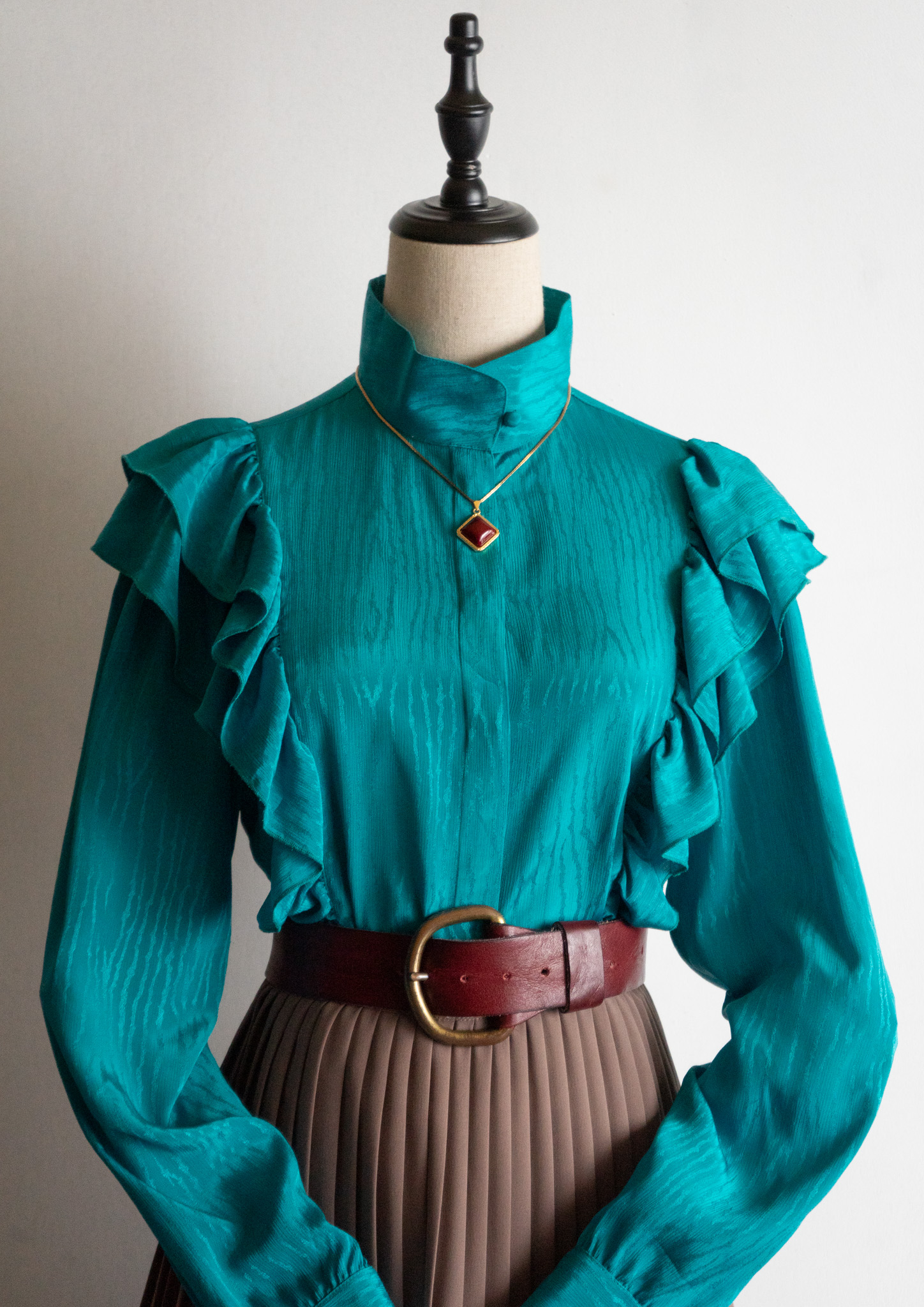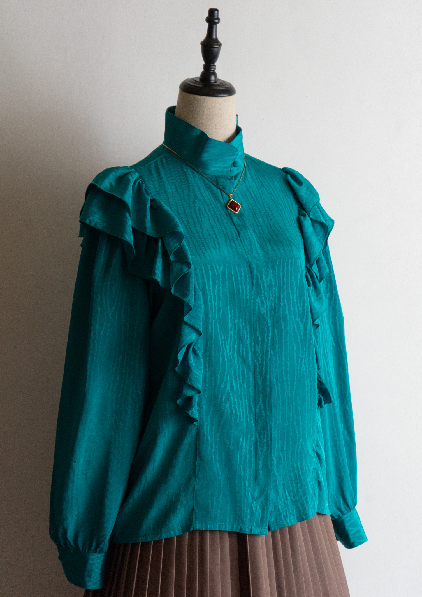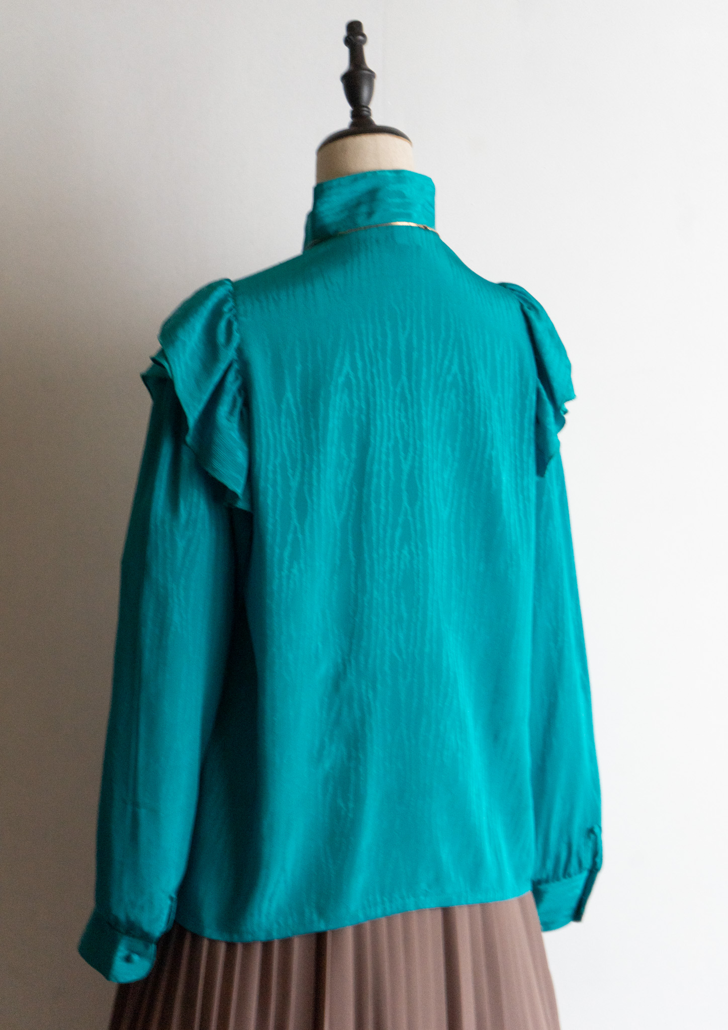 80's Shoulder Frill Design Tree Ring Like Pattern Glossy Green Blouse