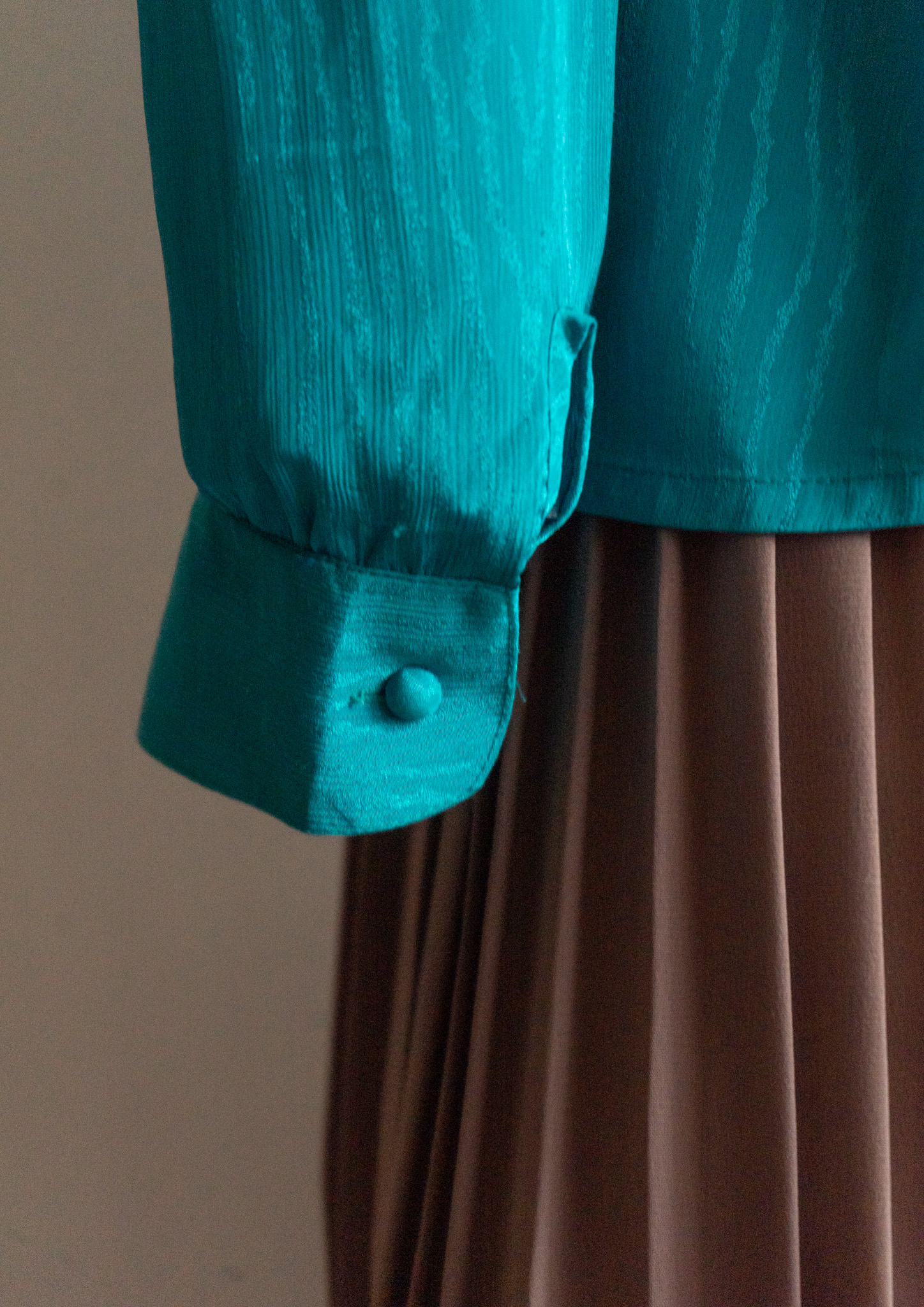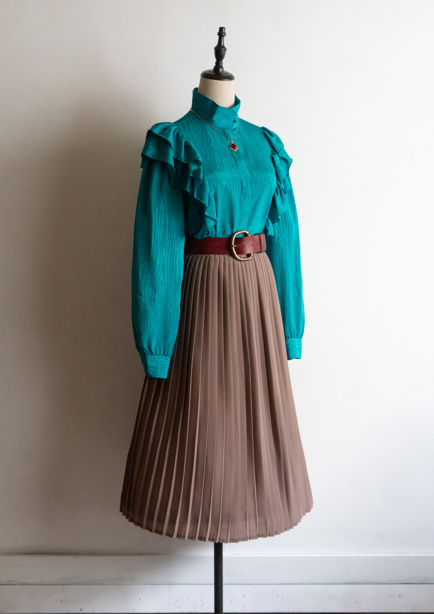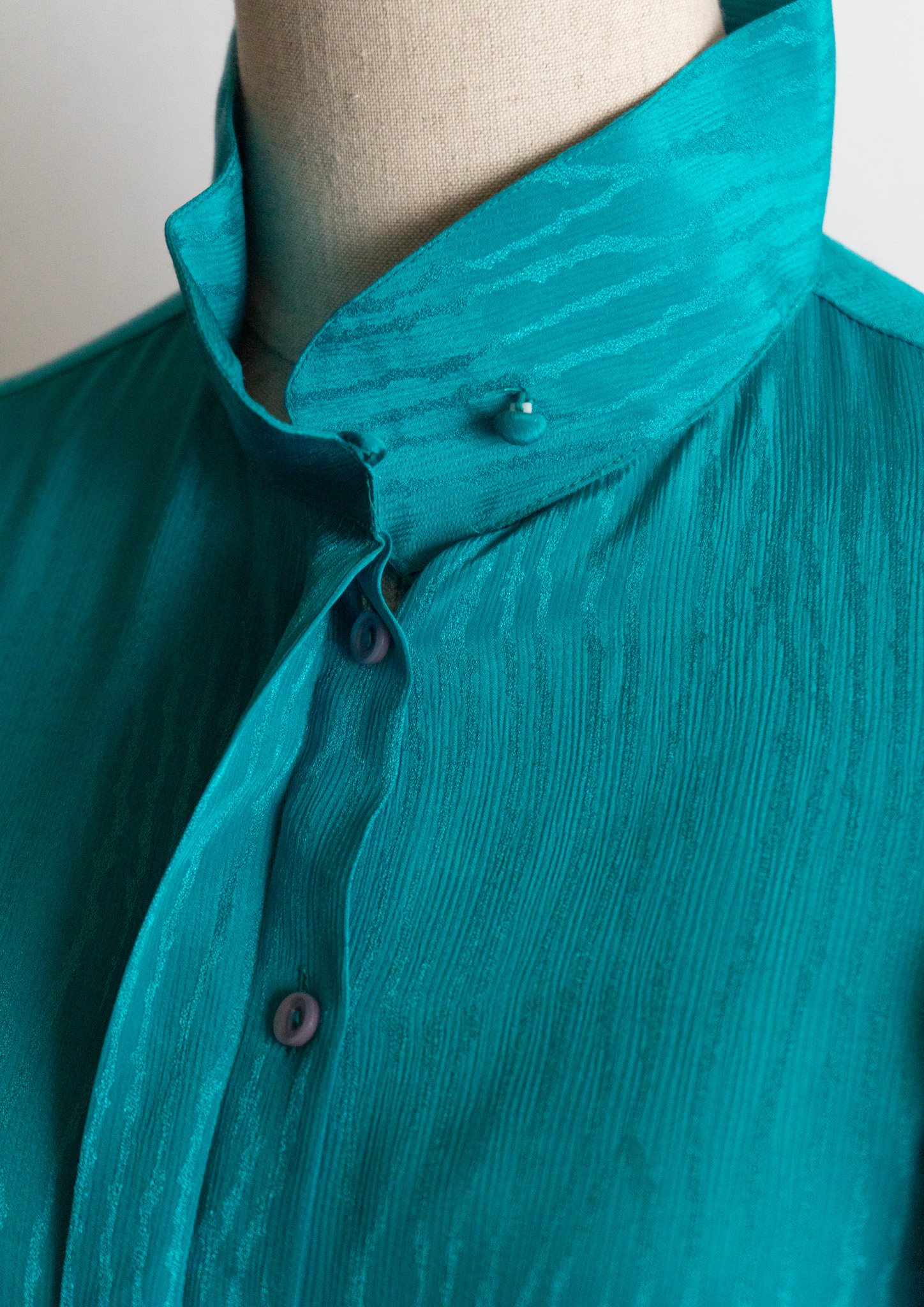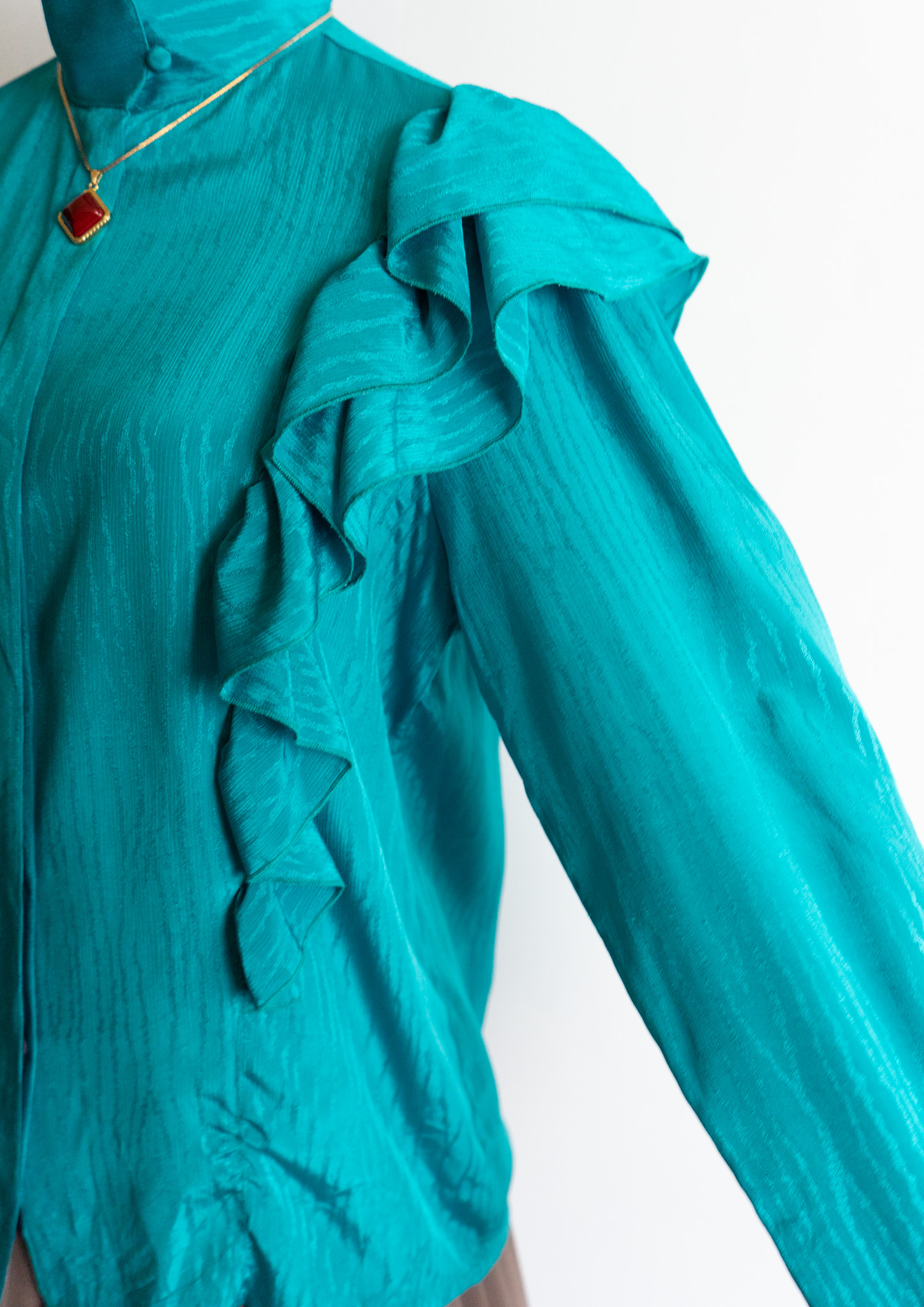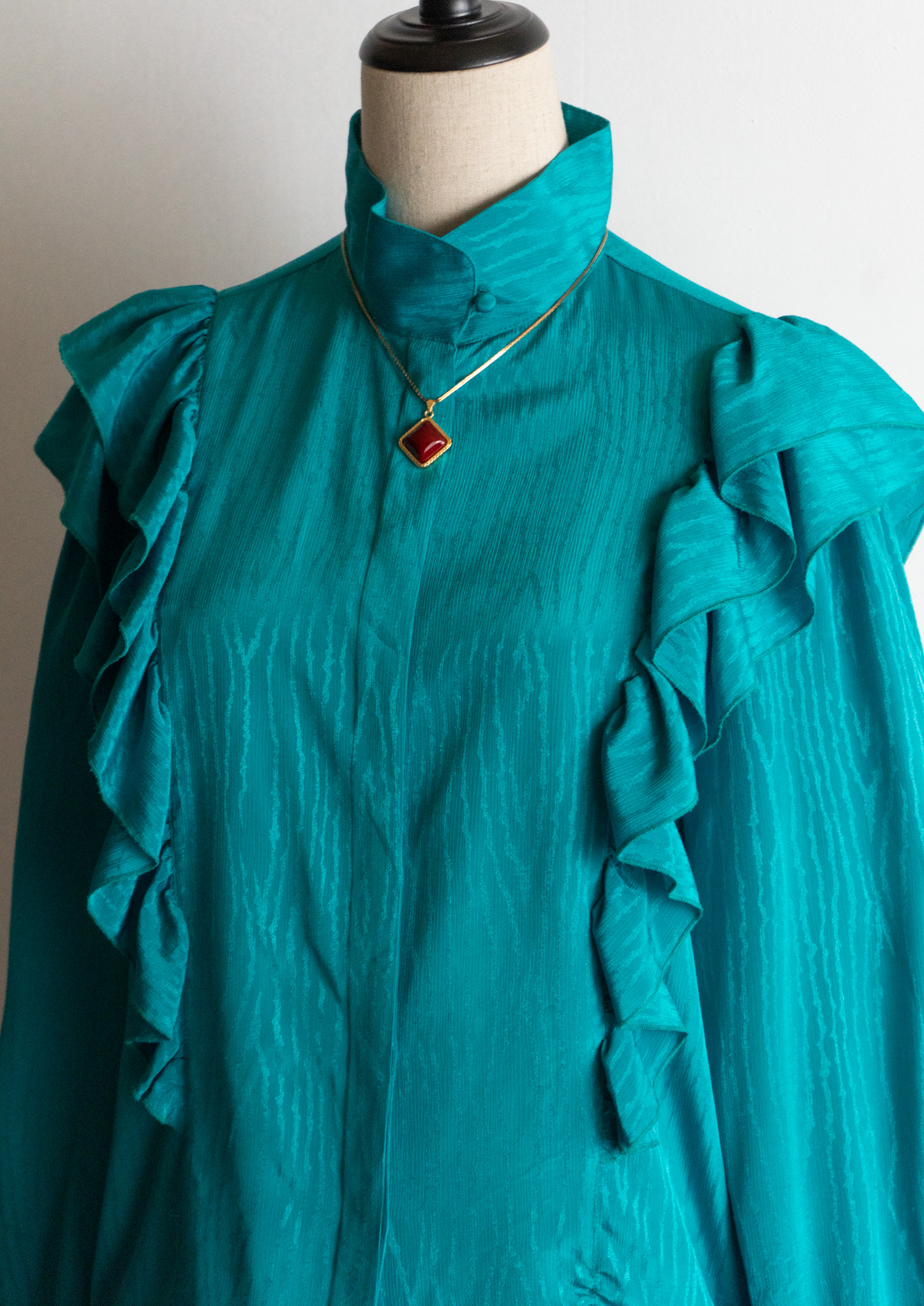 80's Shoulder Frill Design Tree Ring Like Pattern Glossy Green Blouse