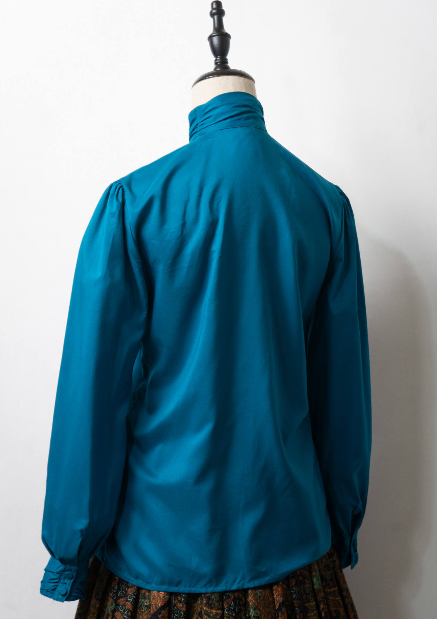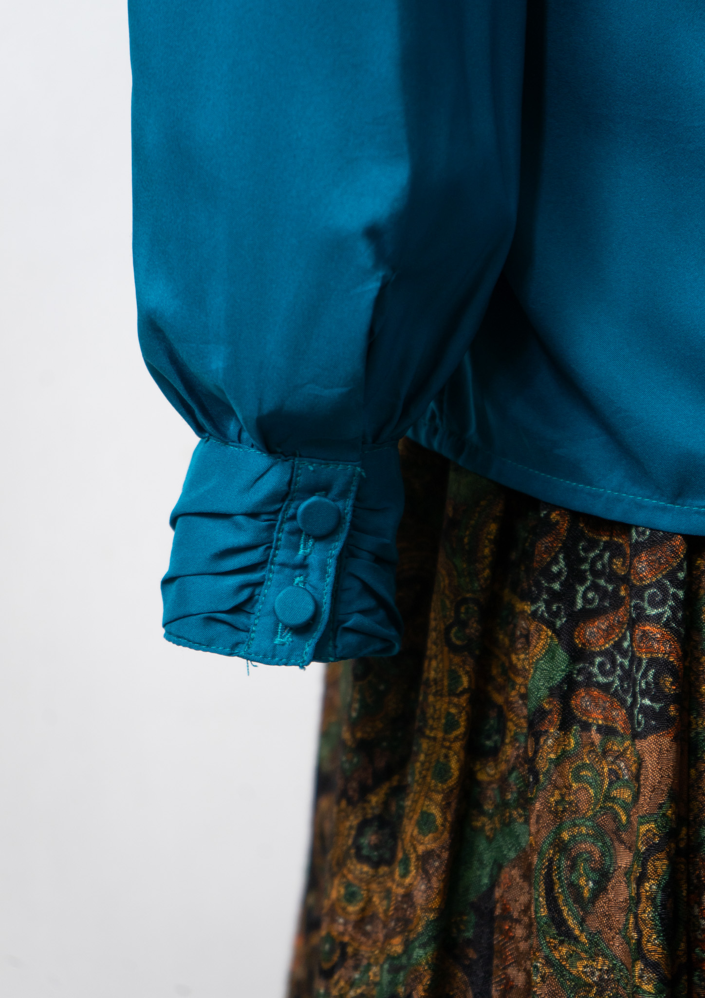 80's Jabot Like Collar Glossy Block Check Pattern Navy Blouse