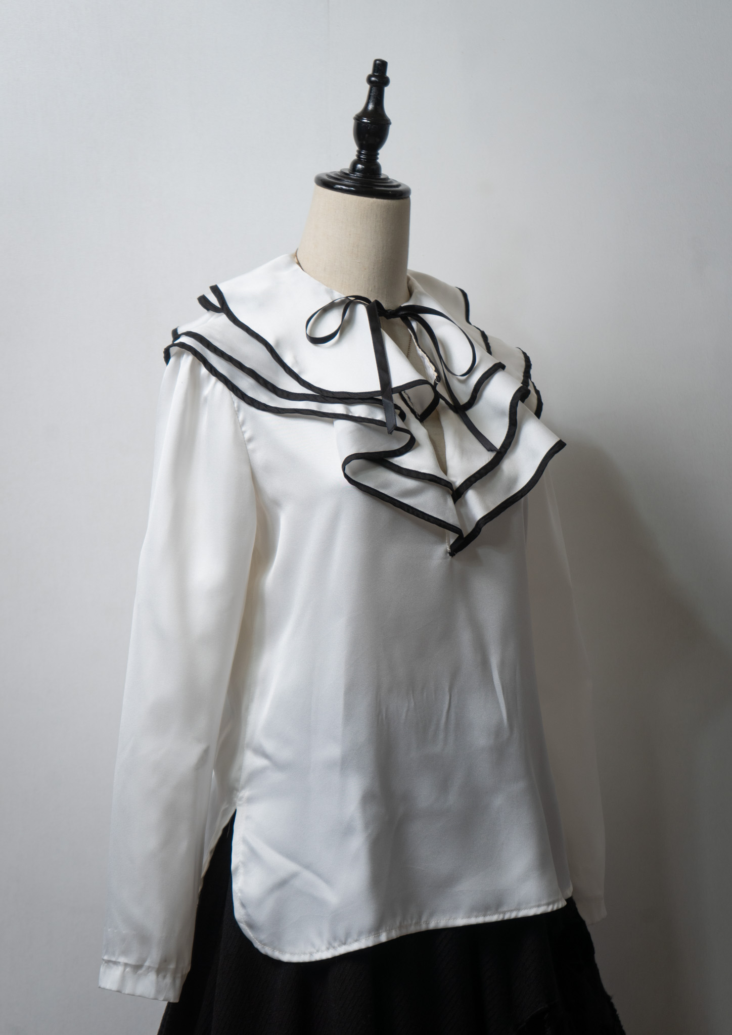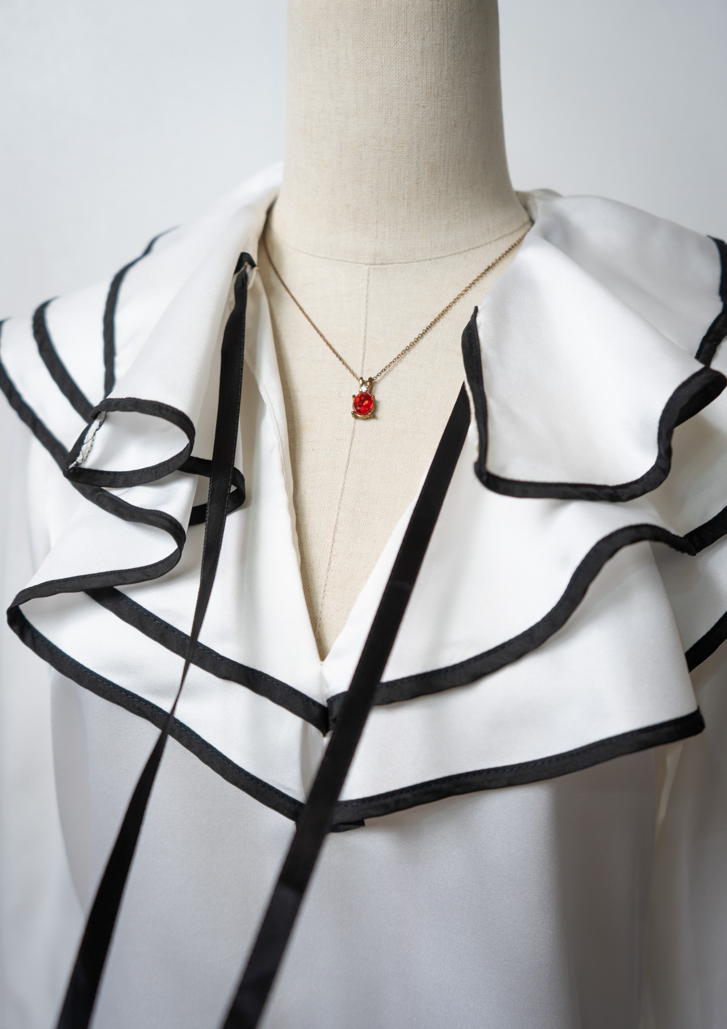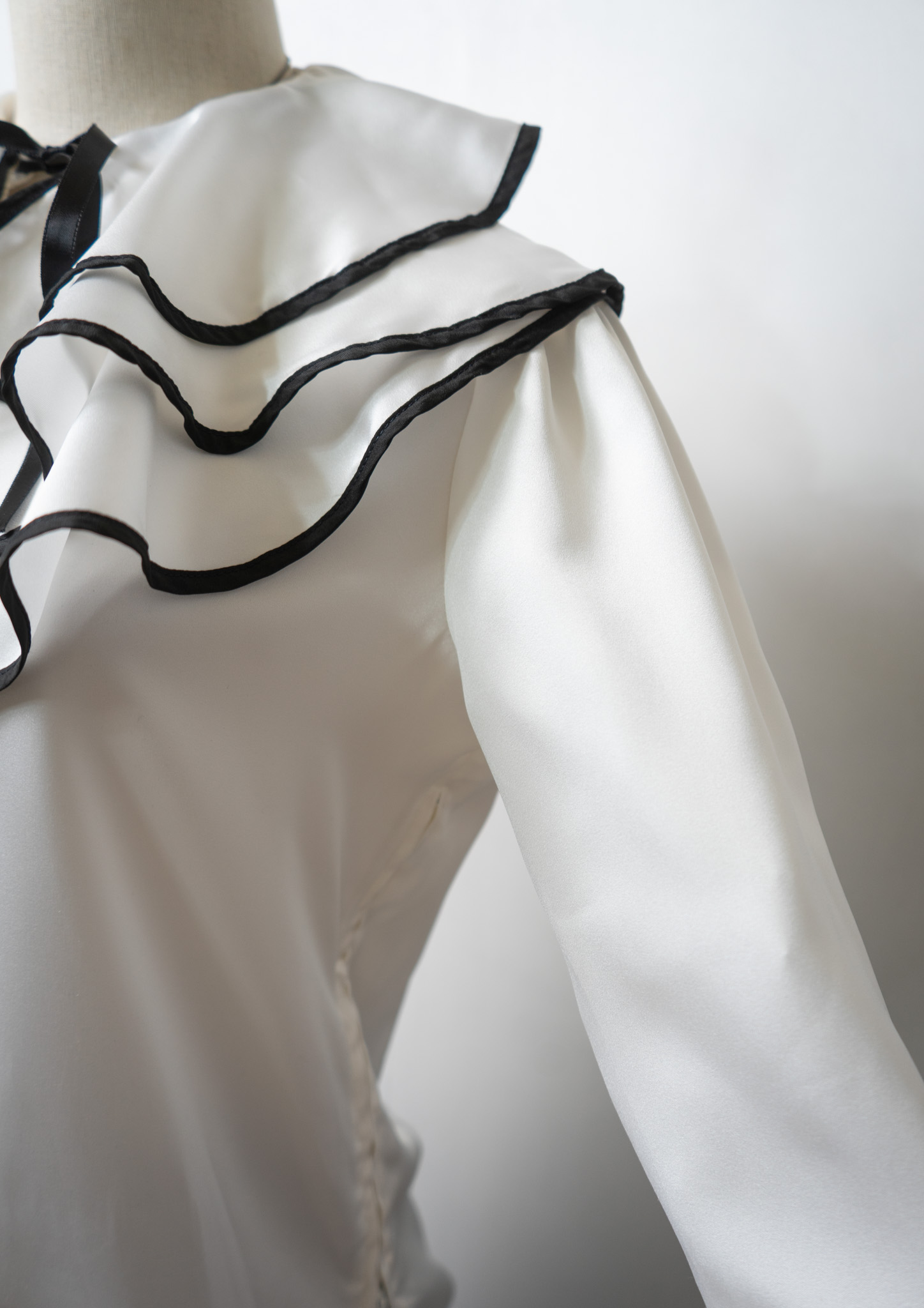 80's Jabot Like Collar Glossy Block Check Pattern Navy Blouse