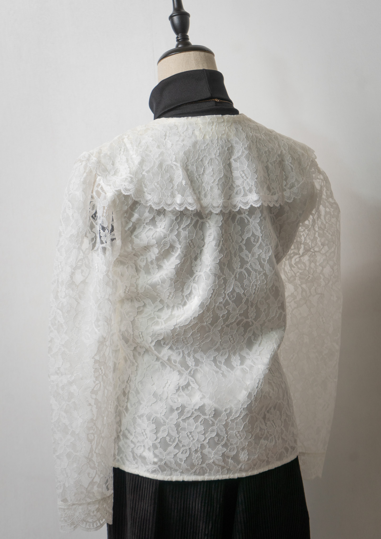 80's Jabot Like Collar Frill Design Black Blouse