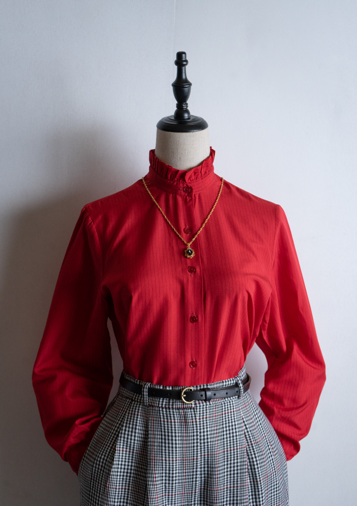 80's France Stand Frill Collar Stripe Pattern Red Blouse