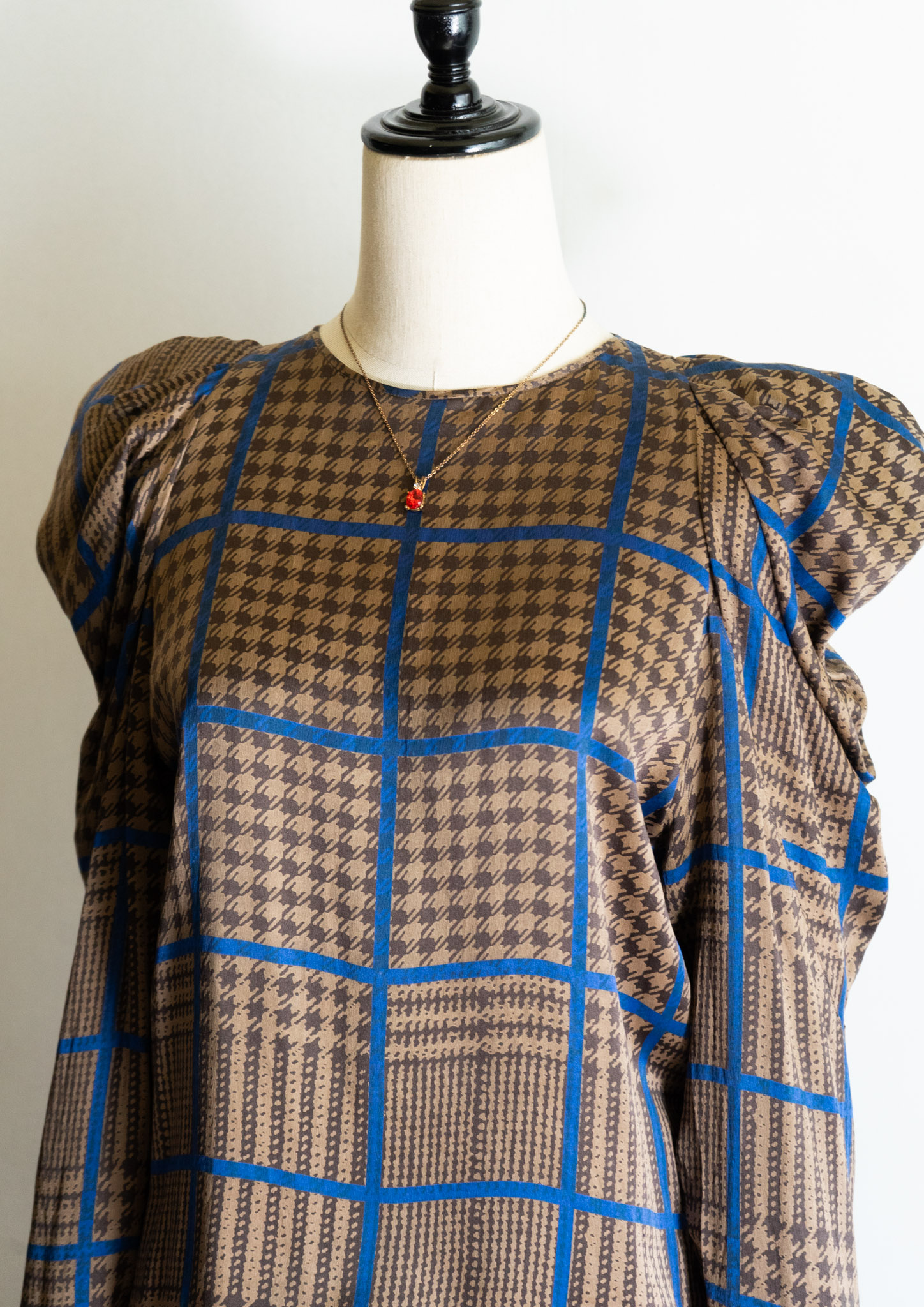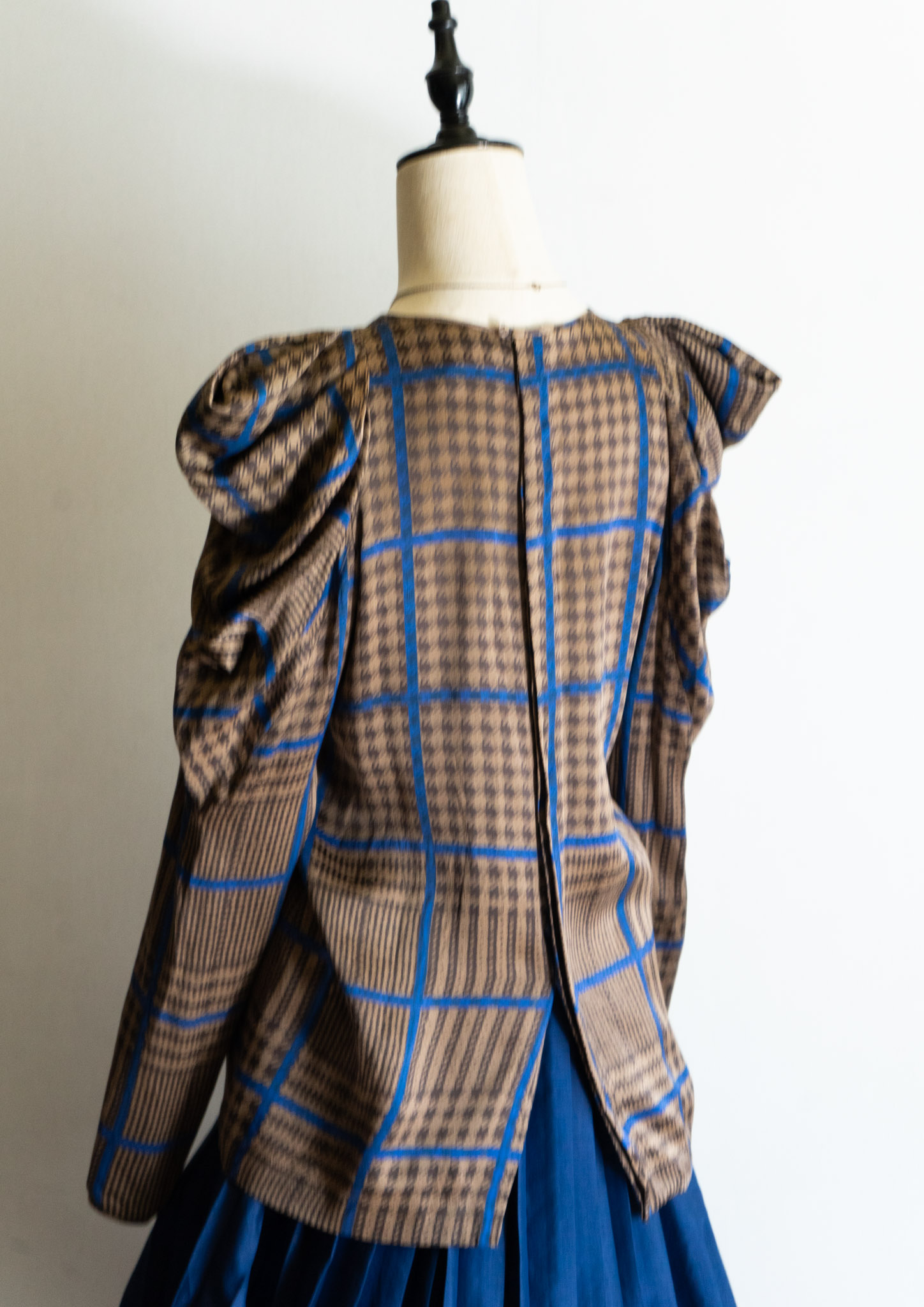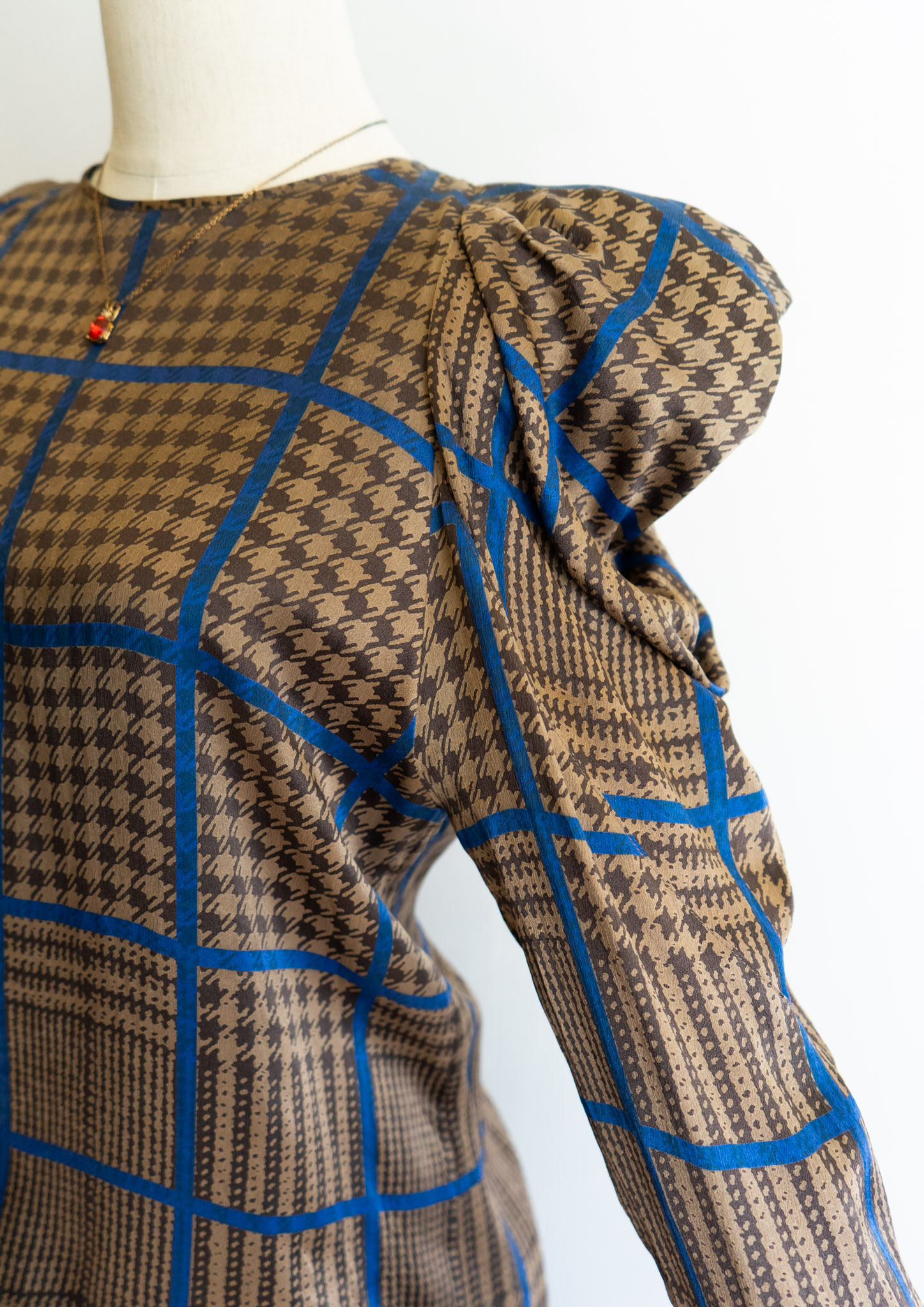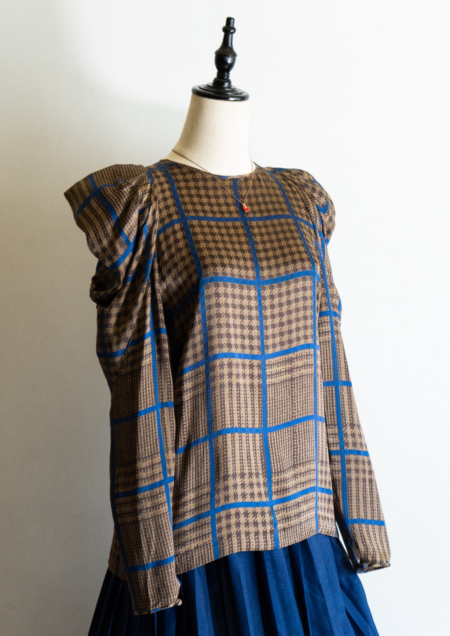 80's France Brown × Blue Houndstooth Pattern Puff Sleeve Blouse