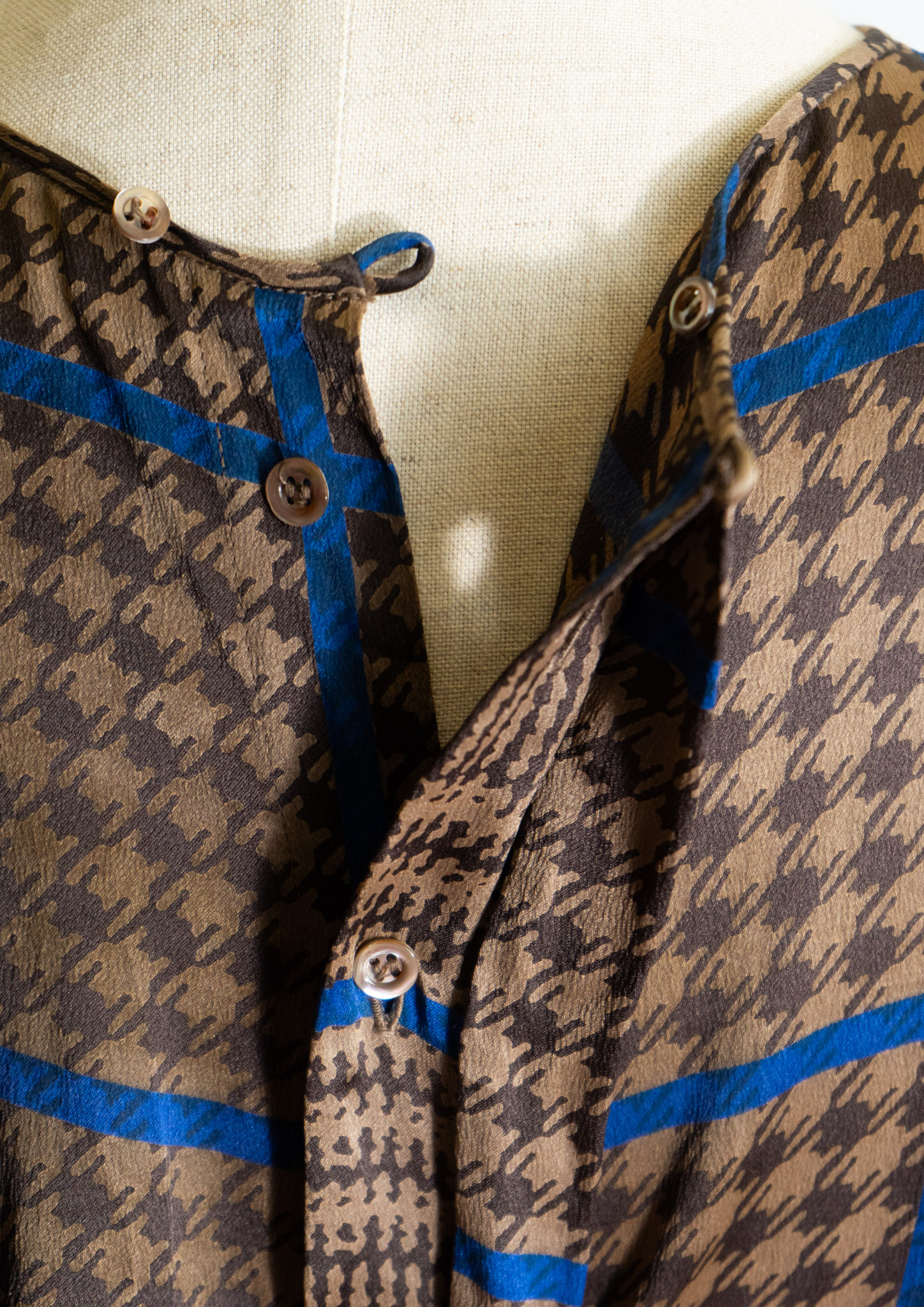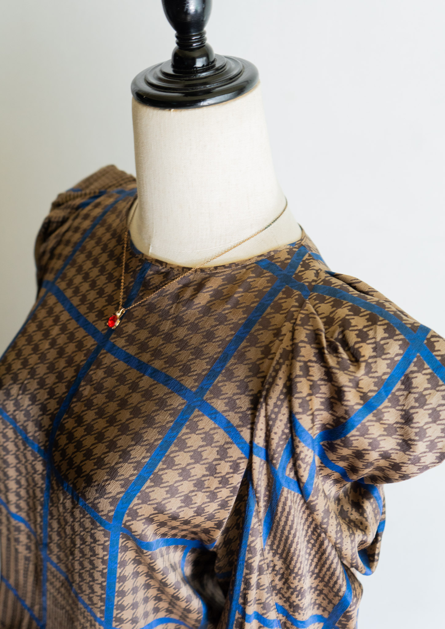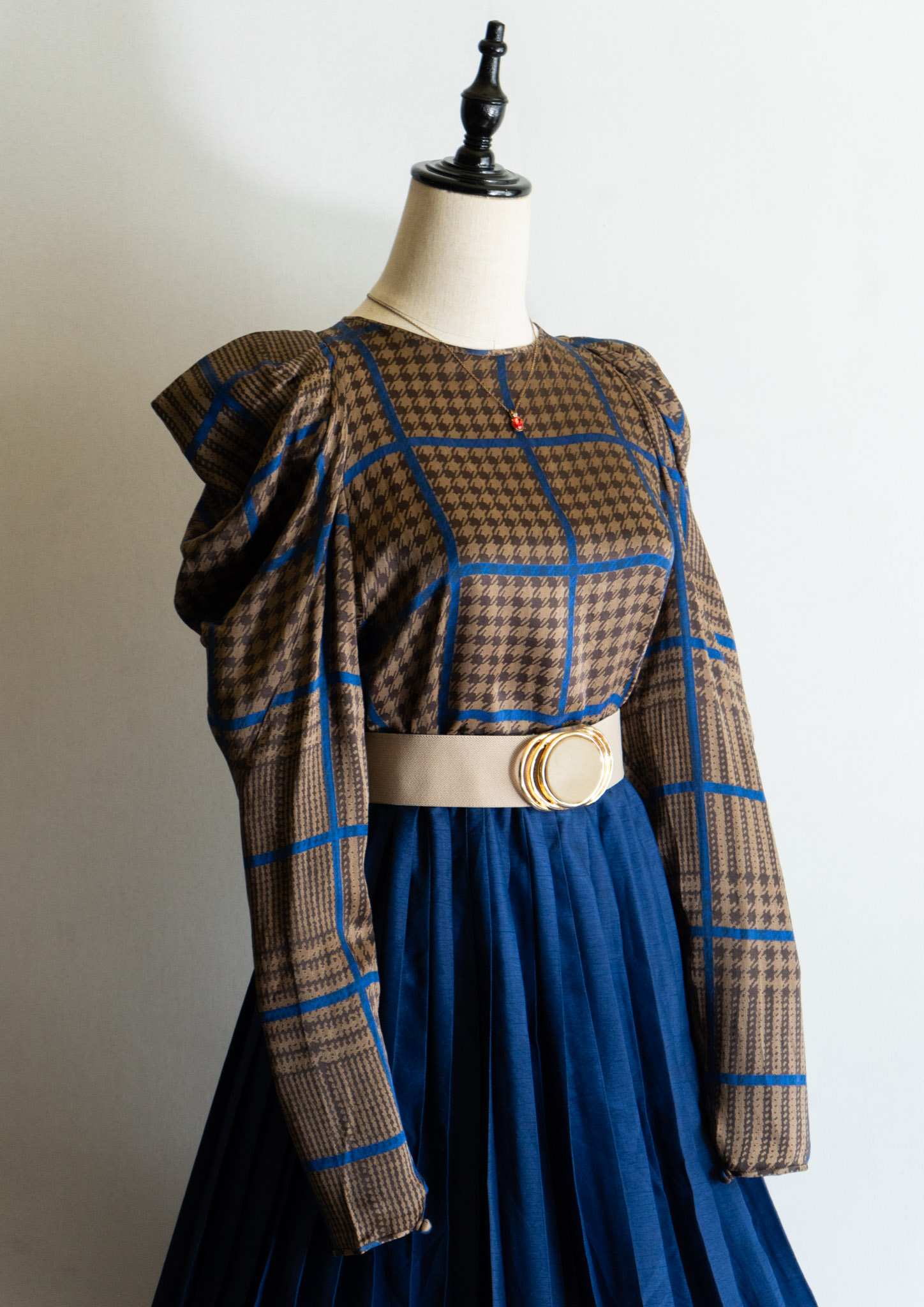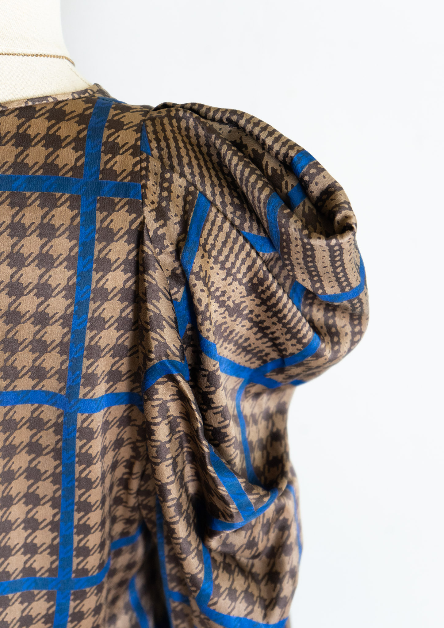 80's France Brown × Blue Houndstooth Pattern Puff Sleeve Blouse