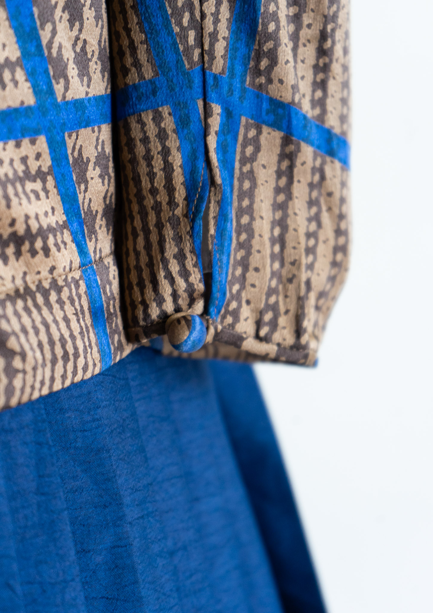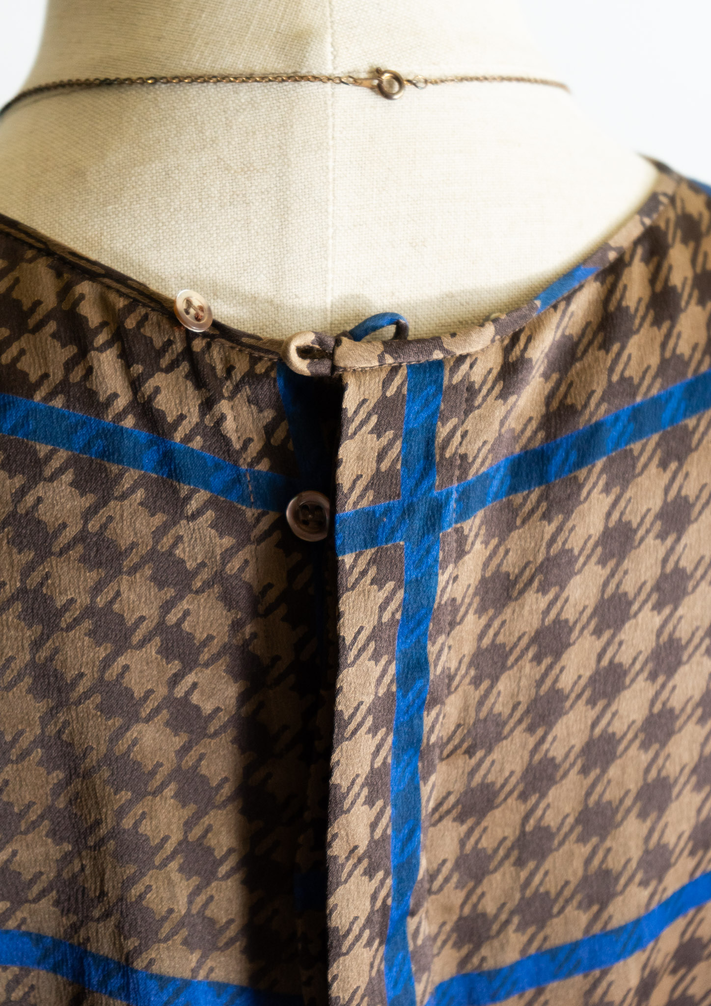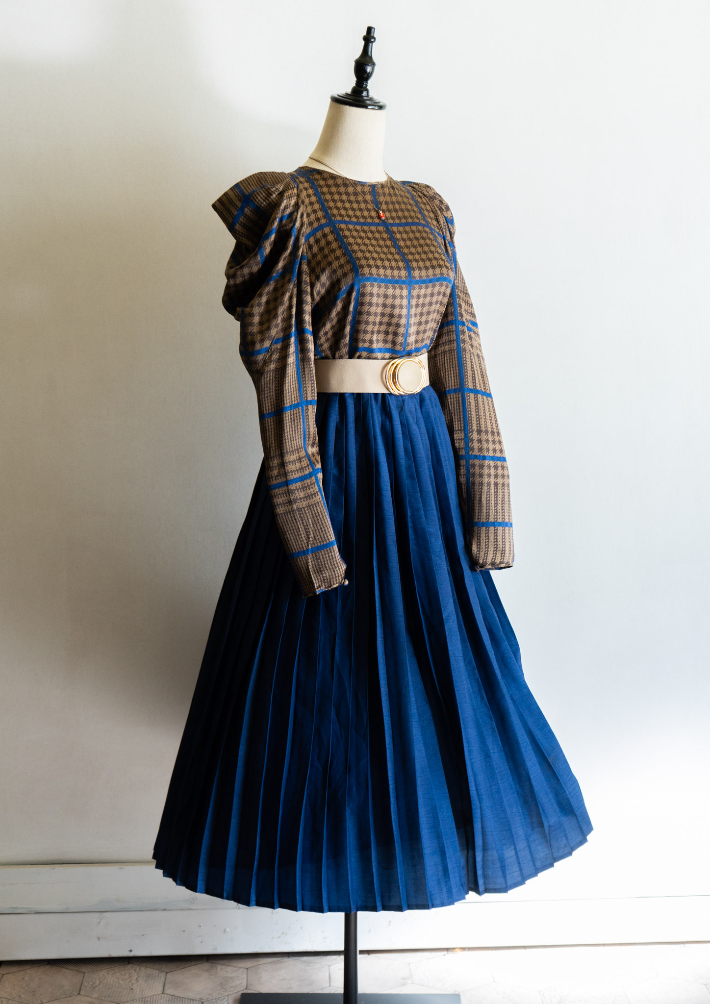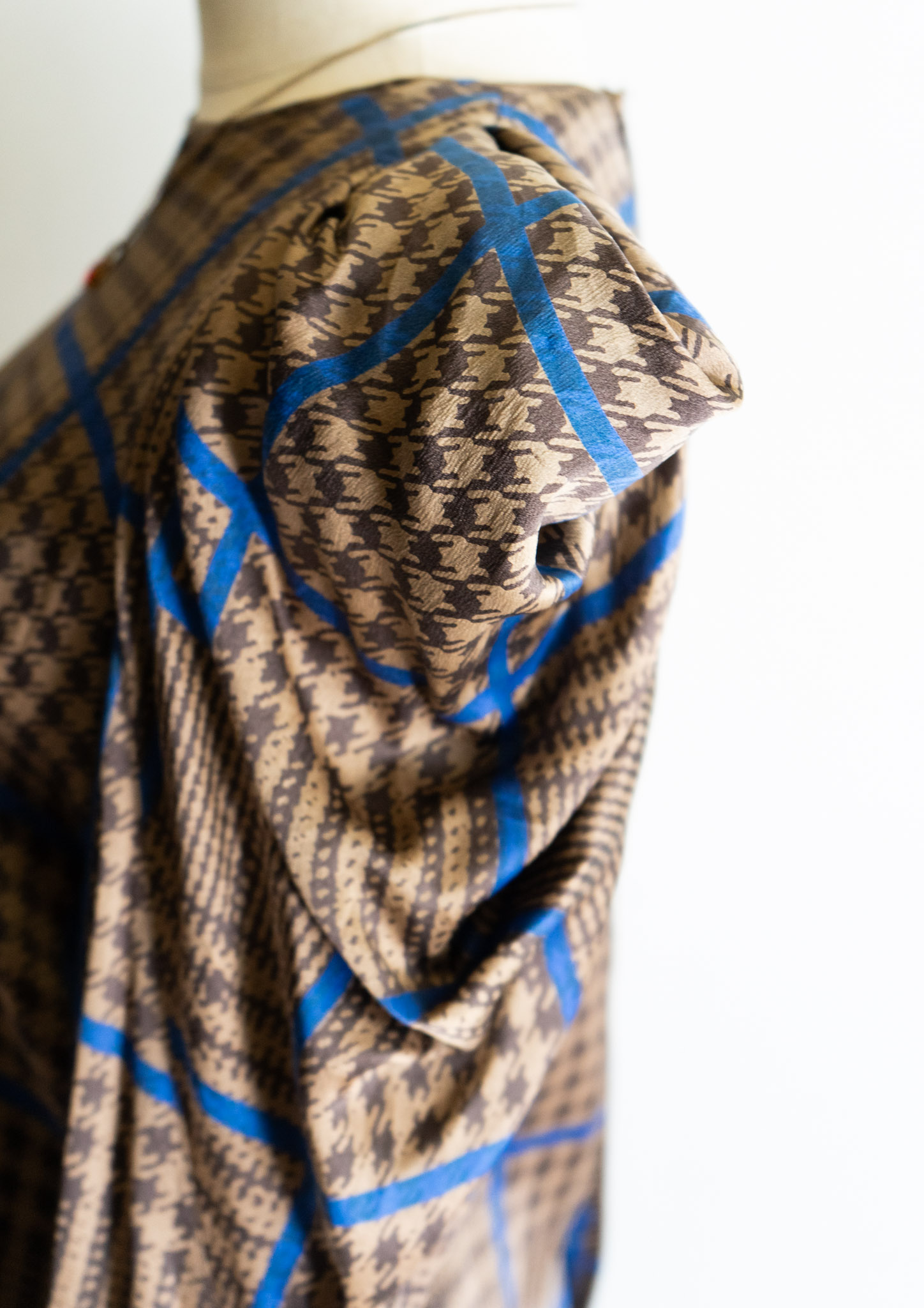 80's France Brown × Blue Houndstooth Pattern Puff Sleeve Blouse