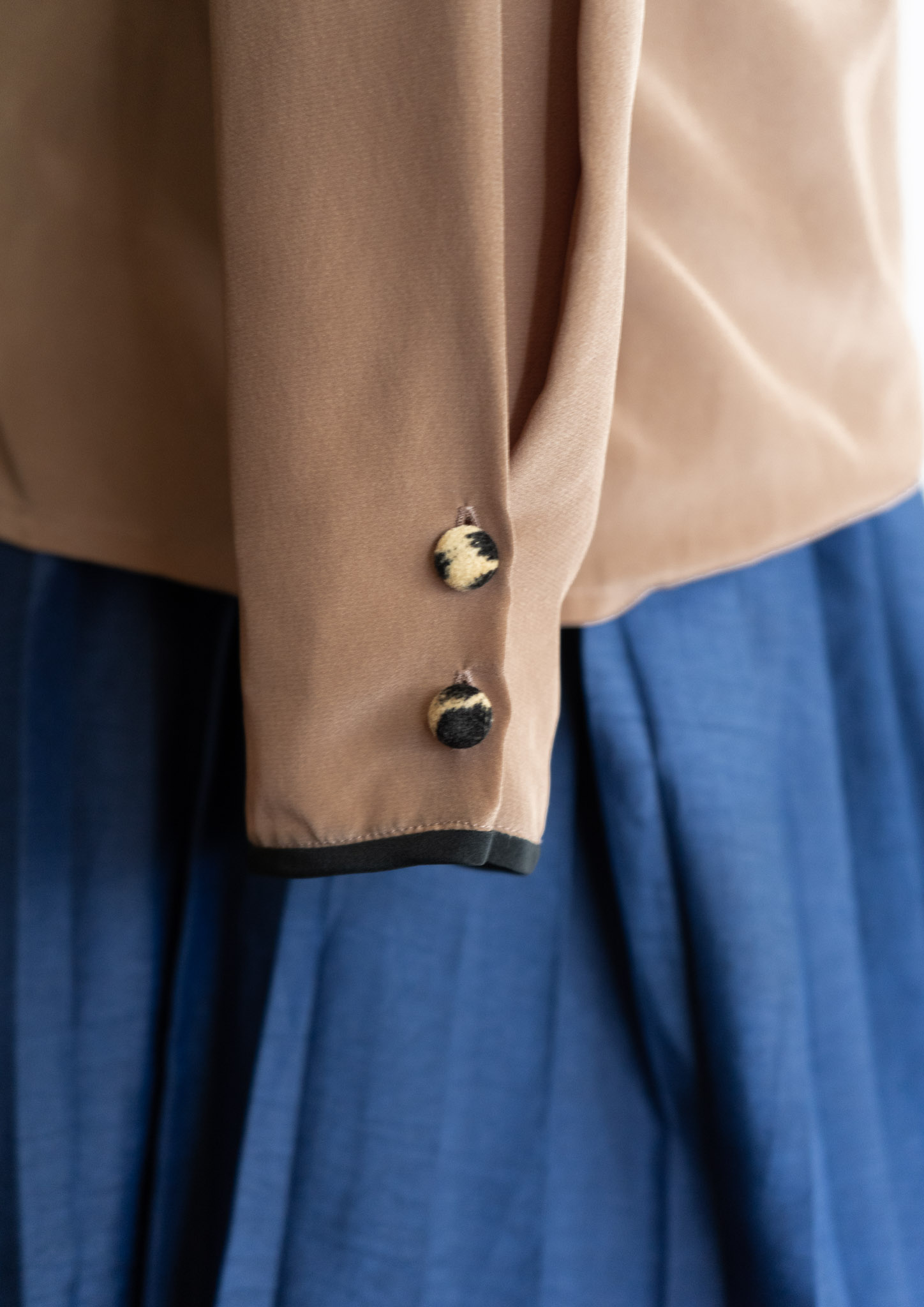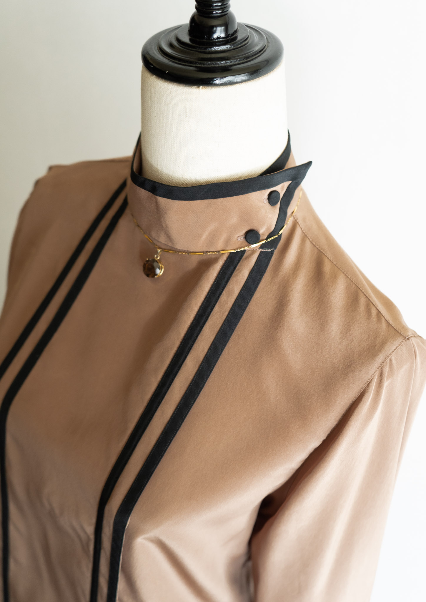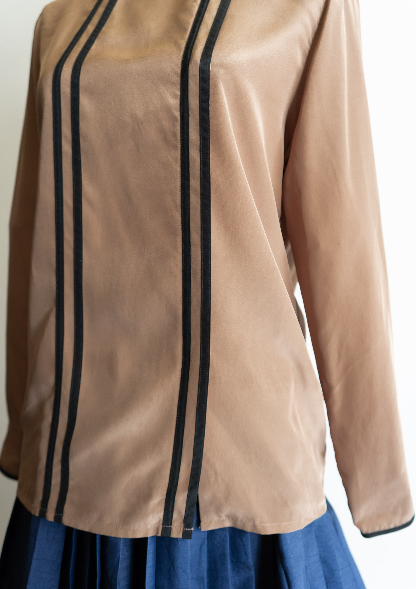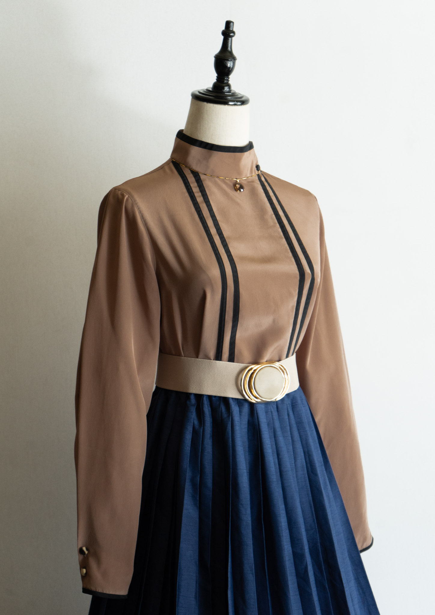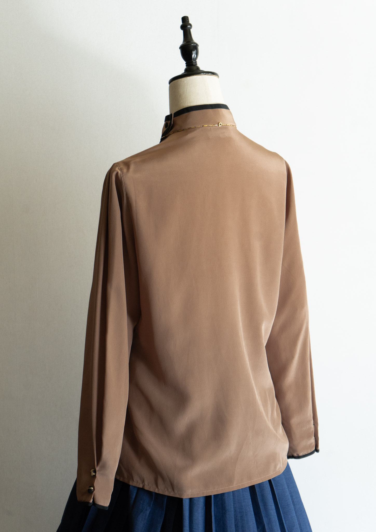 80's Jabot Like Collar Glossy Block Check Pattern Navy Blouse