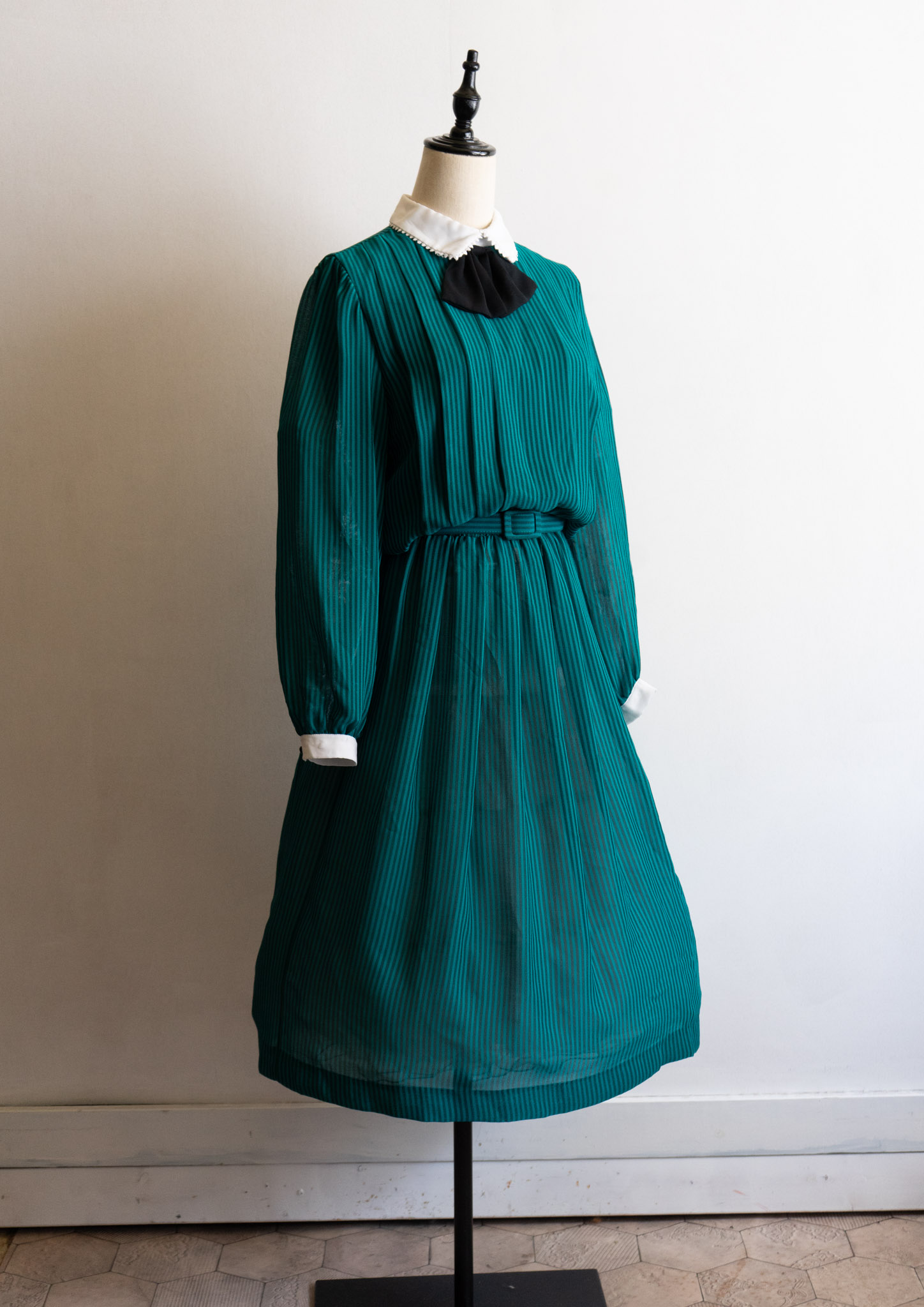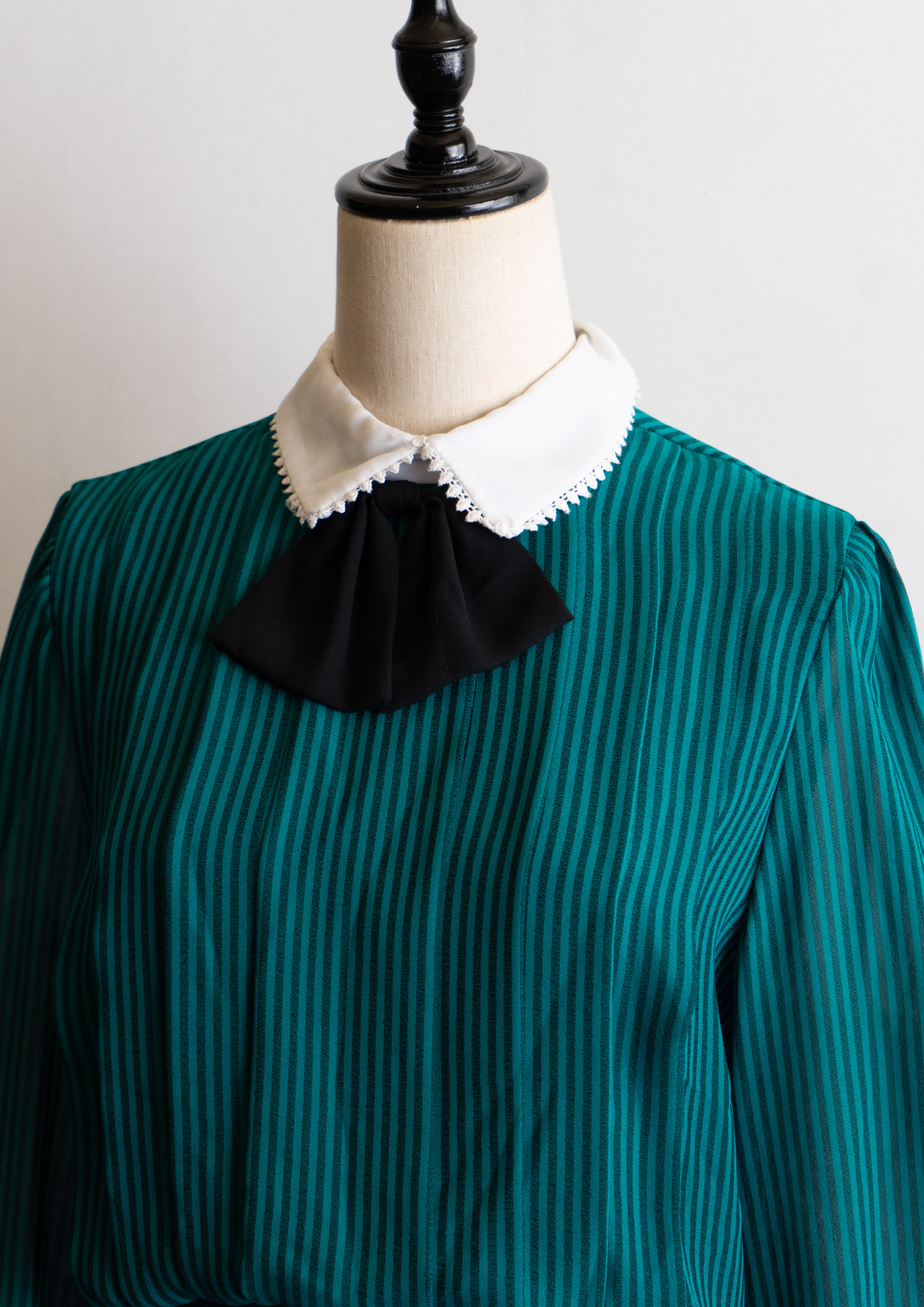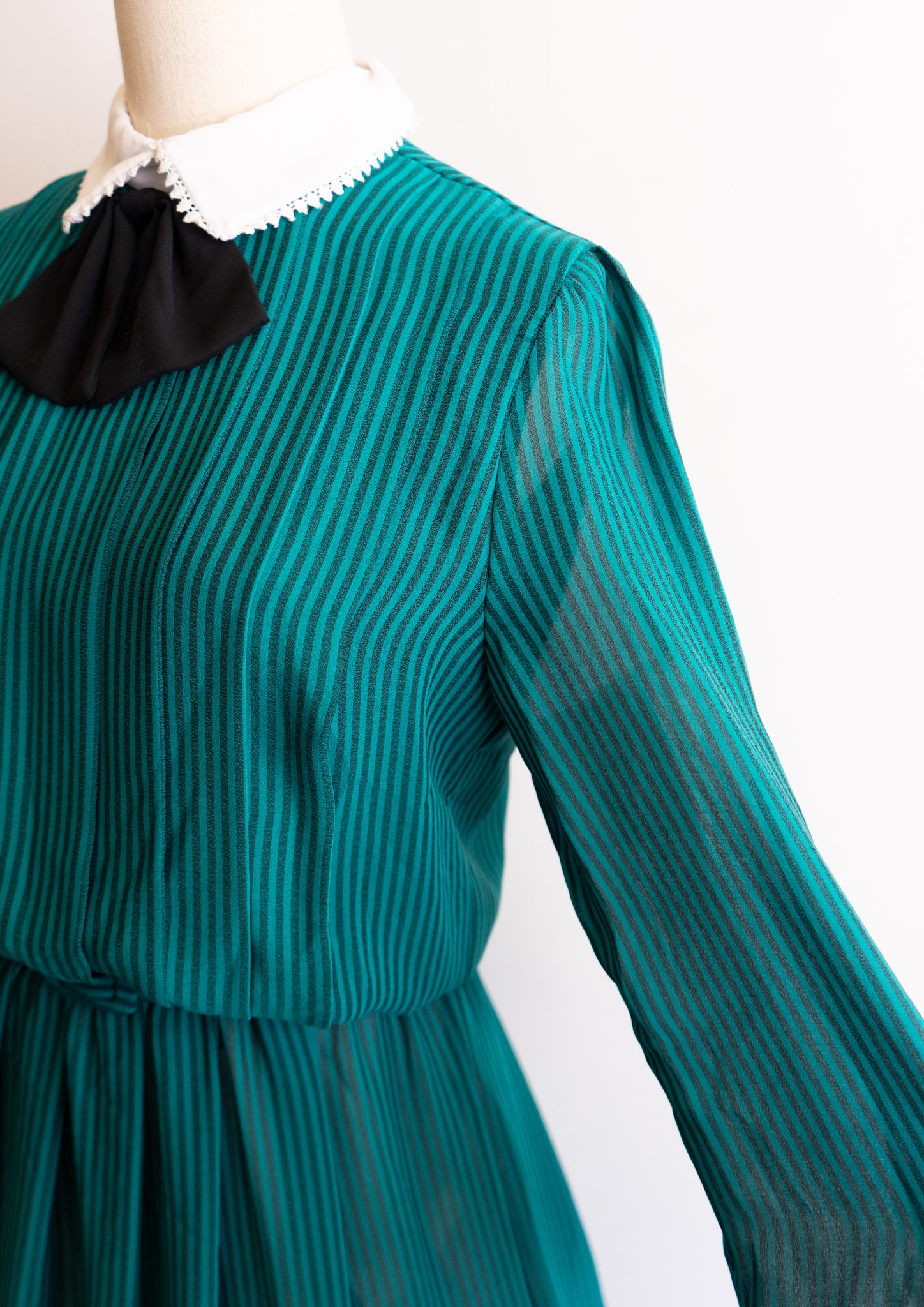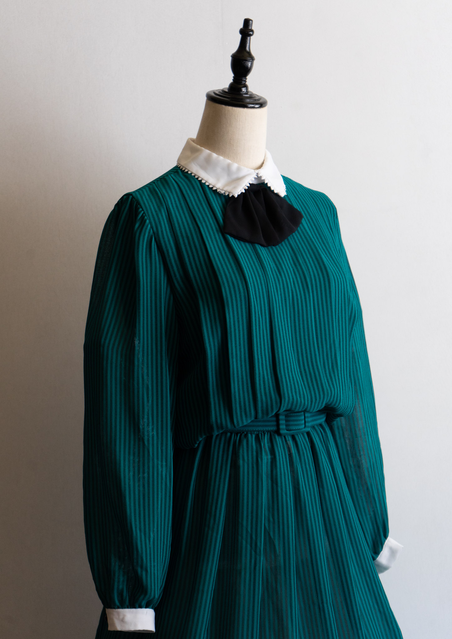 80's White Collar Black Ribbon Design Stripe Pattern Green Dress