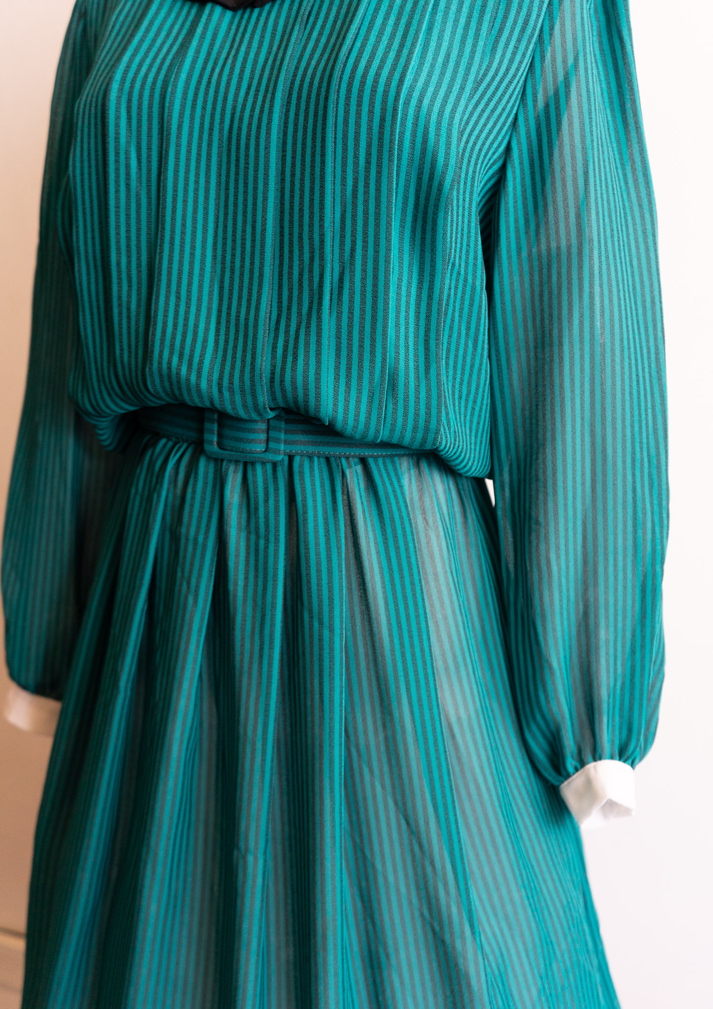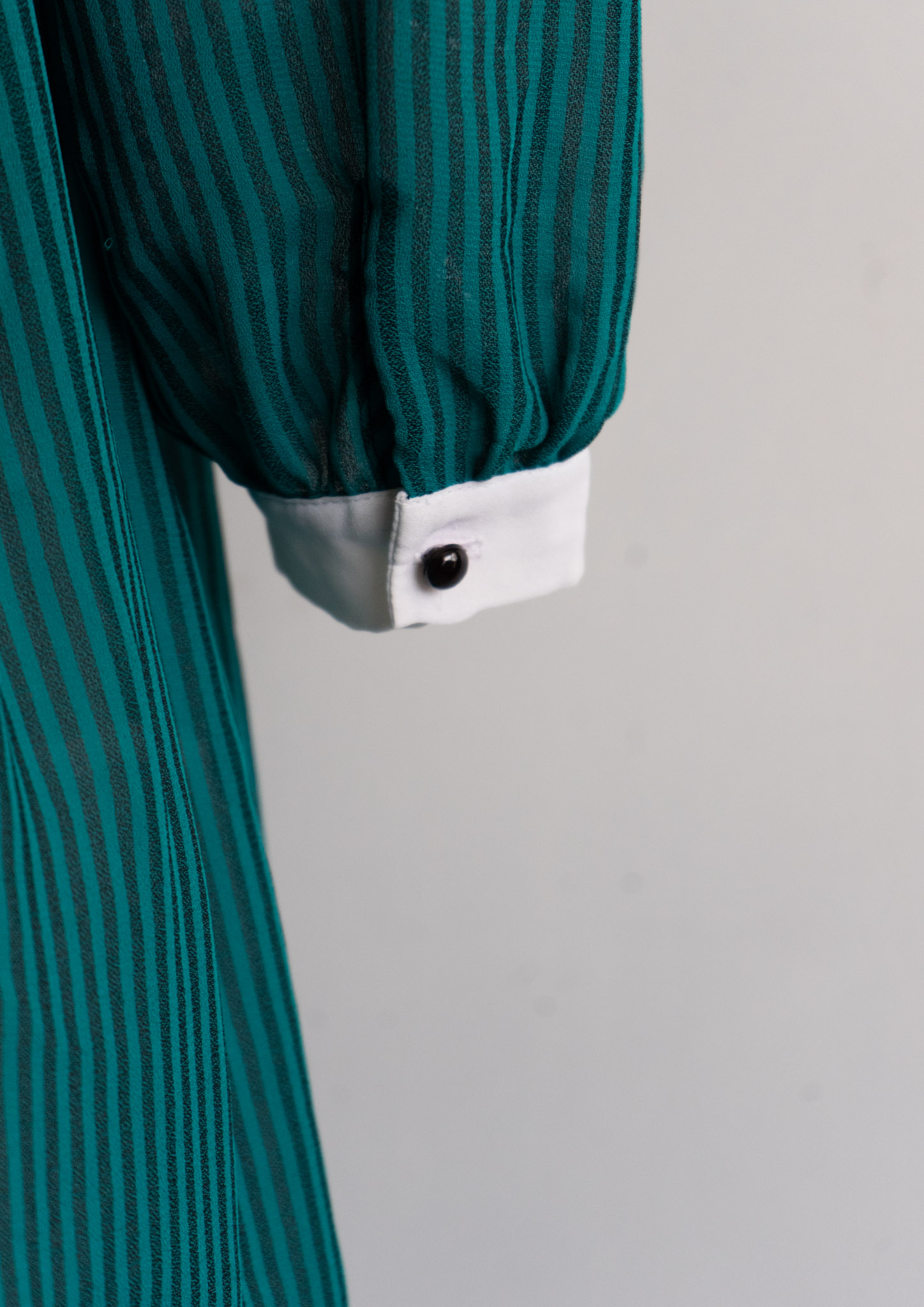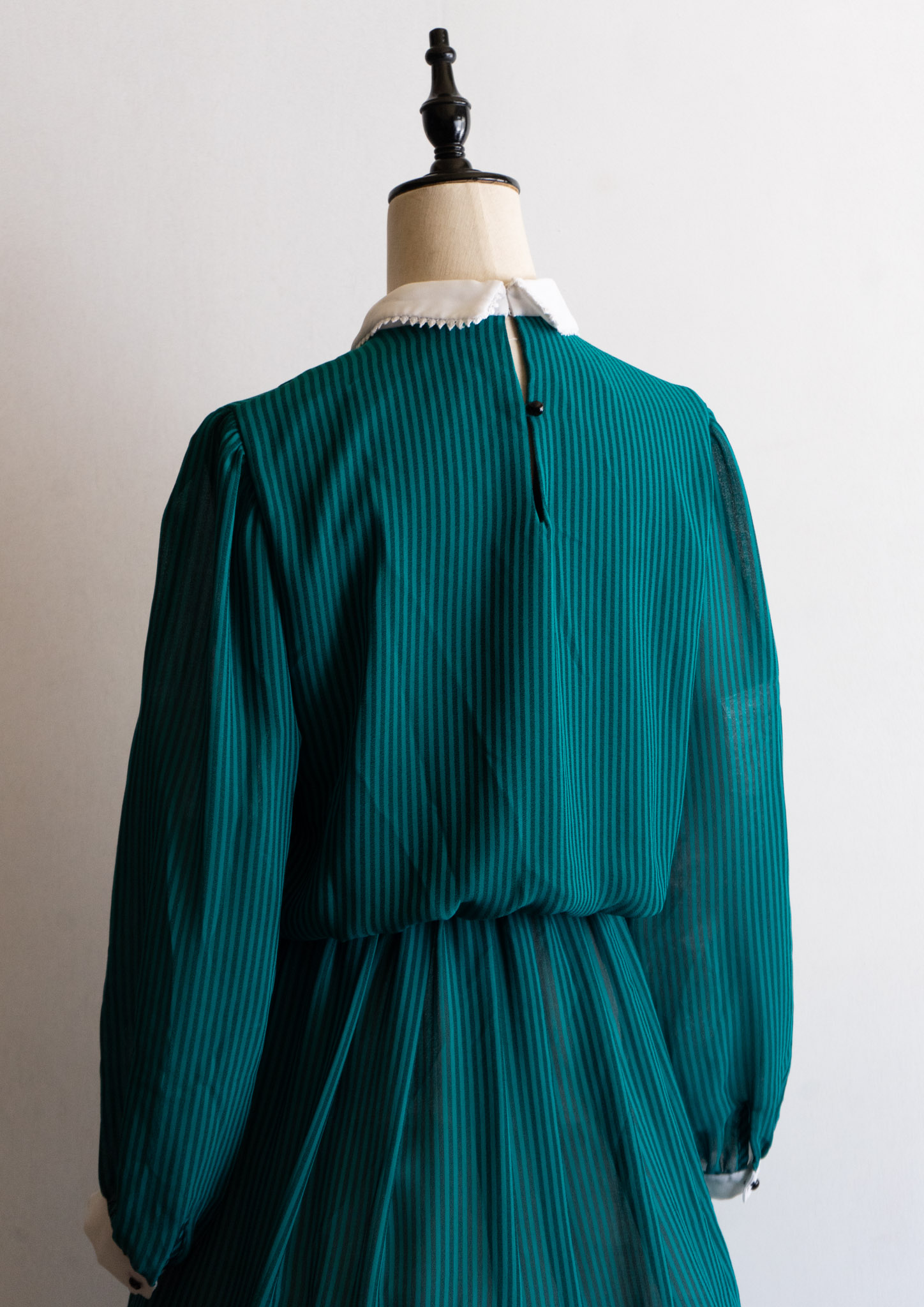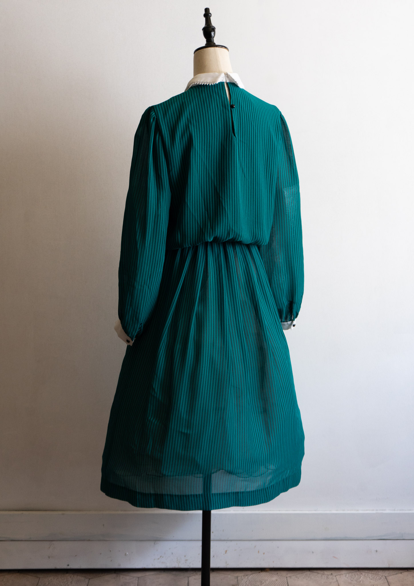 80's White Collar Black Ribbon Design Stripe Pattern Green Dress