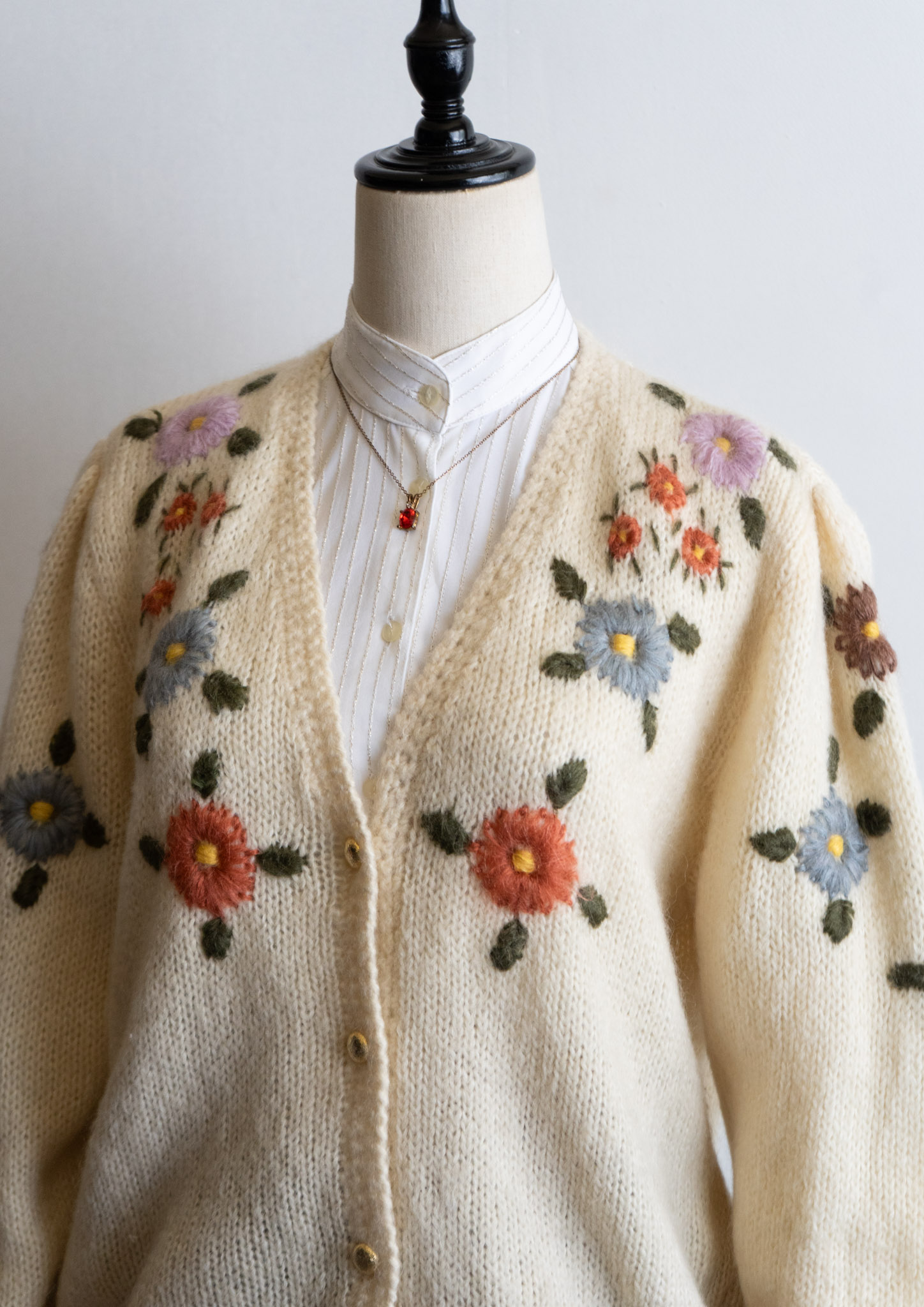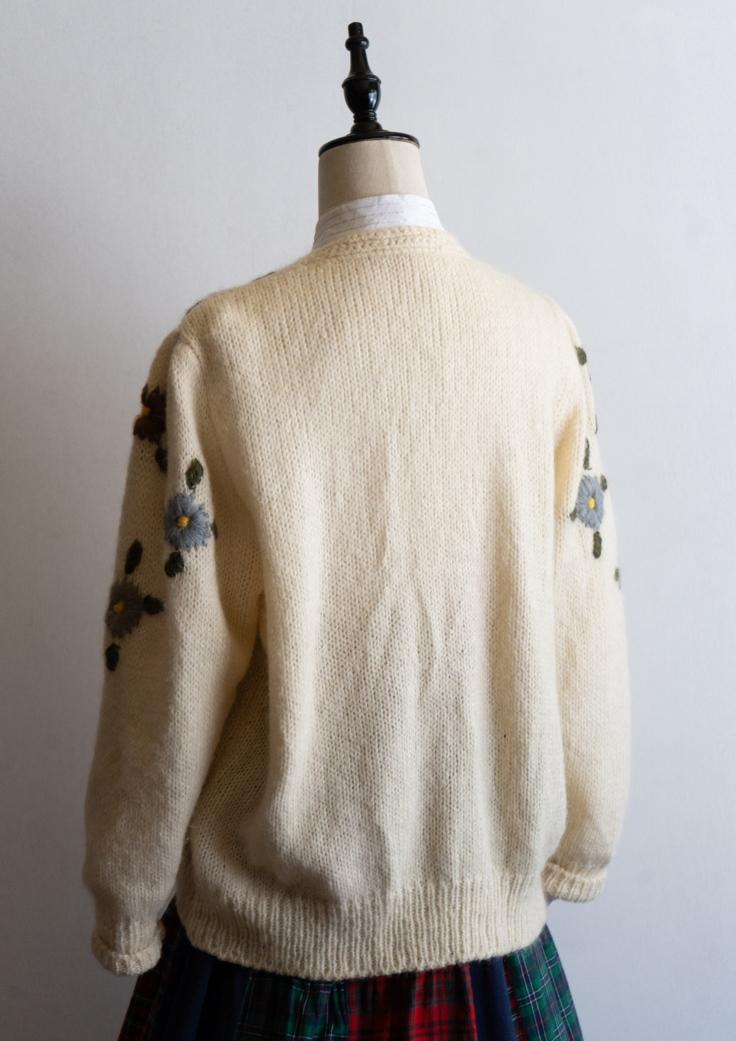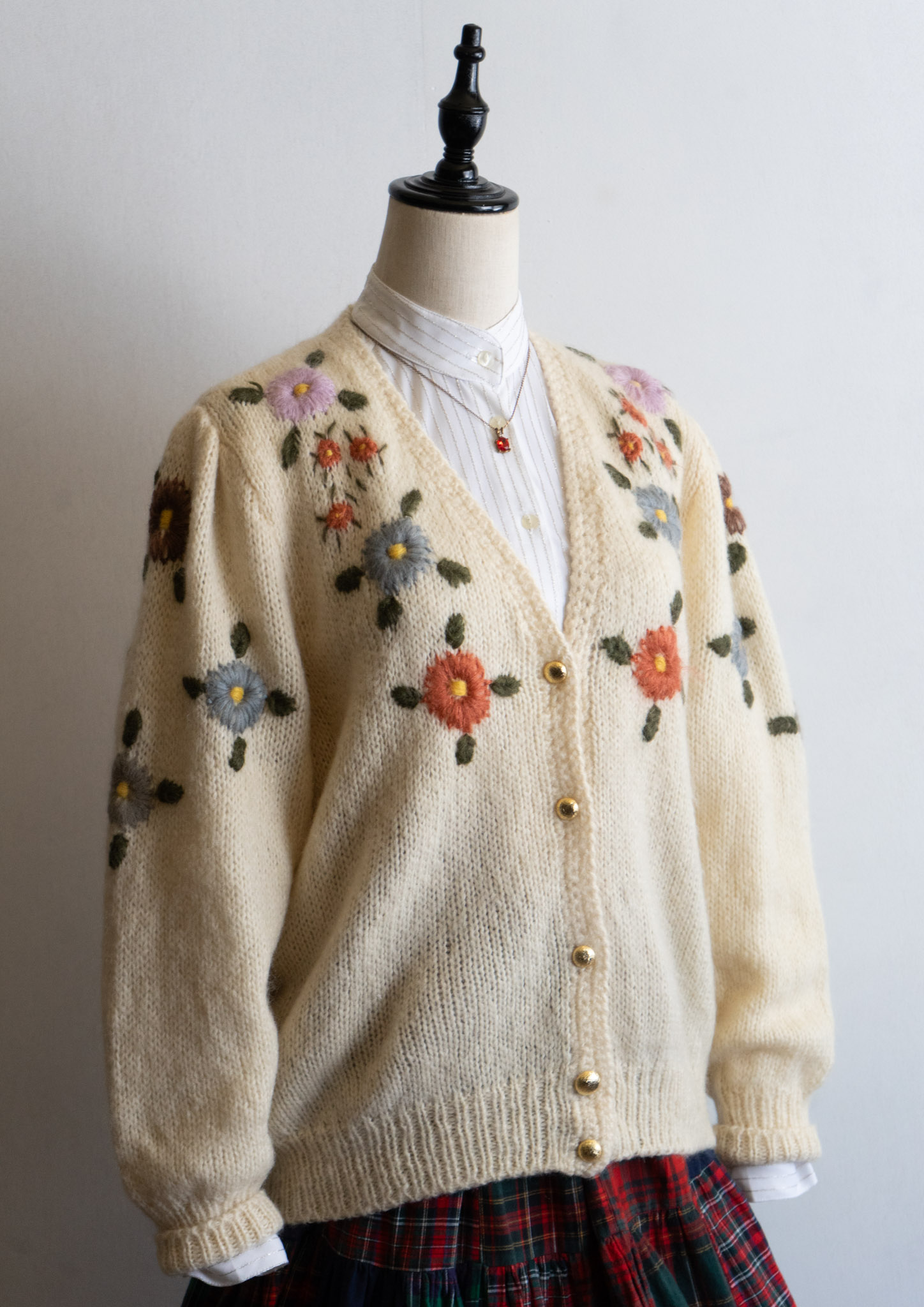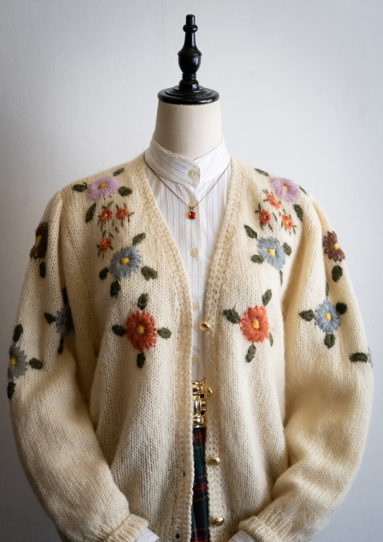 90's Italy Point Flower Knitting Ivory Mohair Cardigan