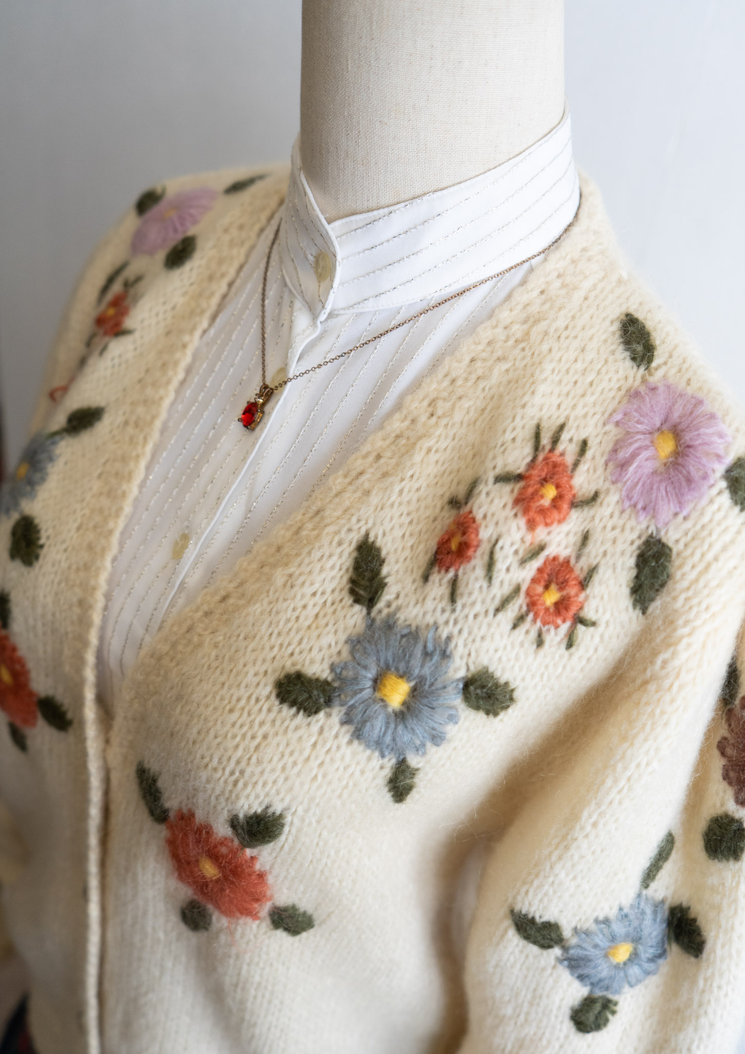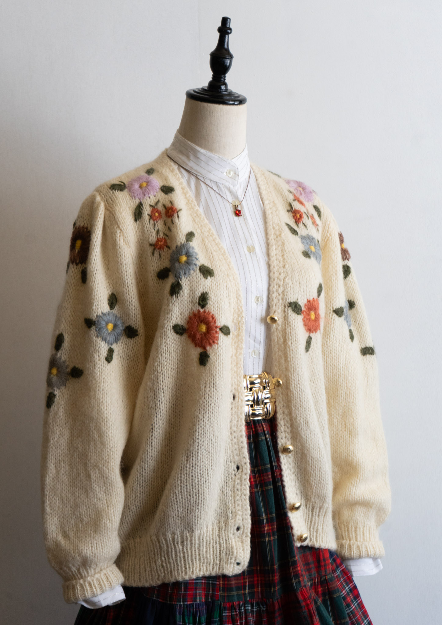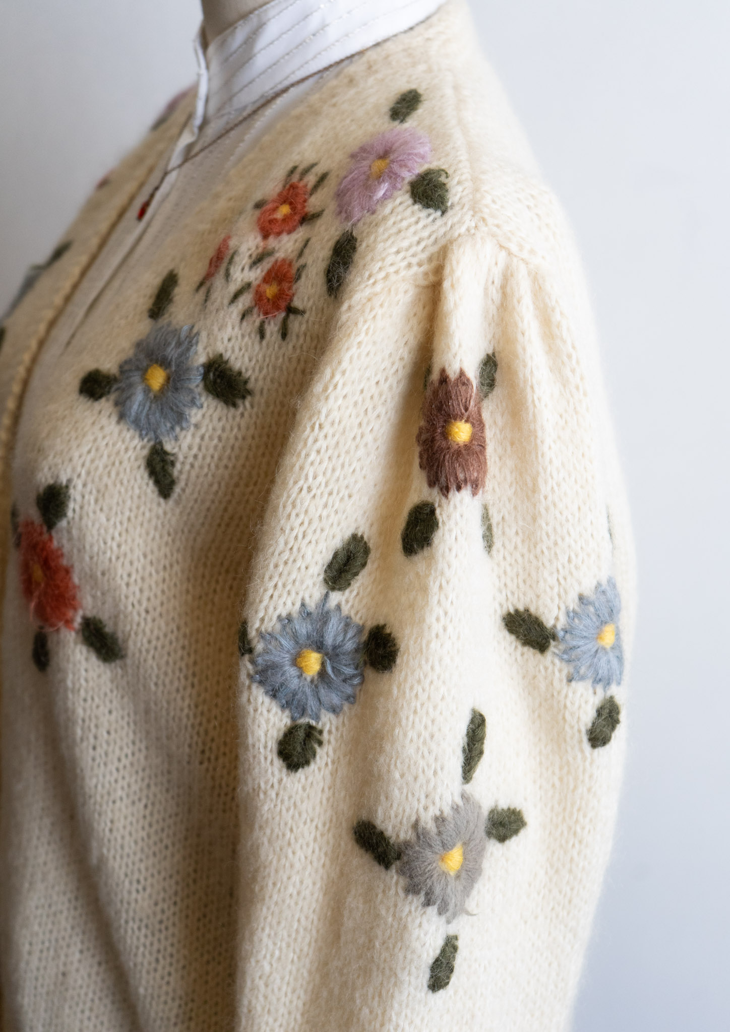 90's Italy Point Flower Knitting Ivory Mohair Cardigan