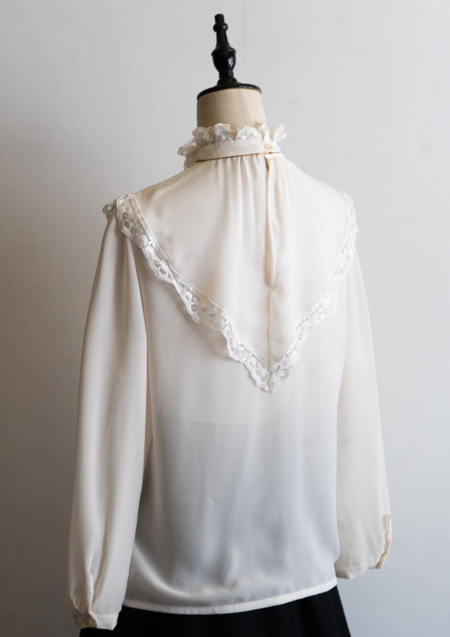 80's Jabot Like Collar Glossy Block Check Pattern Navy Blouse