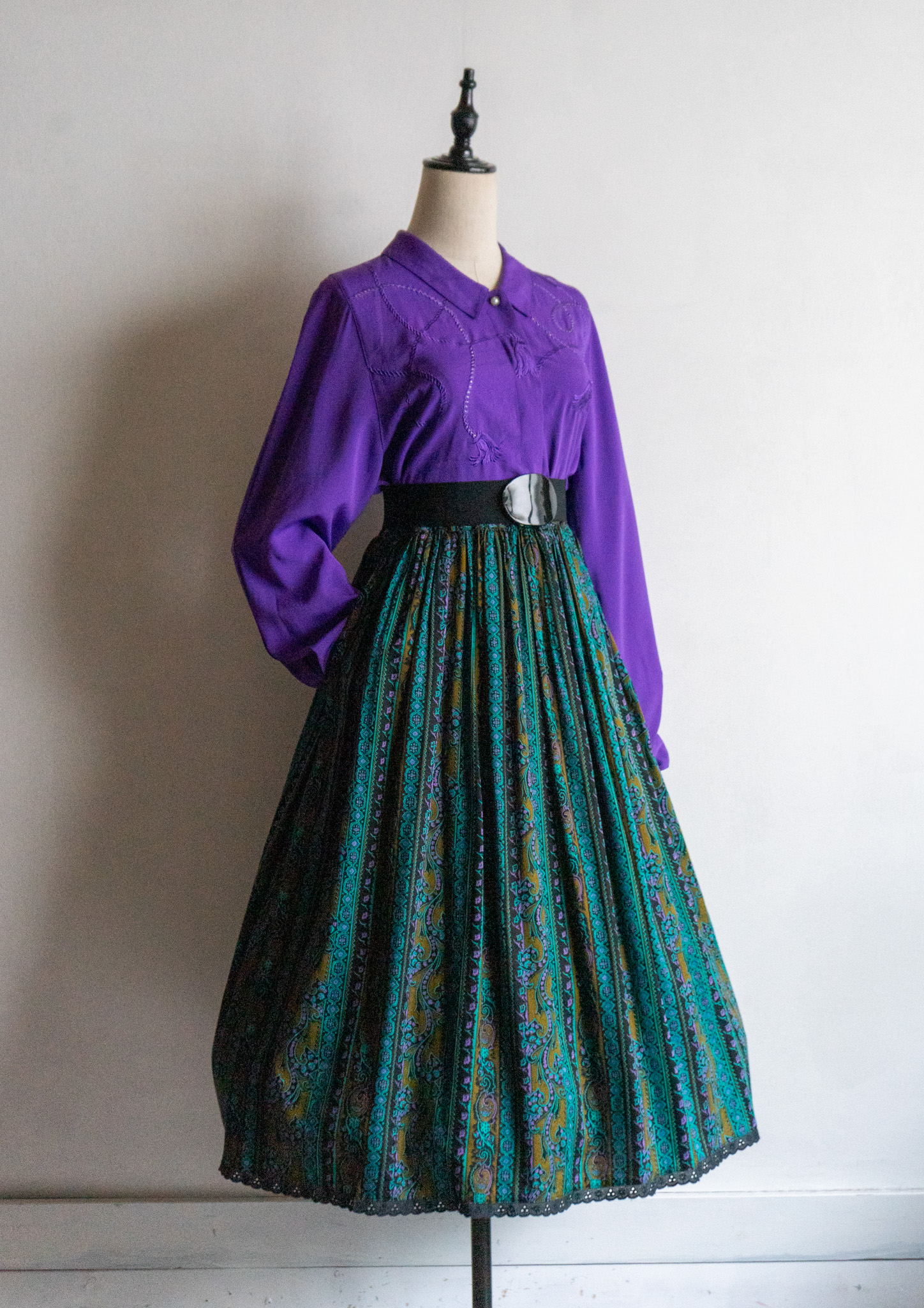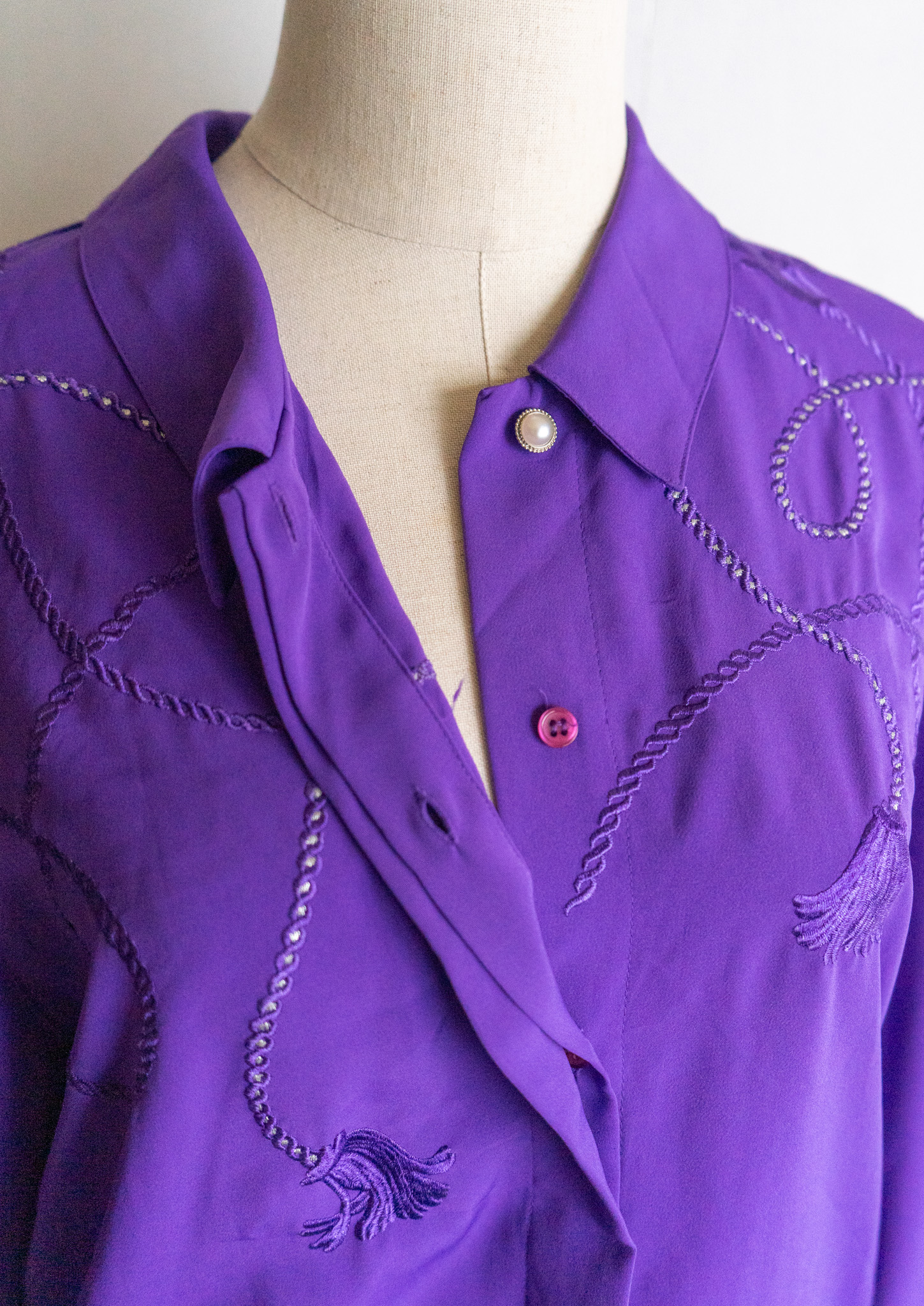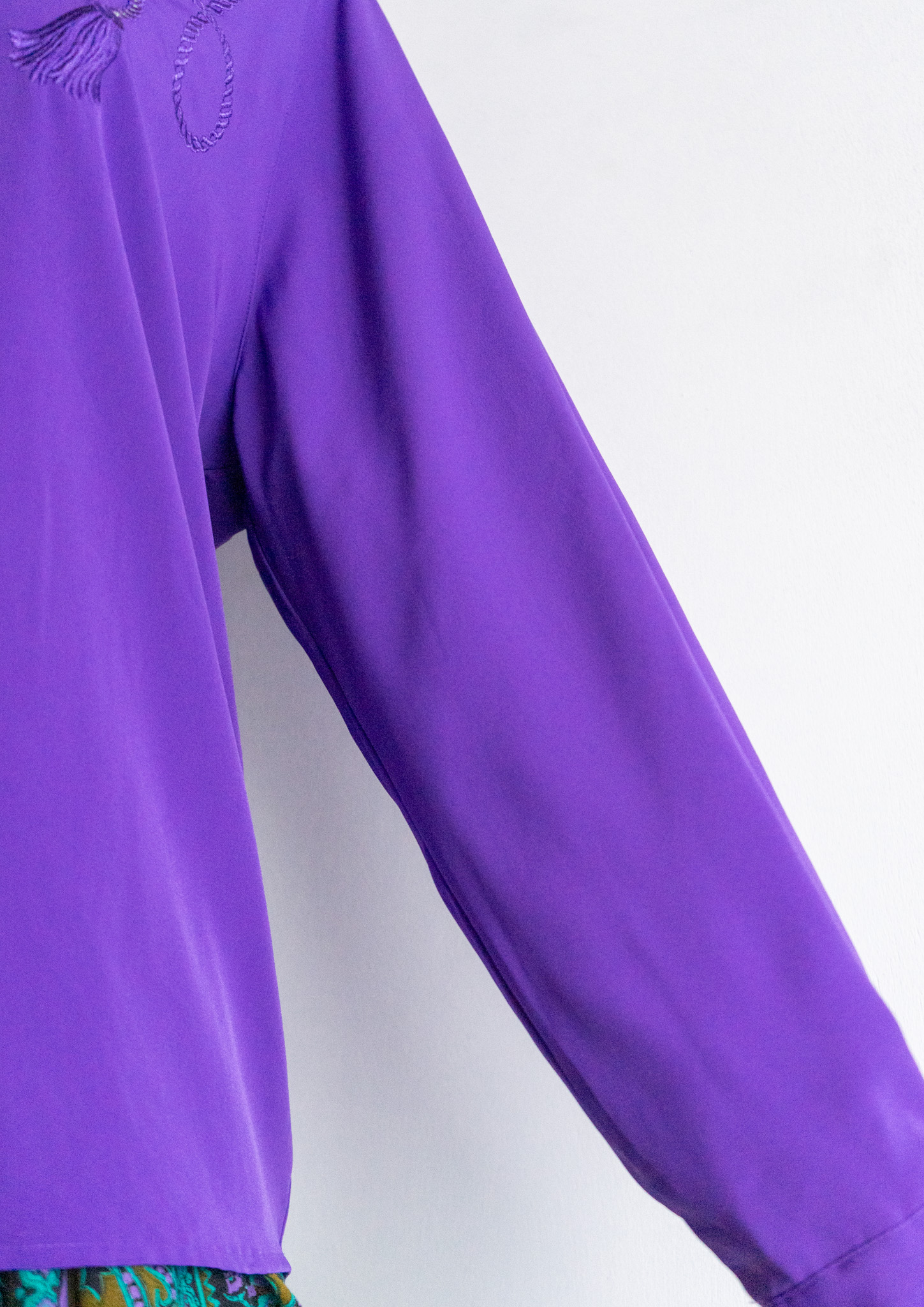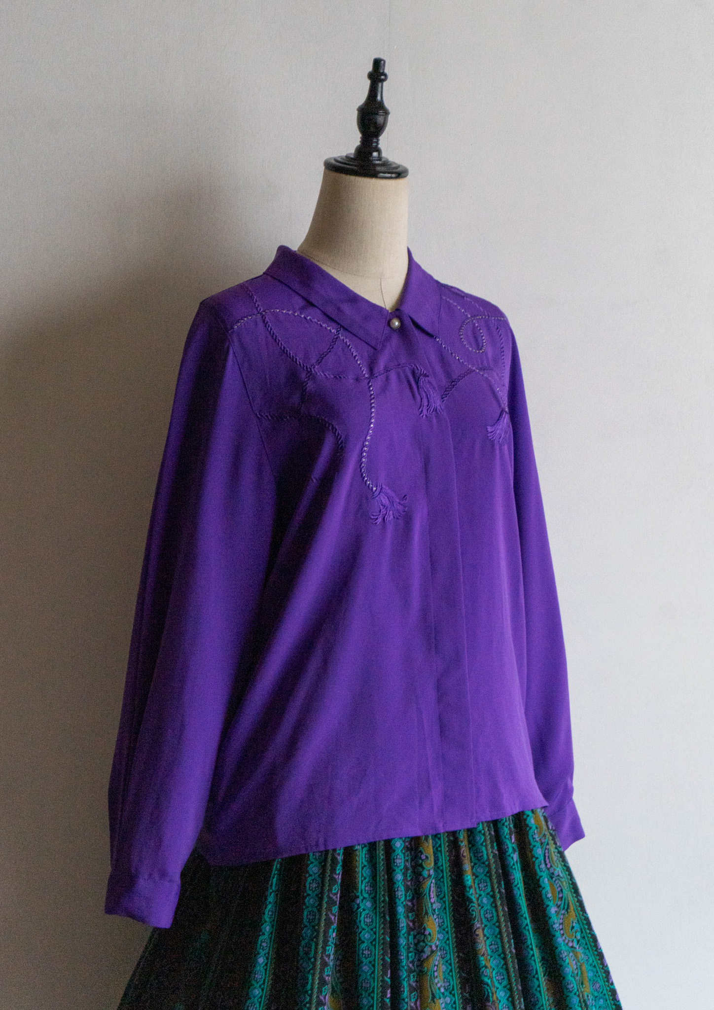 80's Tree Ring Pattern Frill Collar Purple Blouse