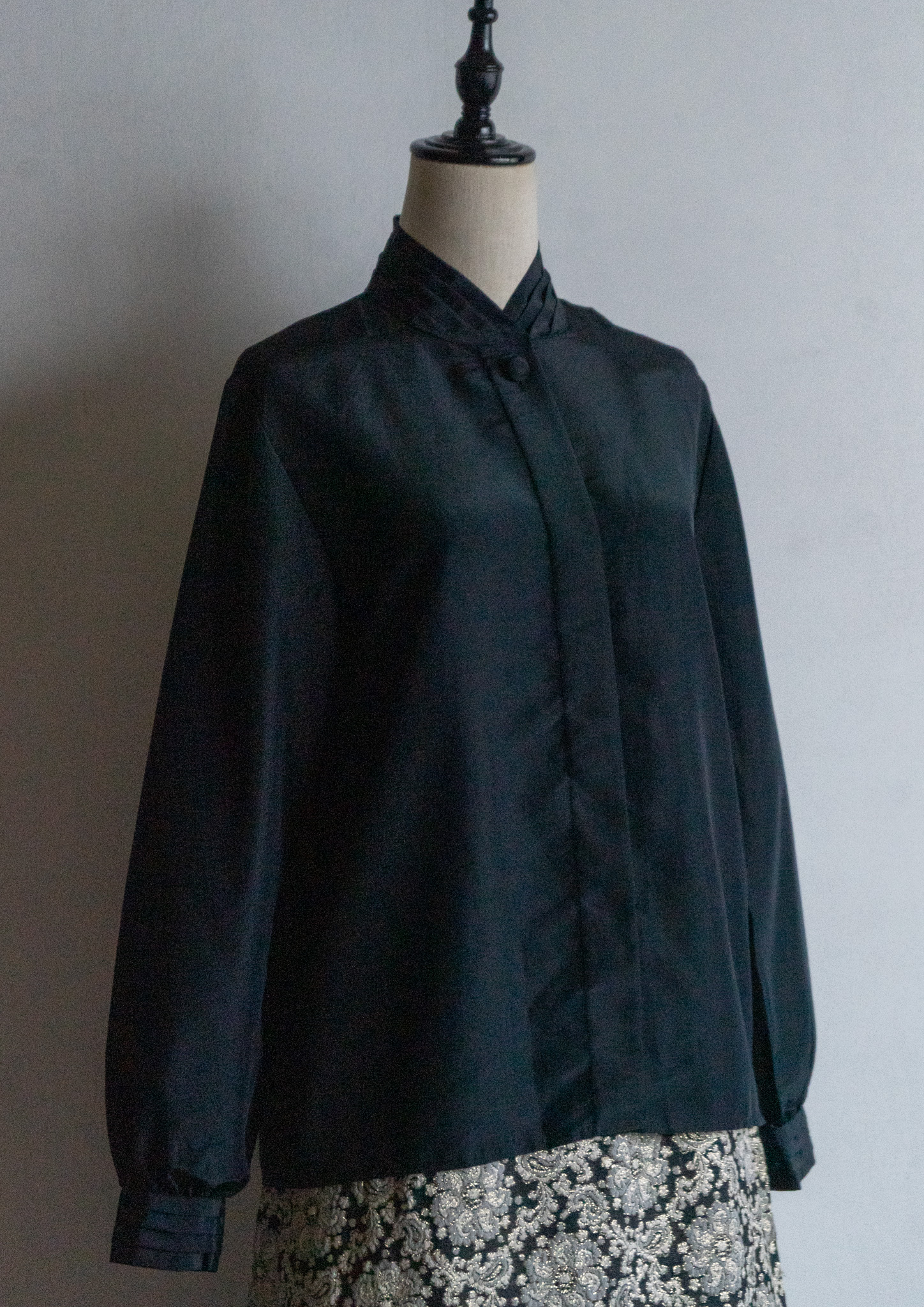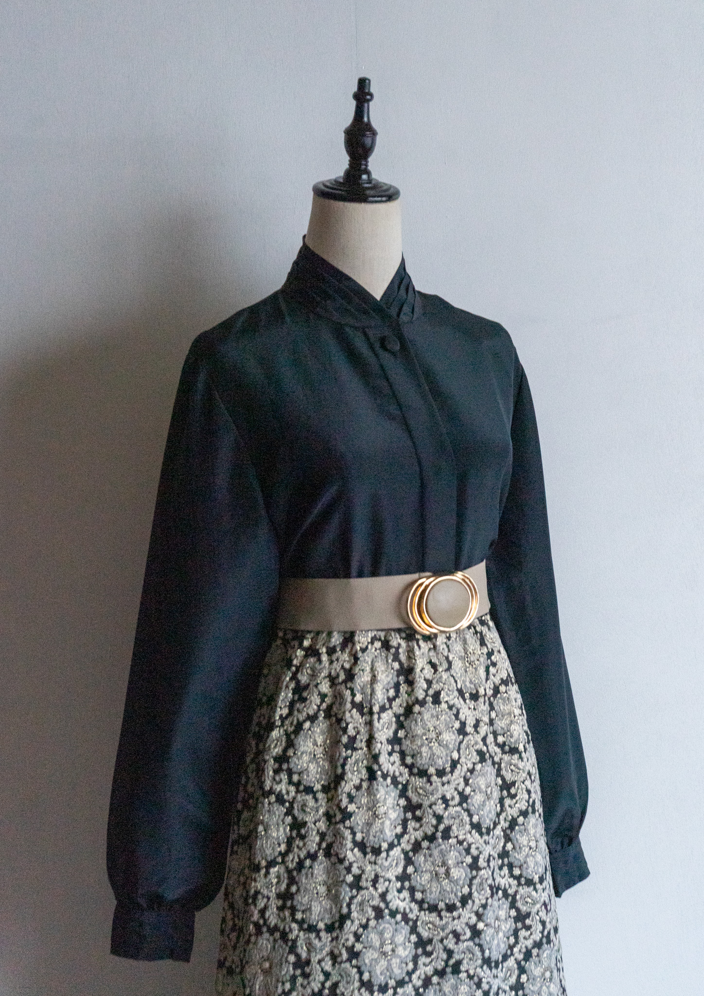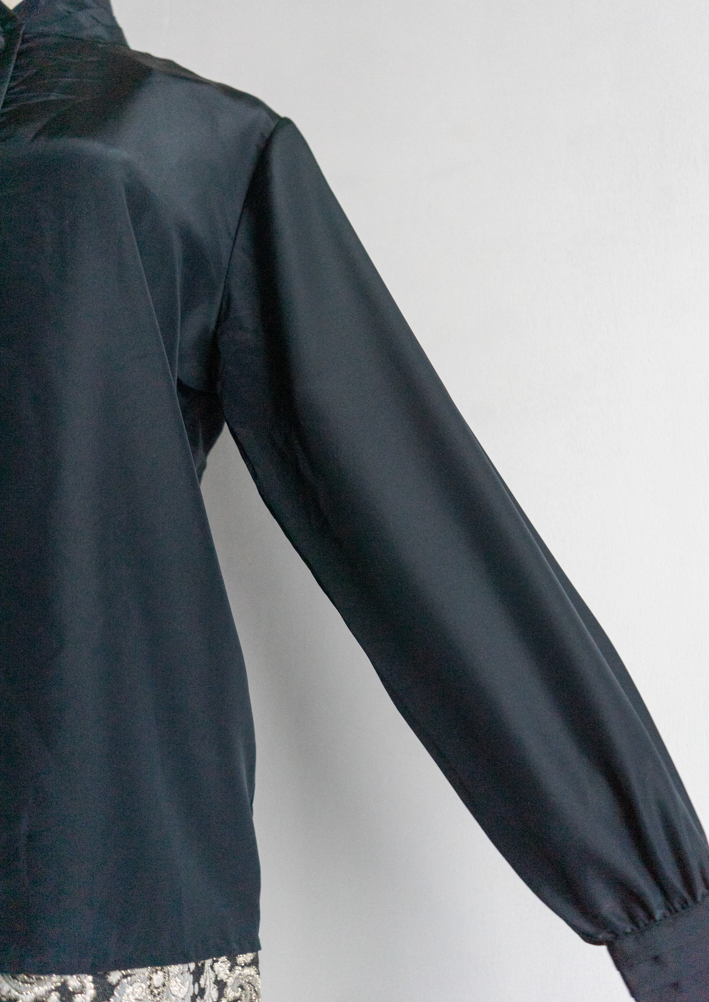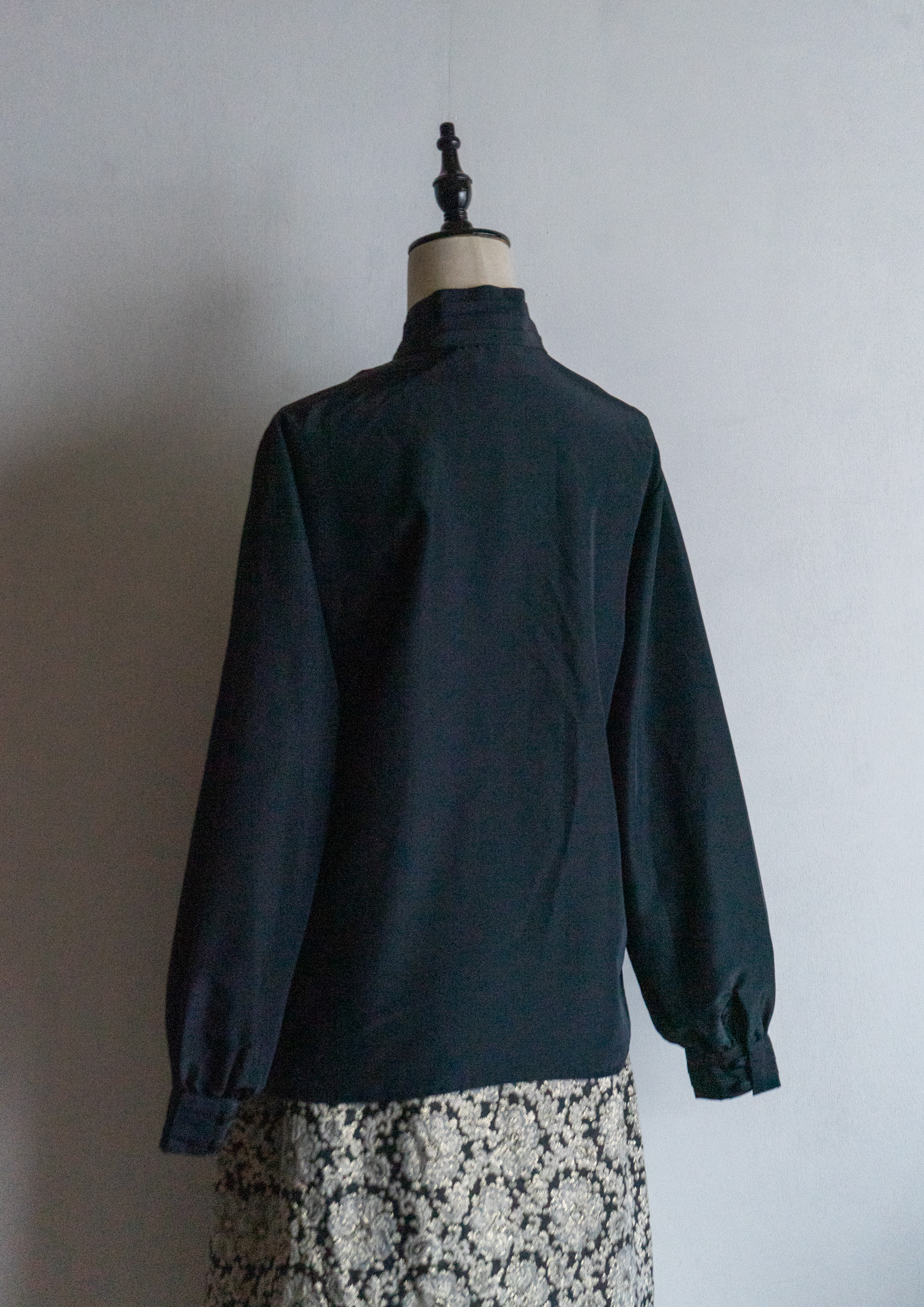 80's Jabot Like Collar Glossy Block Check Pattern Navy Blouse