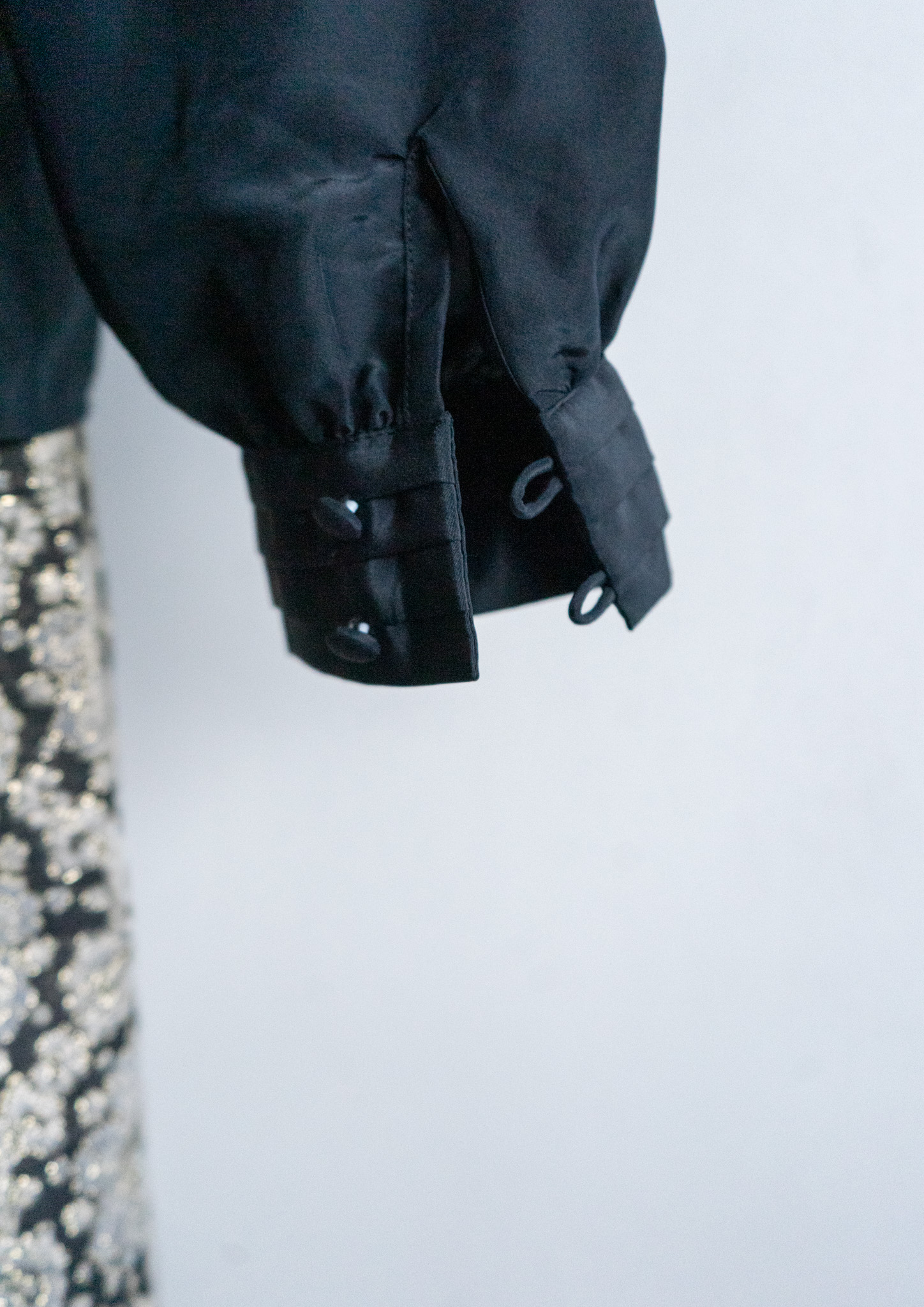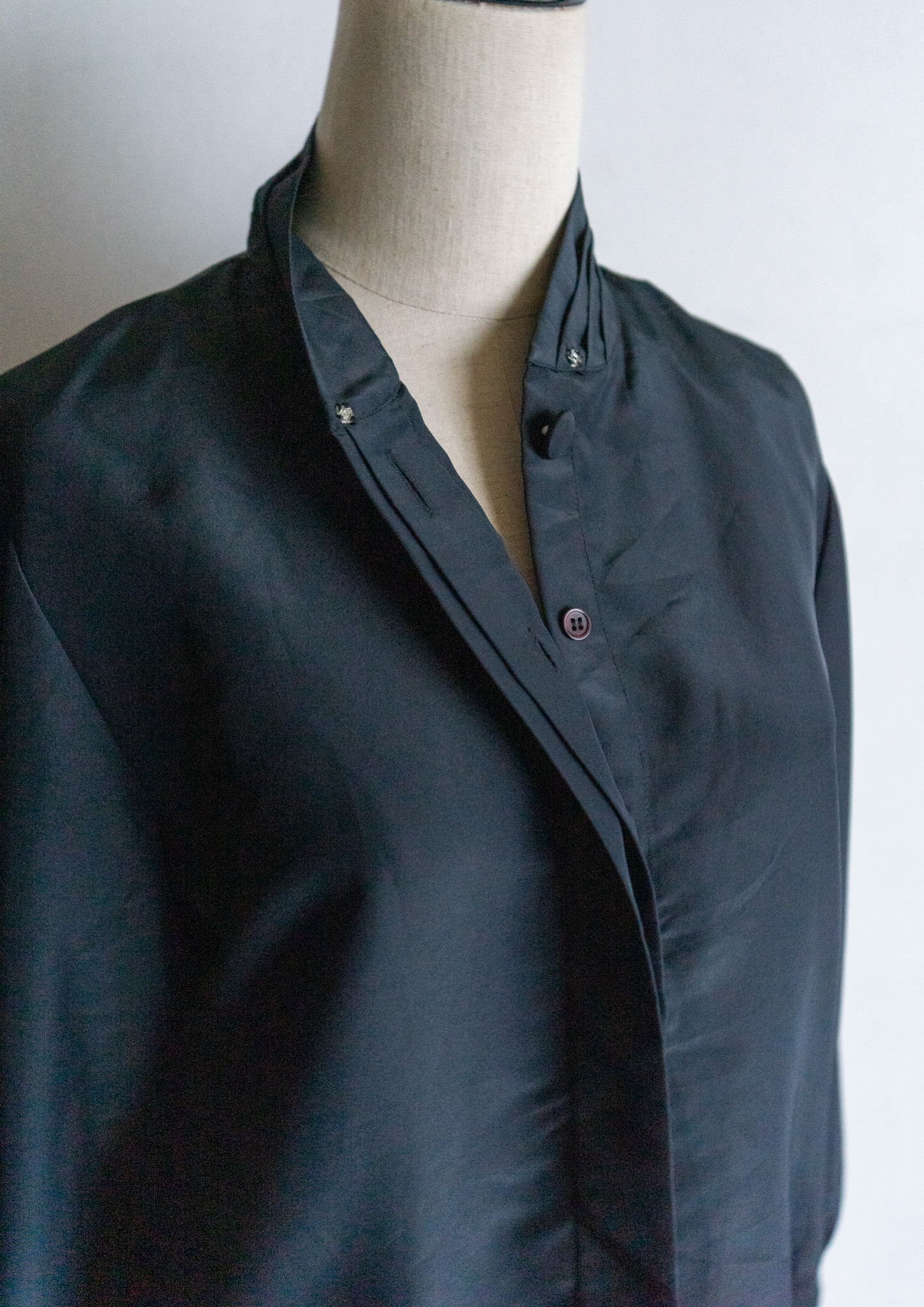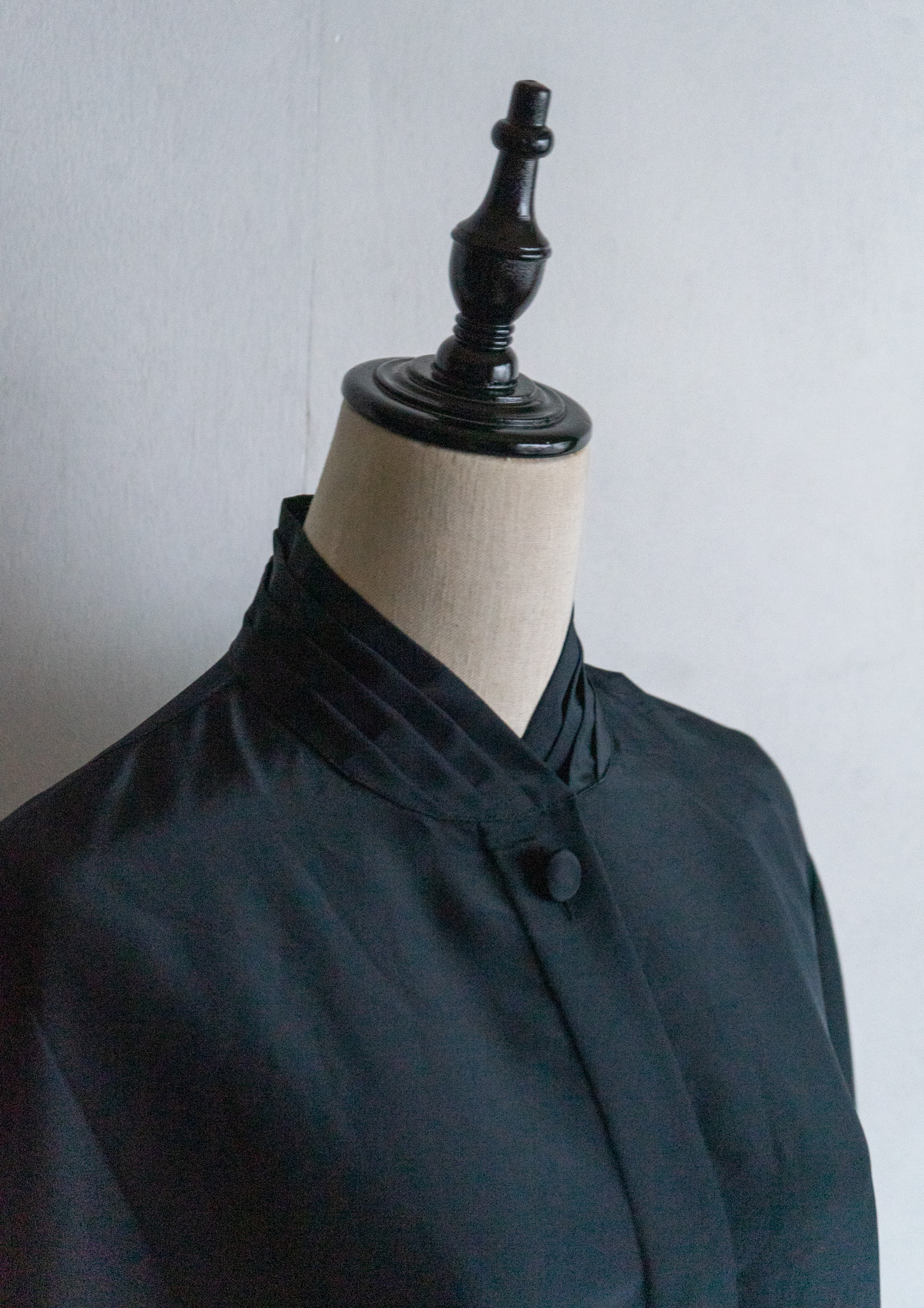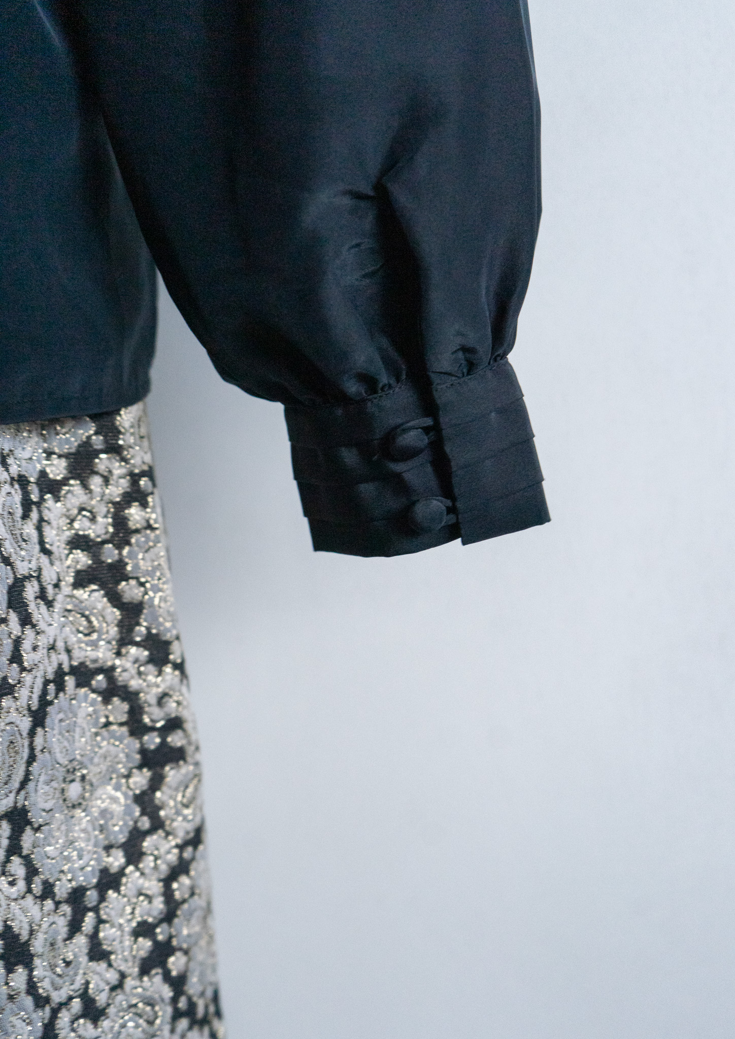 80's Jabot Like Collar Glossy Block Check Pattern Navy Blouse