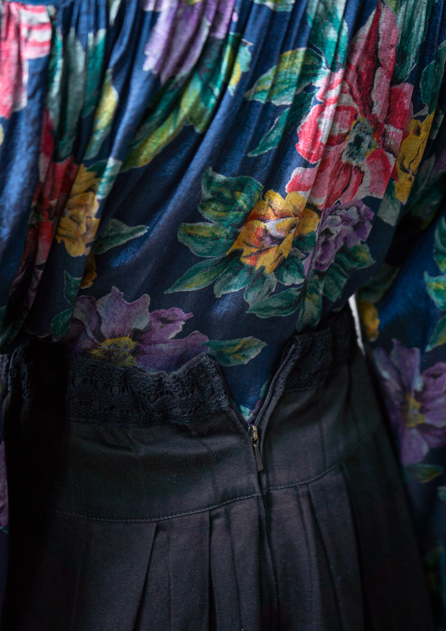 90's Stripe × Small Flower Pattern Navy Tyrol Skirt