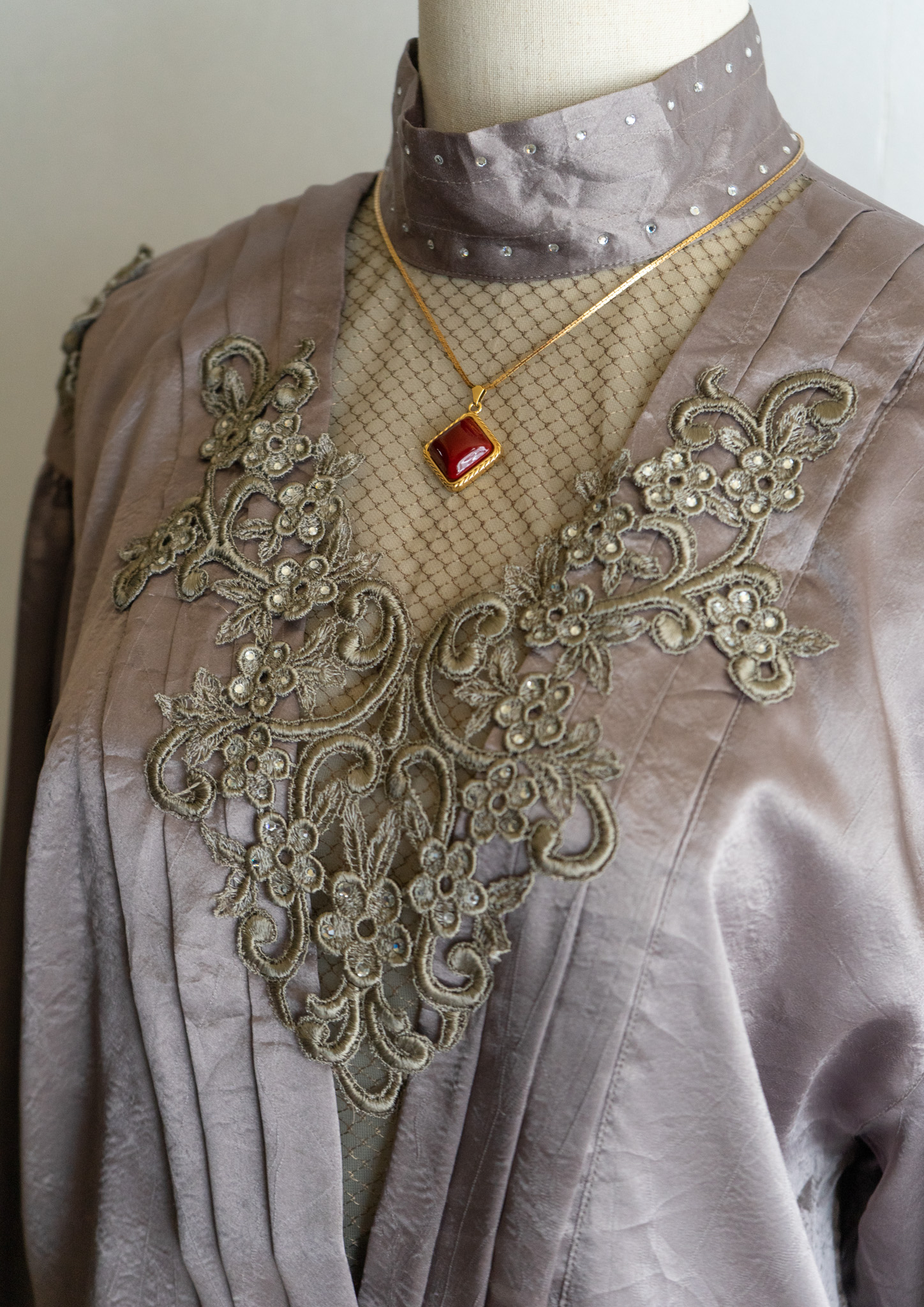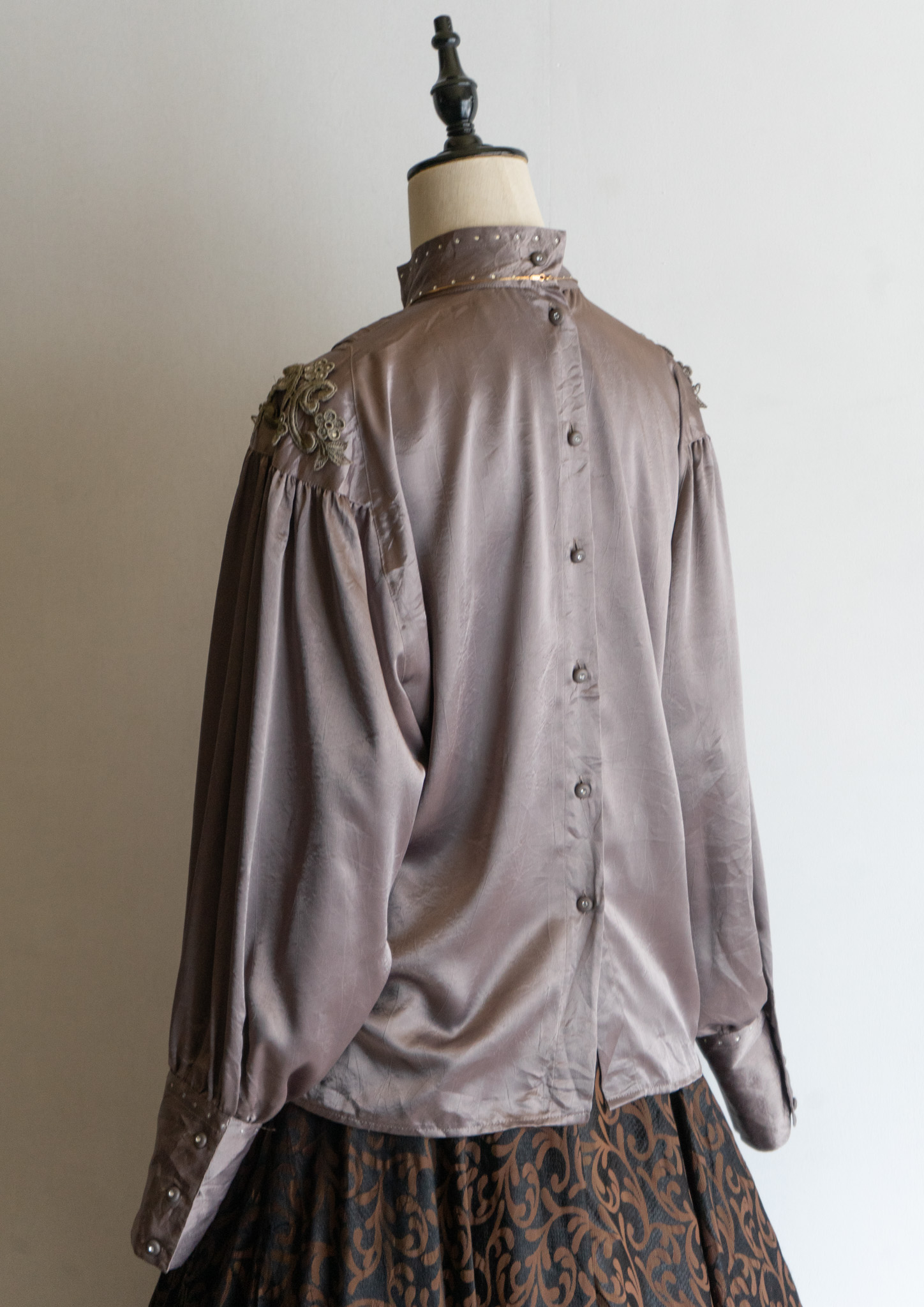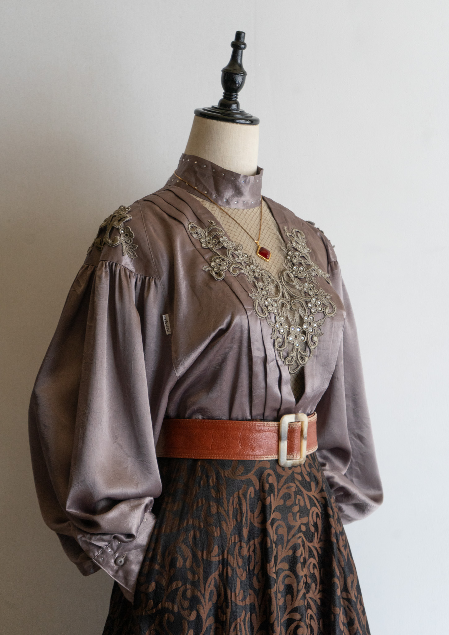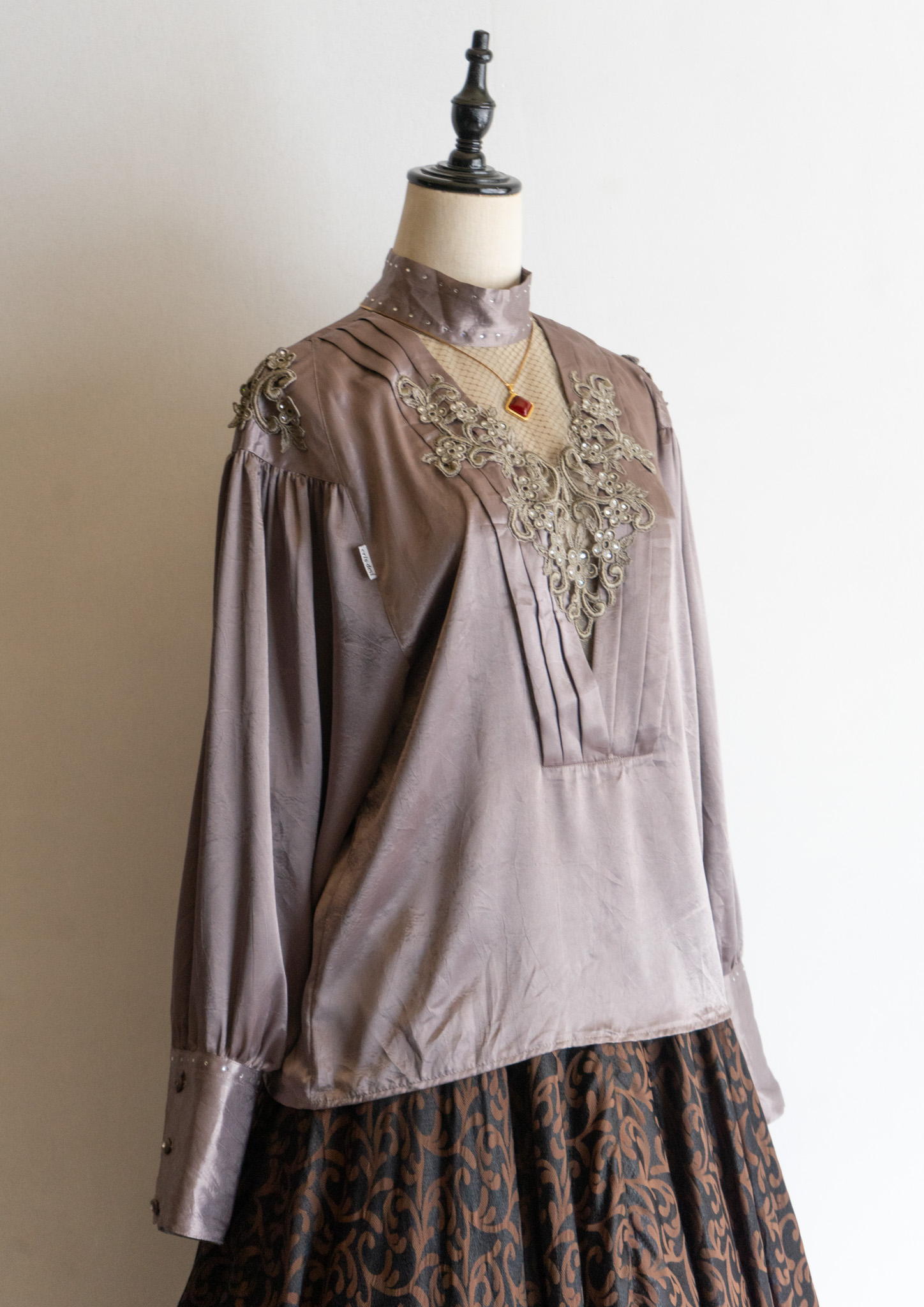 80's W-Germany Flower Lace × Bijou Design Glossy Khaki Blouse