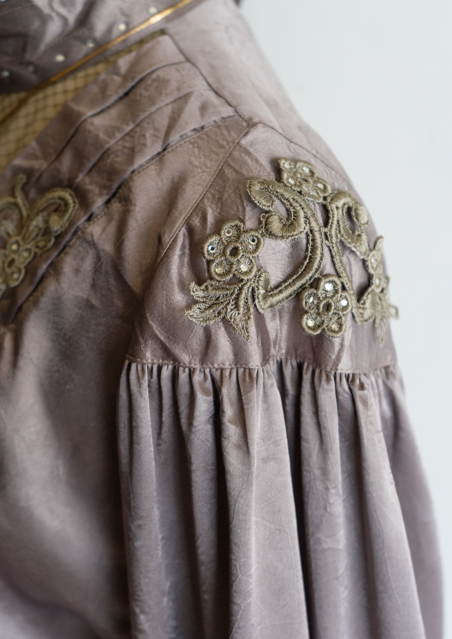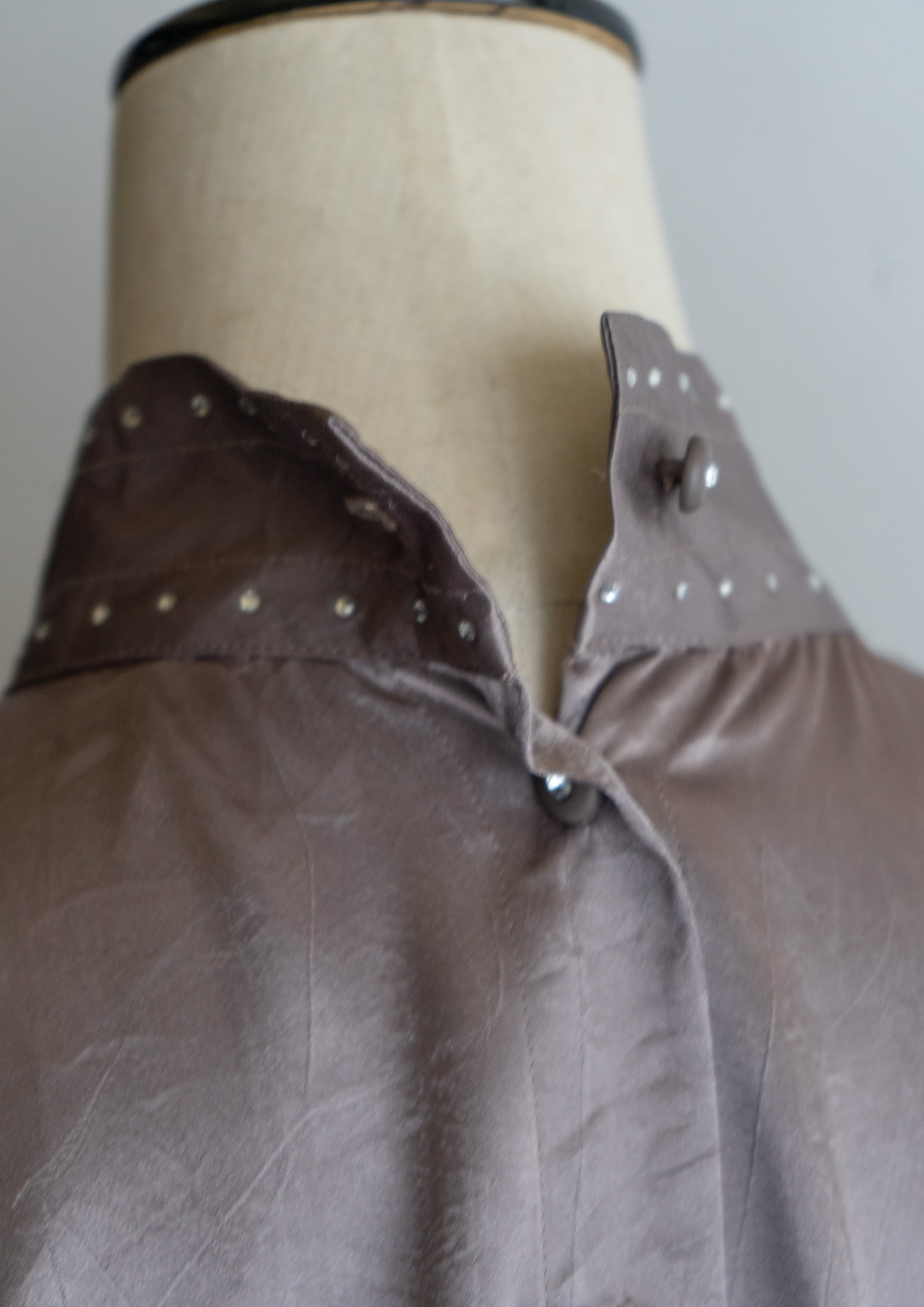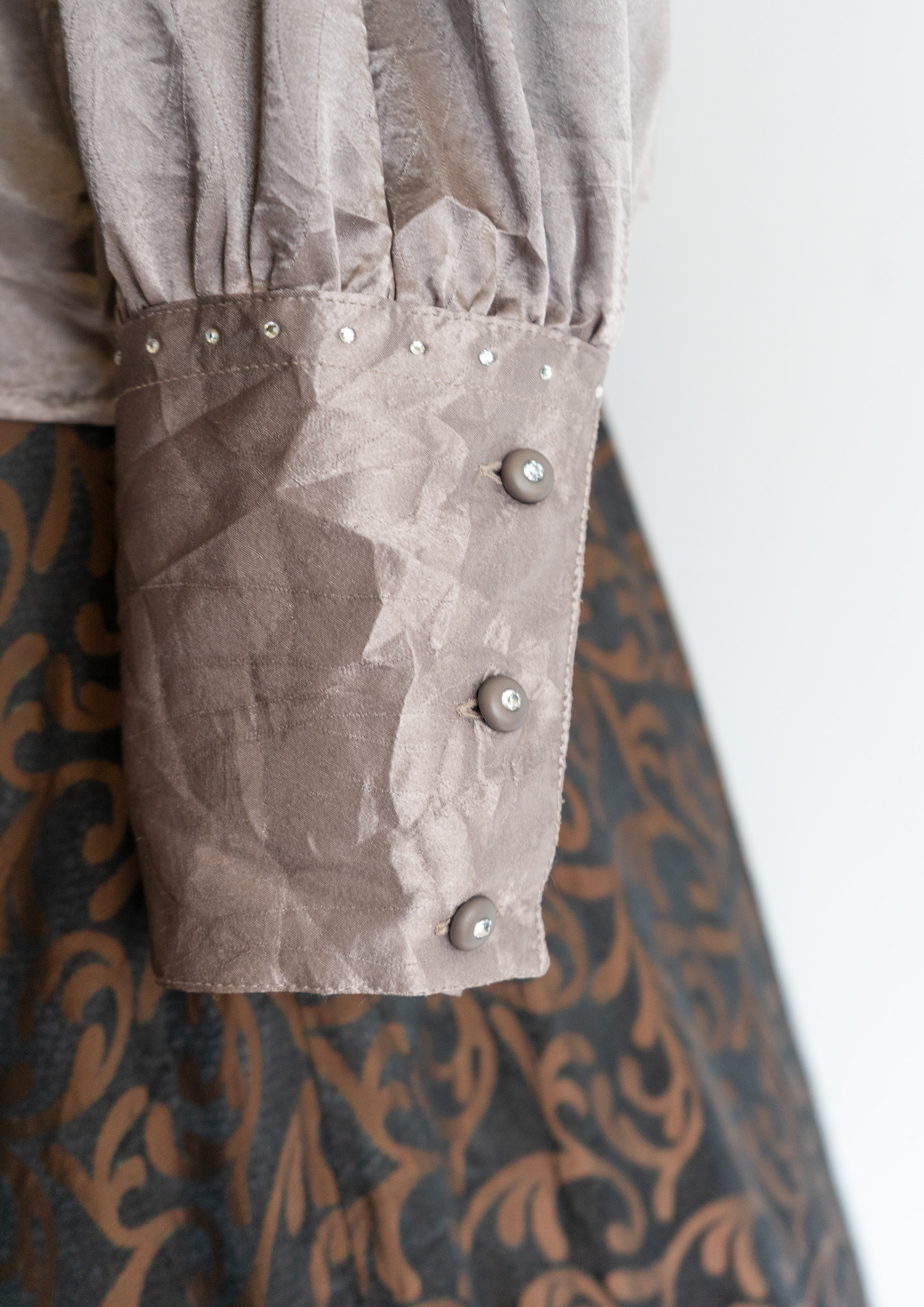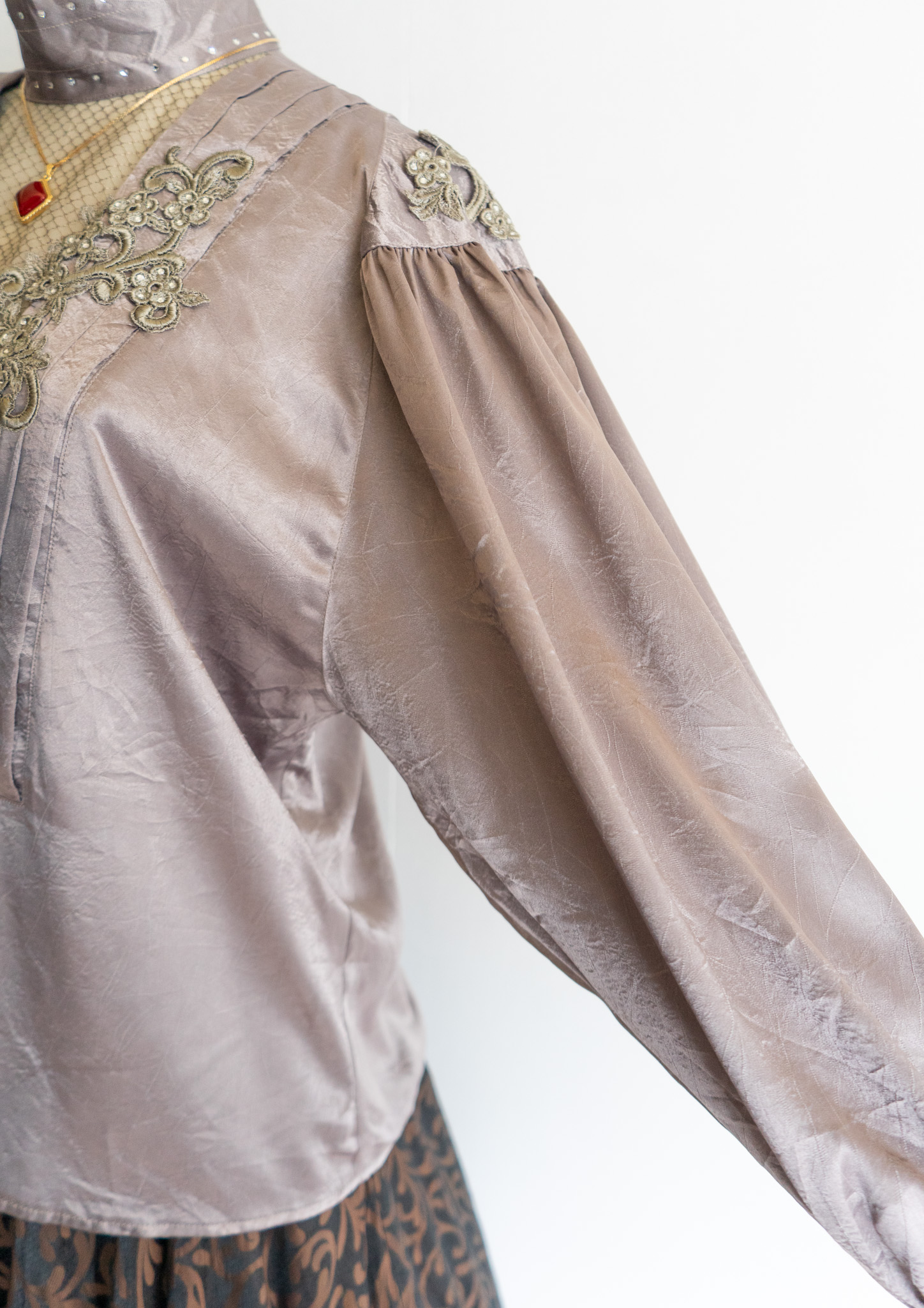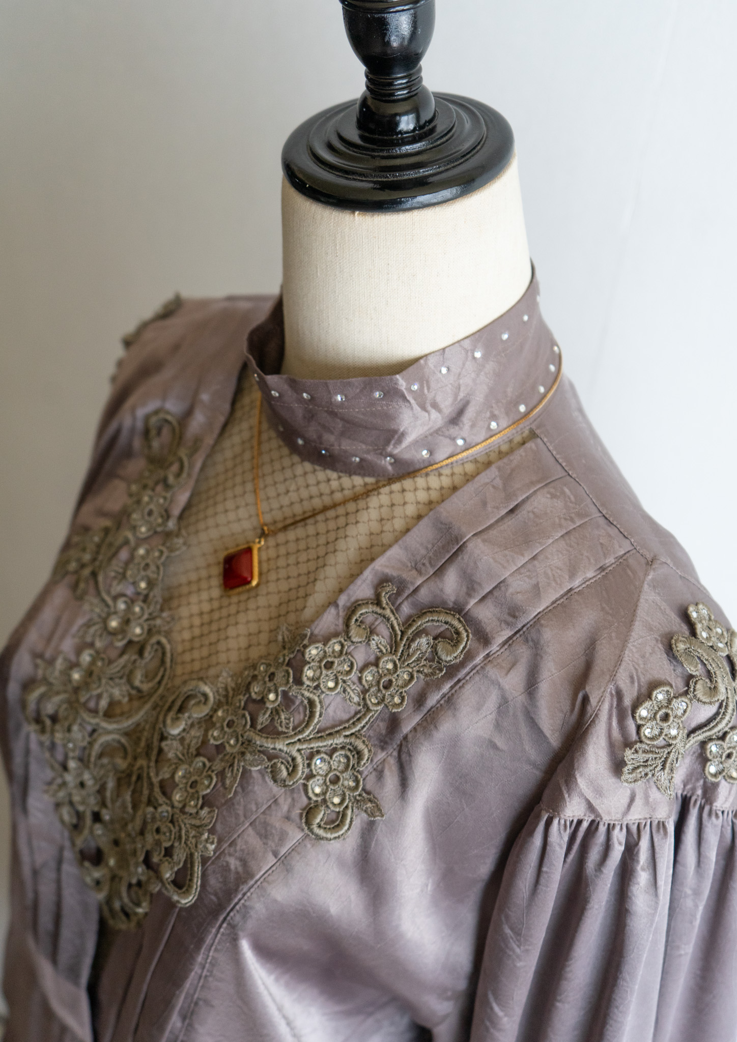 80's W-Germany Flower Lace × Bijou Design Glossy Khaki Blouse