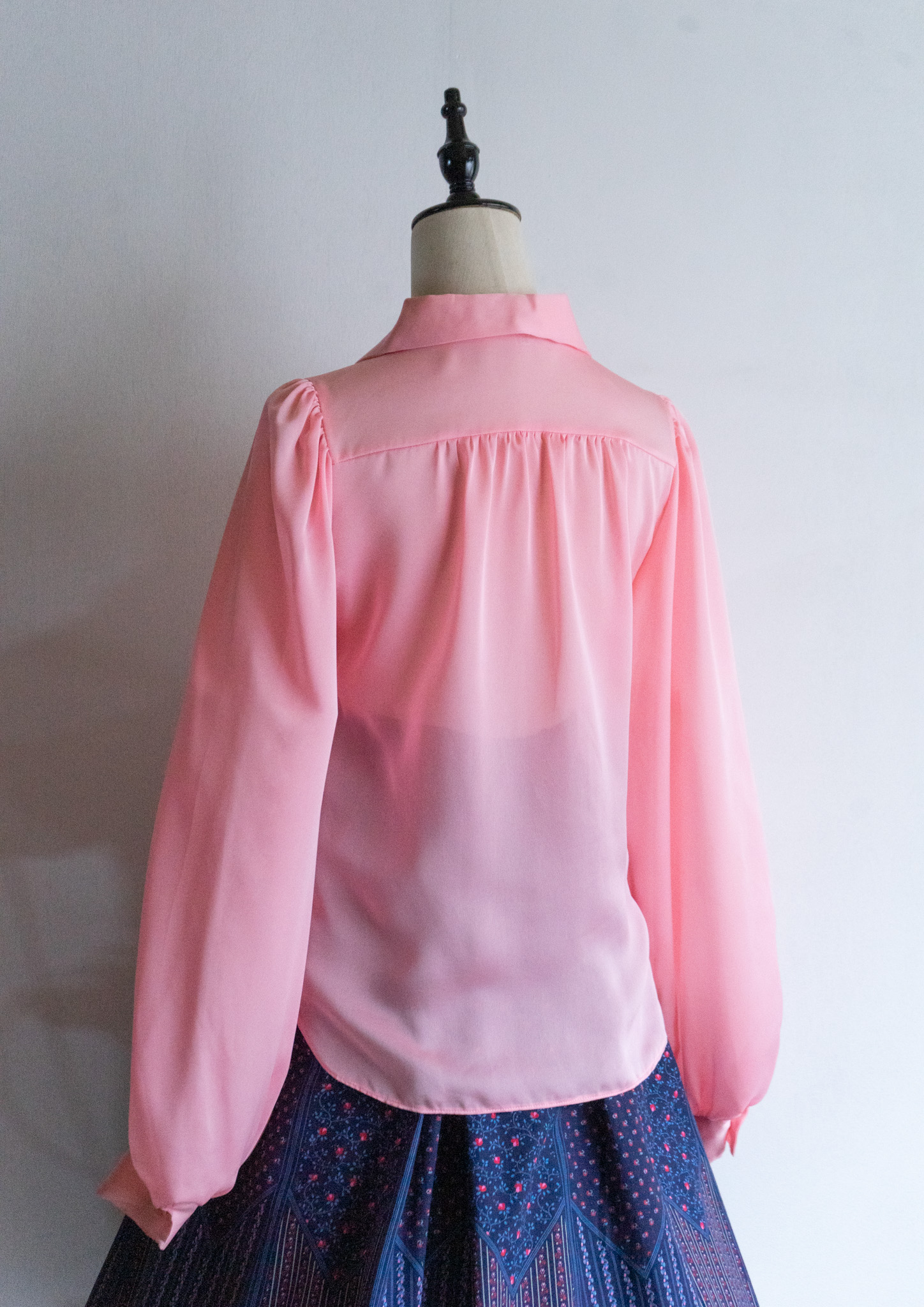 80's Jabot Like Collar Glossy Block Check Pattern Navy Blouse
