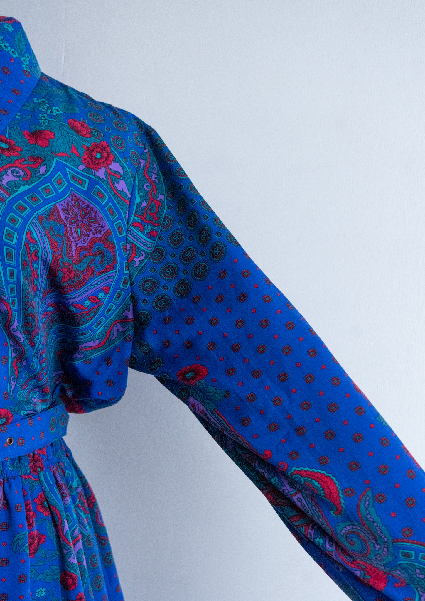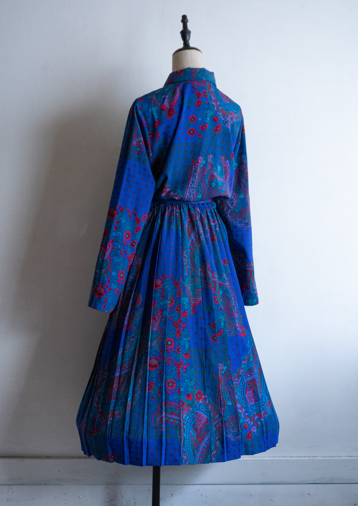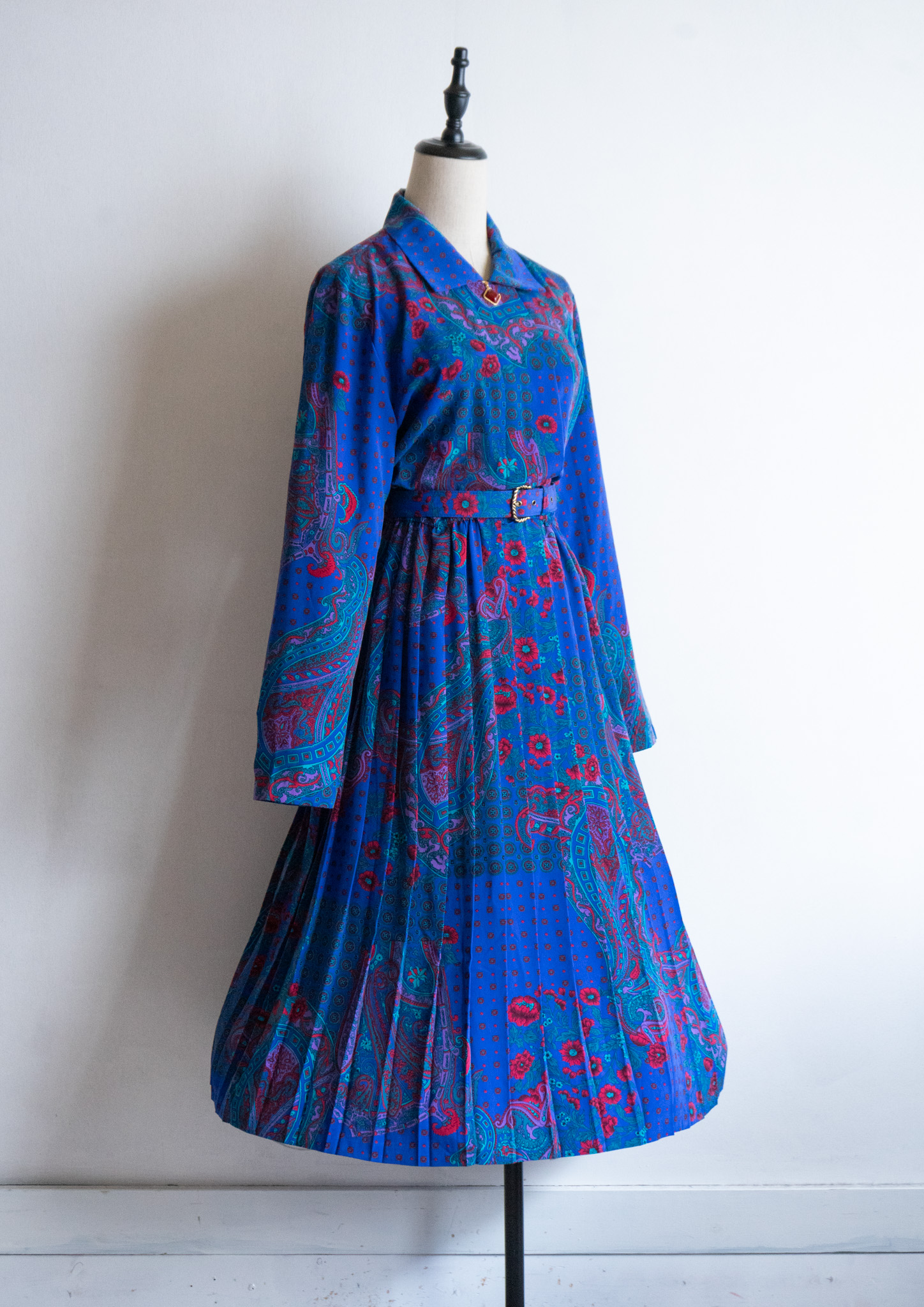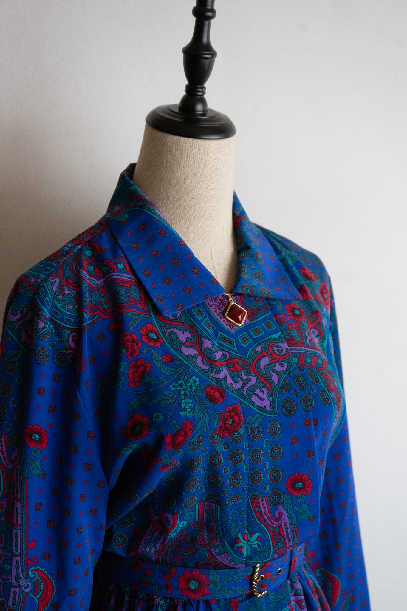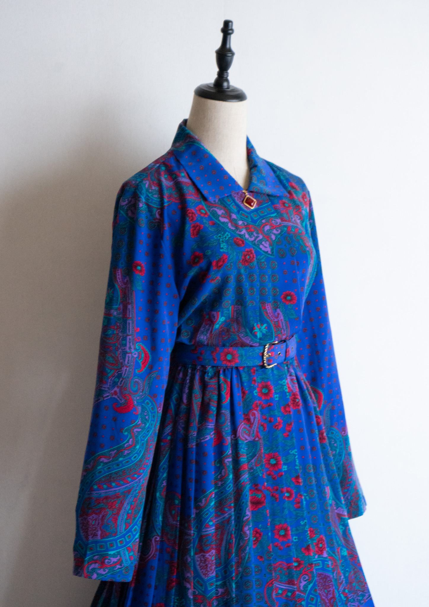90's Canada LESLIE FAY Red Flower × Paisley Pattern Blue Dress