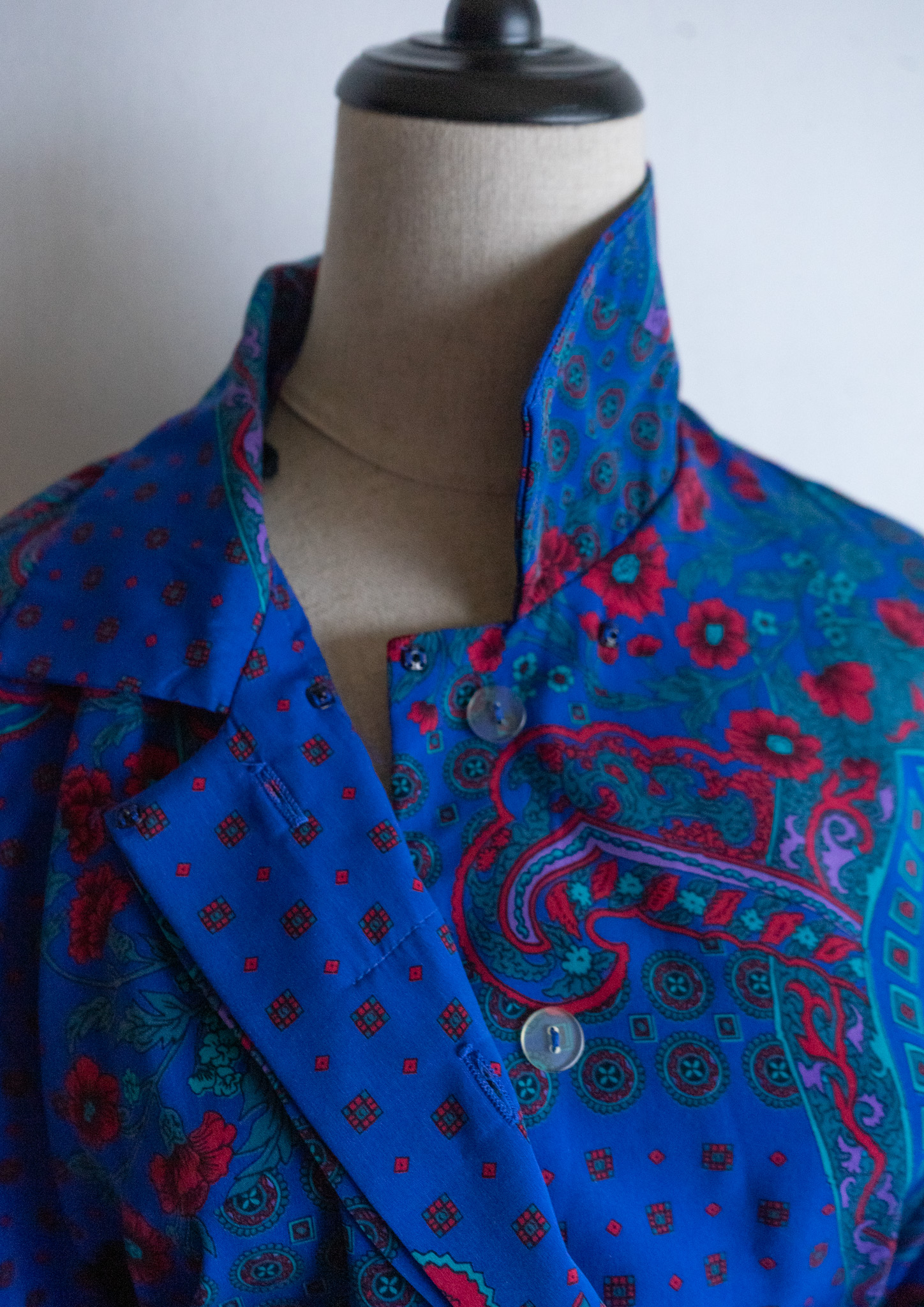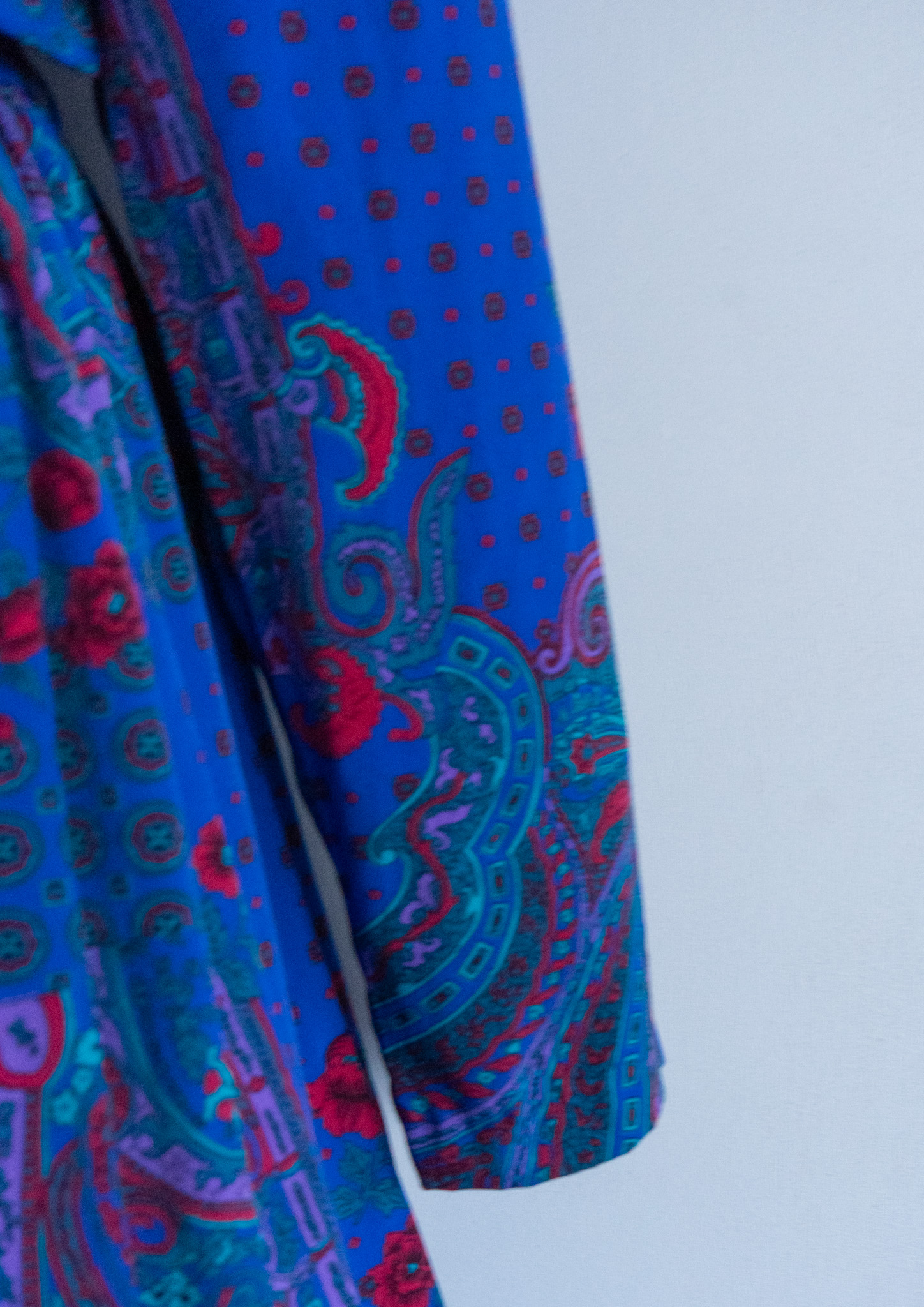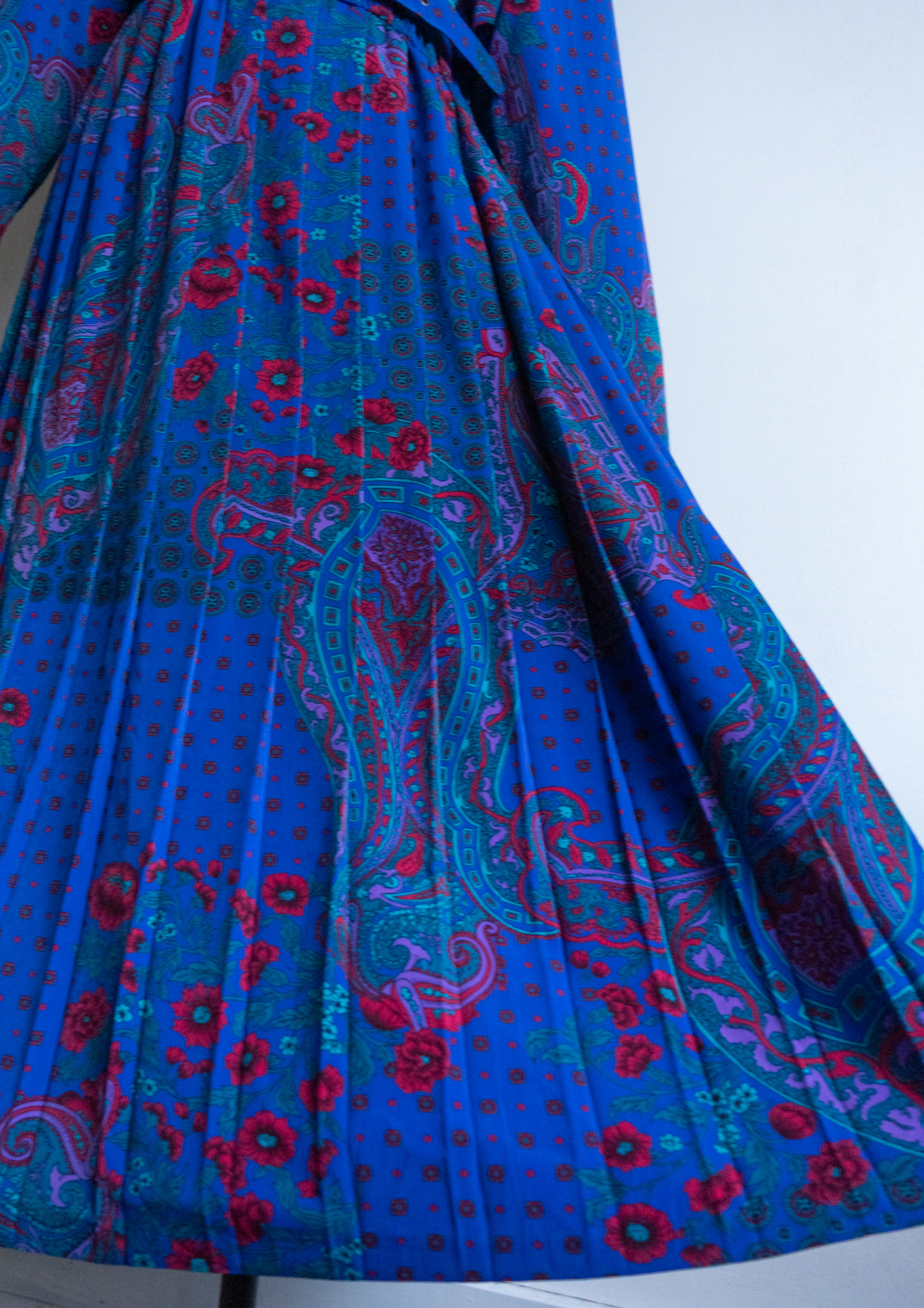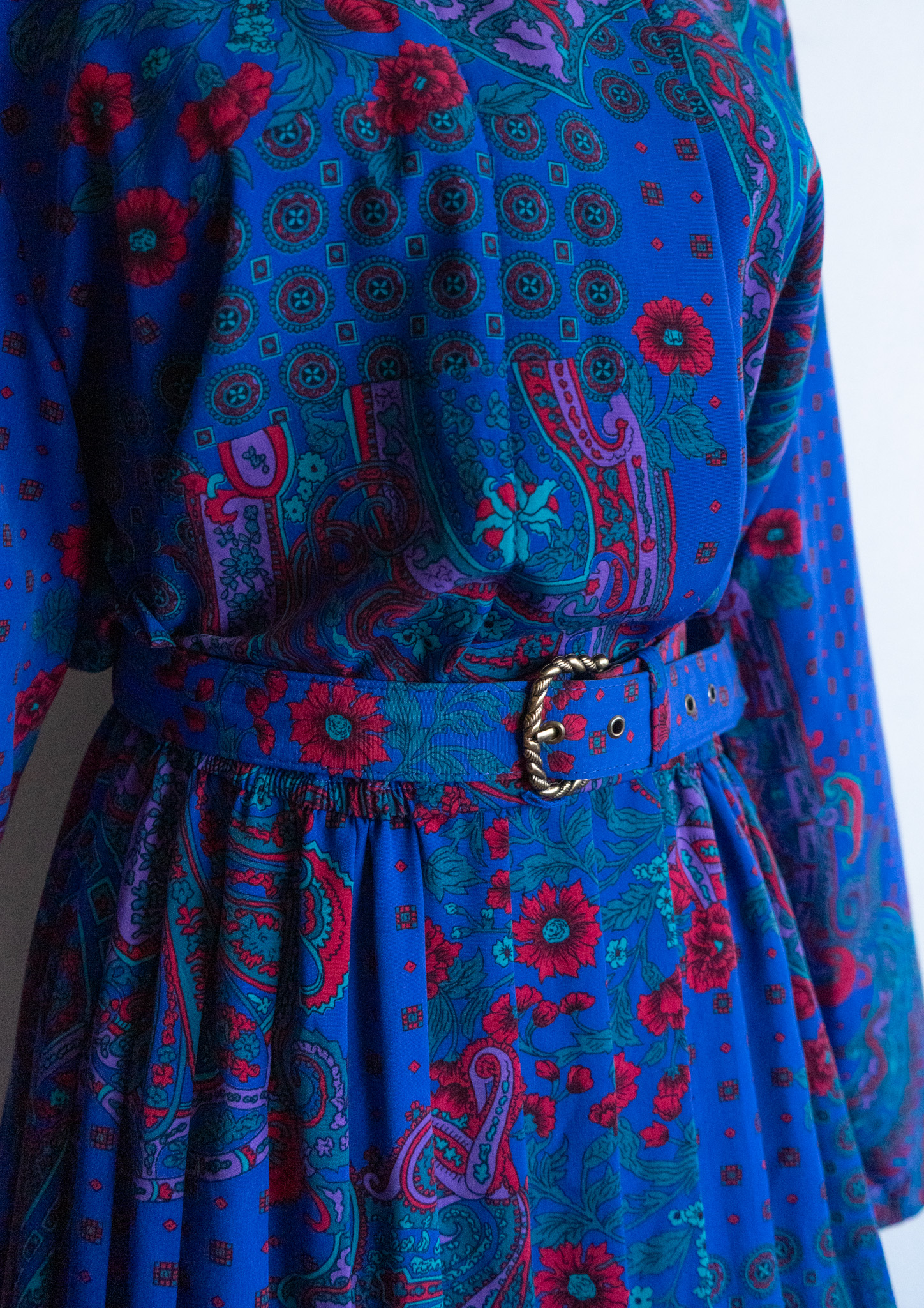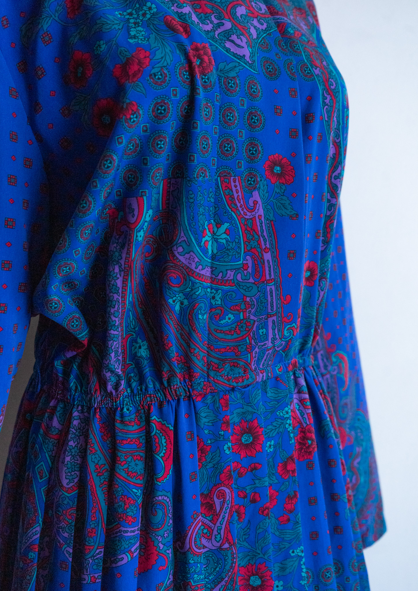 90's Canada LESLIE FAY Red Flower × Paisley Pattern Blue Dress