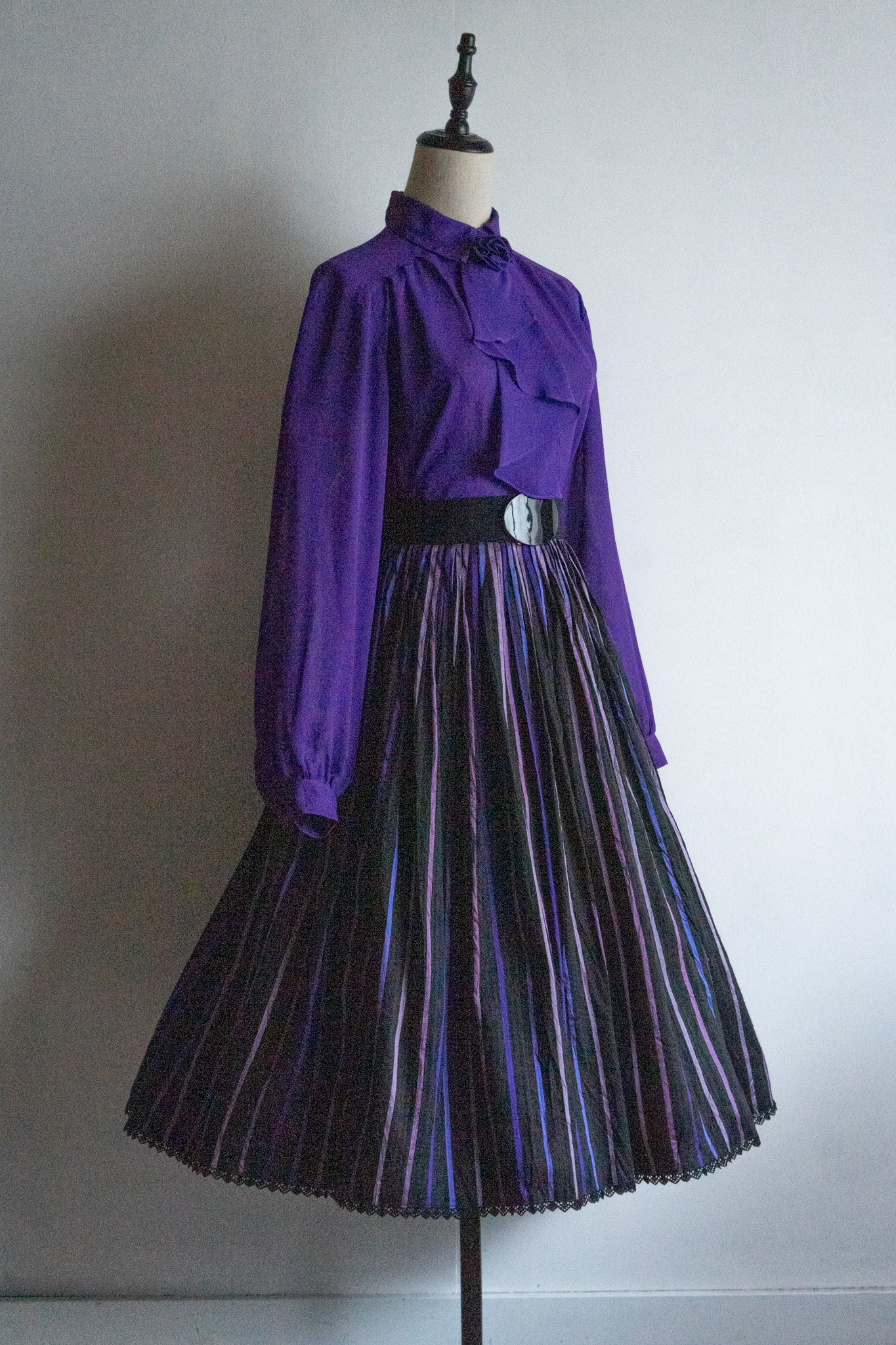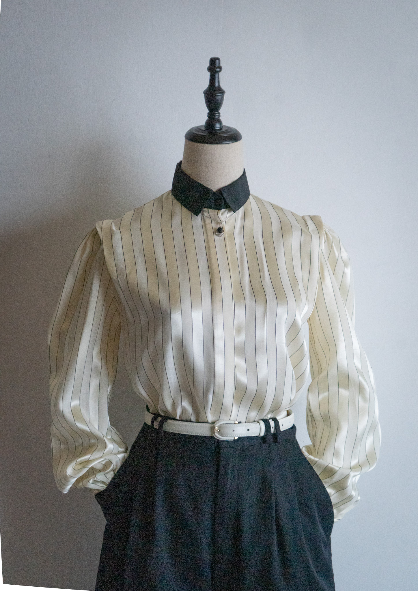 70's USA Glossy Stripe × Dot Pattern Bow-tie Ivory Blouse